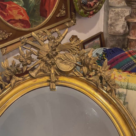 Beneath the golden glow of this 19th-century French giltwood mirror, one can almost imagine the flicker of candlelight reflected in a Parisian salon, the rustle of silk gowns, and the elegance of soirées long past.