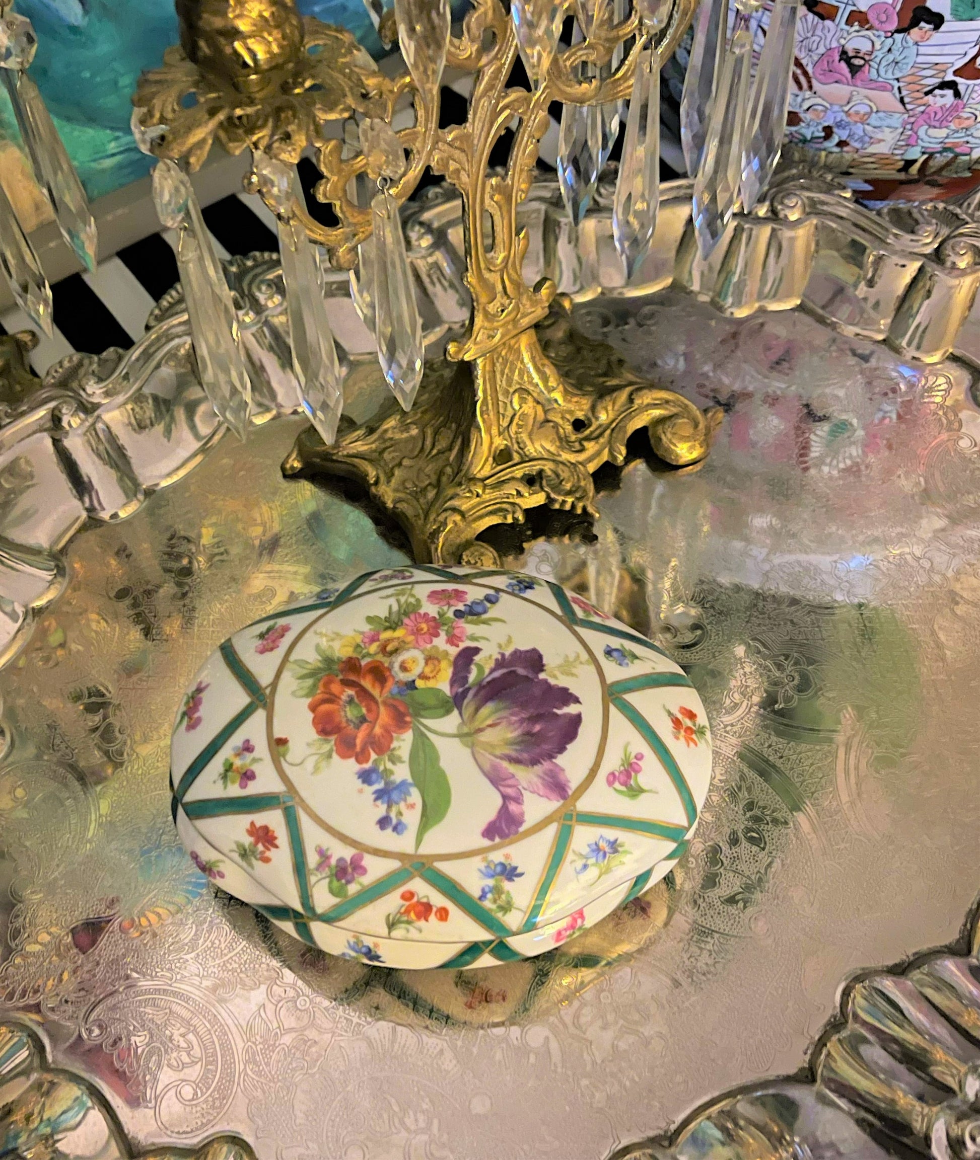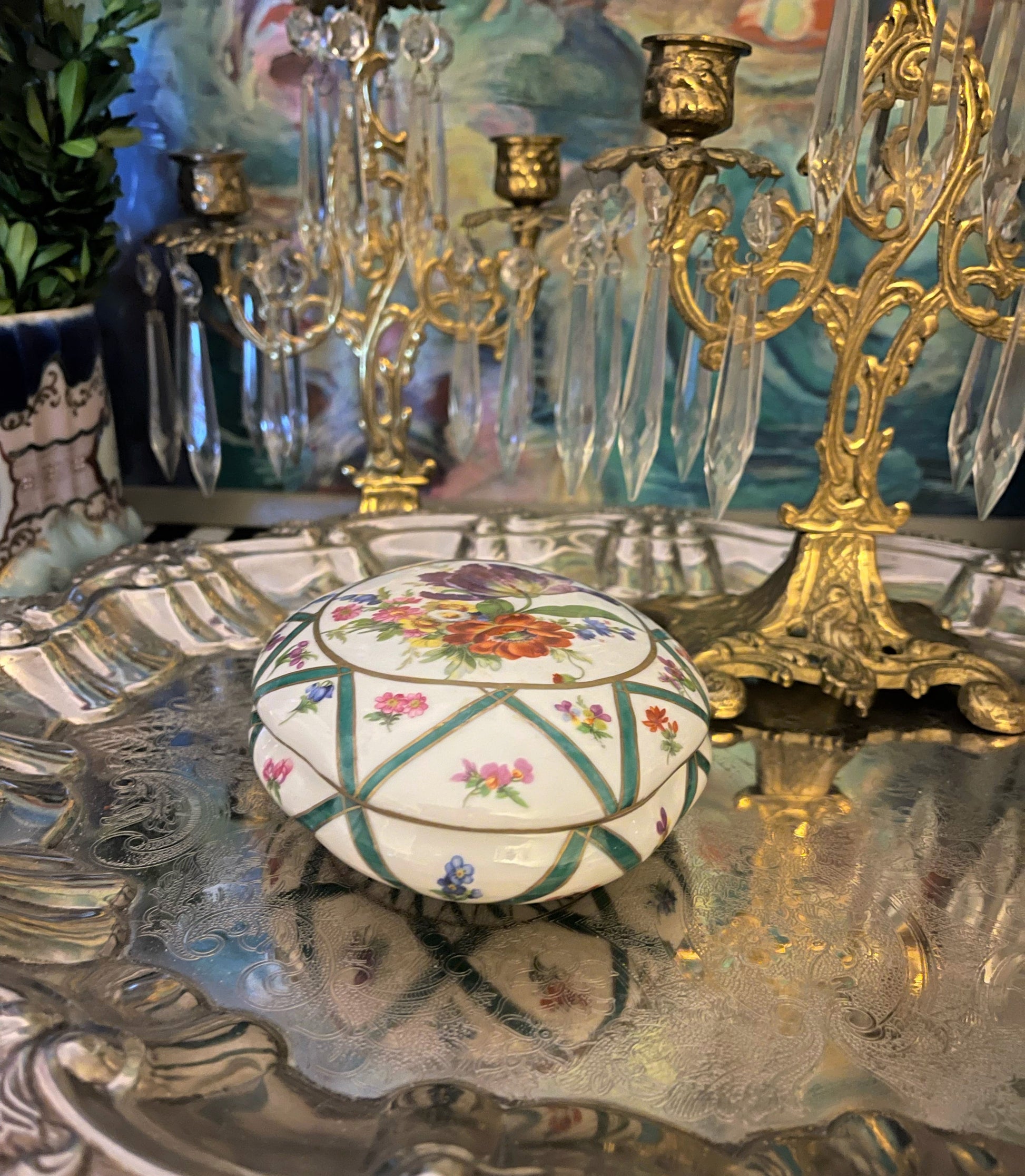 This vintage Italian Elios lidded dish is as functional as it is gorgeous! It's highly decorative with vibrant florals on a white porcelain background enveloped with a green lattice pattern. Perfect for holding small items on a shelf, table, or vanity. Marked as shown.