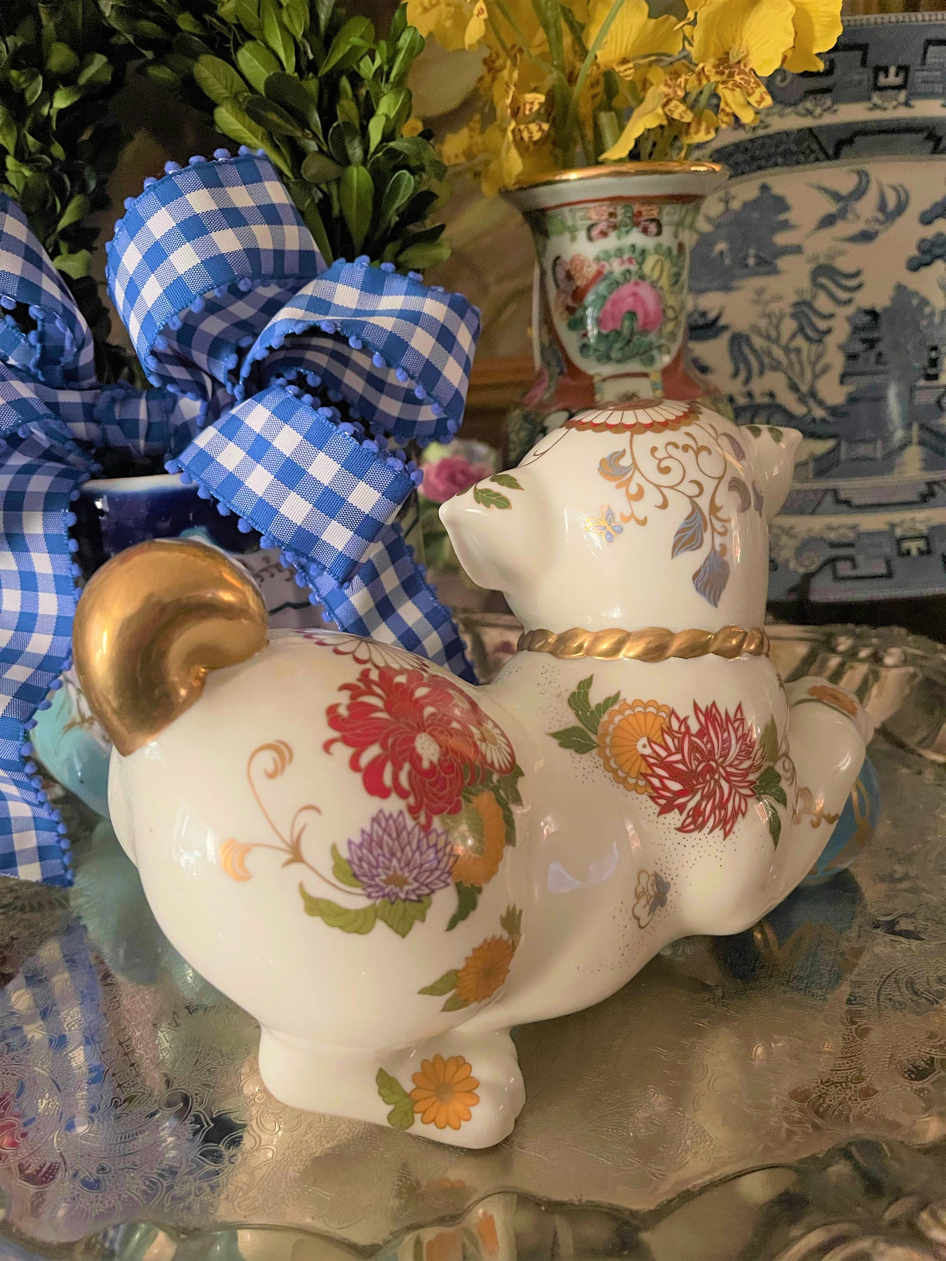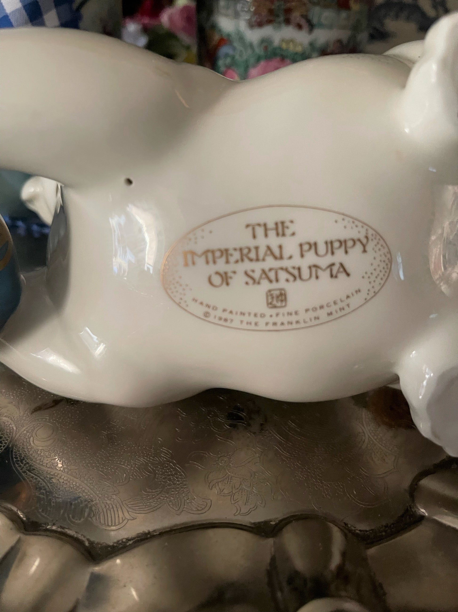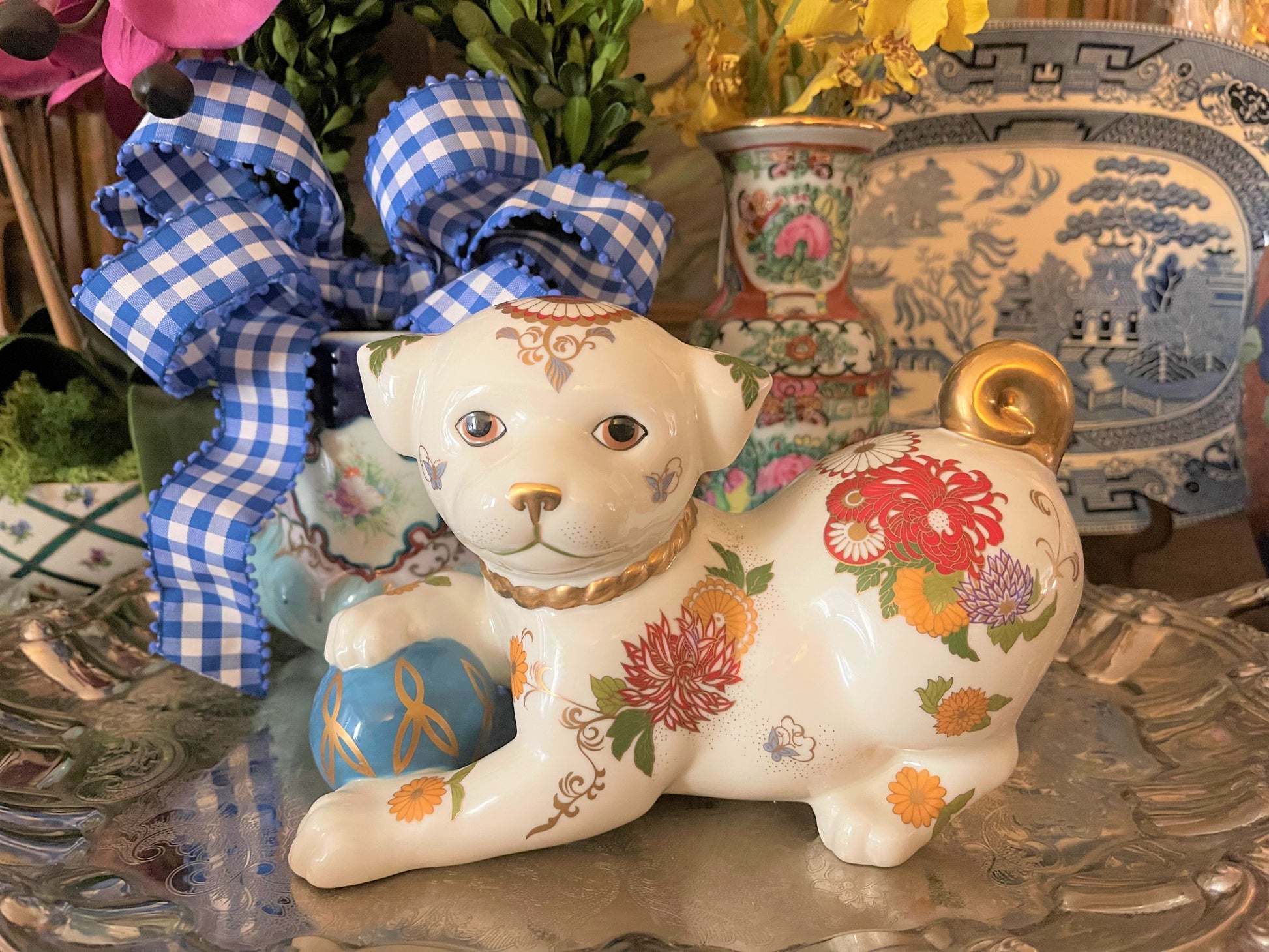 Vintage 'Imperial Puppy of Satsuma'. This posh pup is hand painted in various vibrant florals, including chrysanthemums, with a gold braided band as a collar and a gilt nose and tail atop a white porcelain background. The pup has its paw resting on a blue and gold ball - its stance is reminiscent of a traditional foo dog or shi shi lion. It's a stunning piece by The Franklin Mint c1987. Marked as shown.