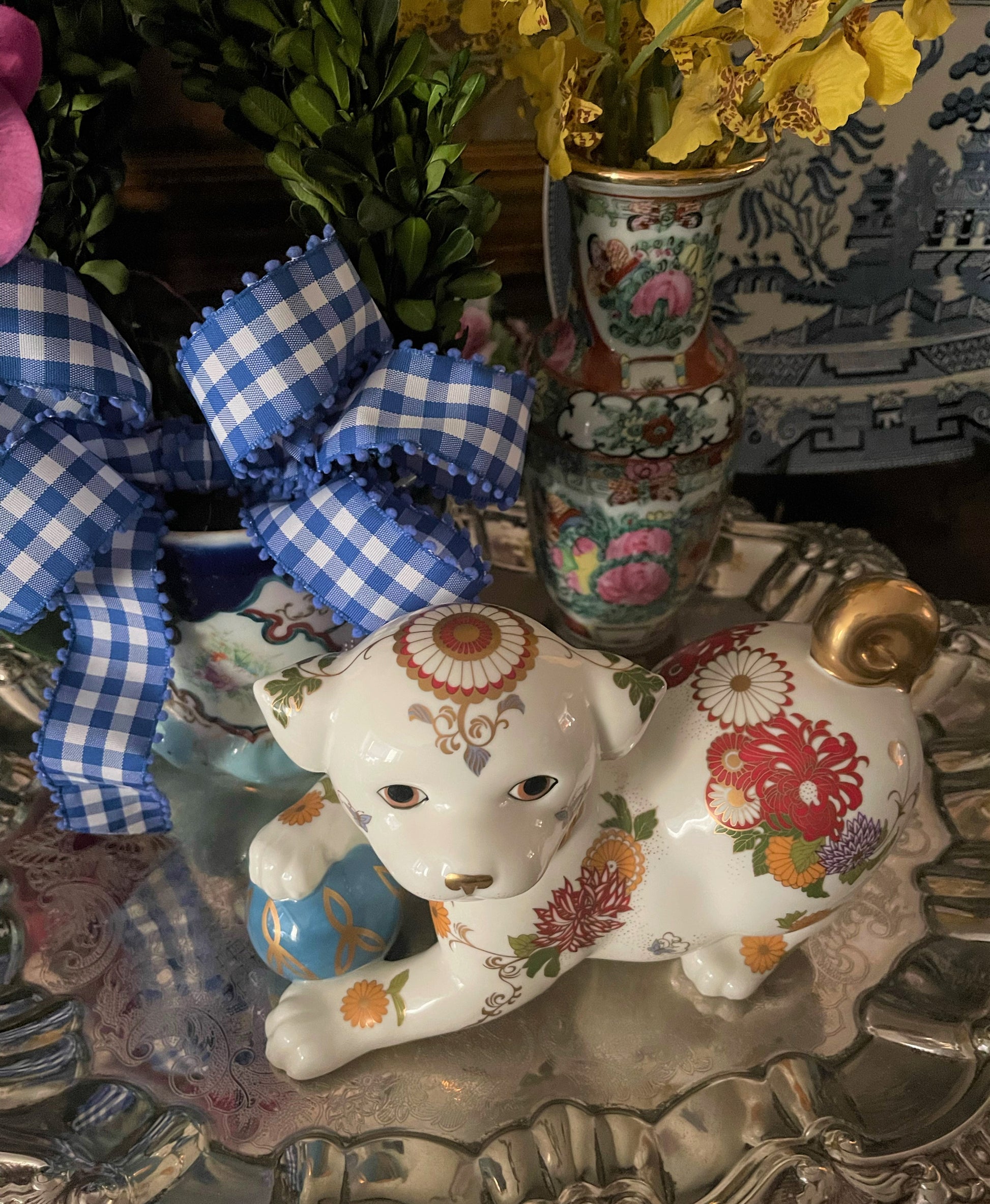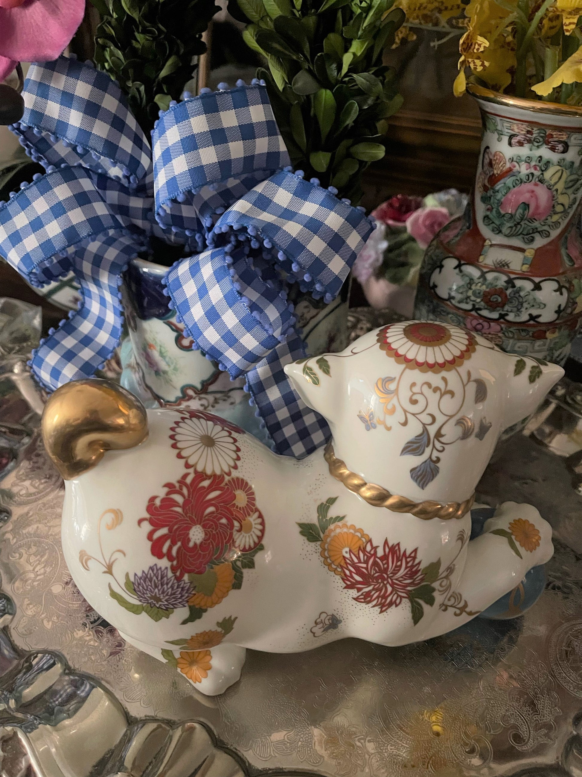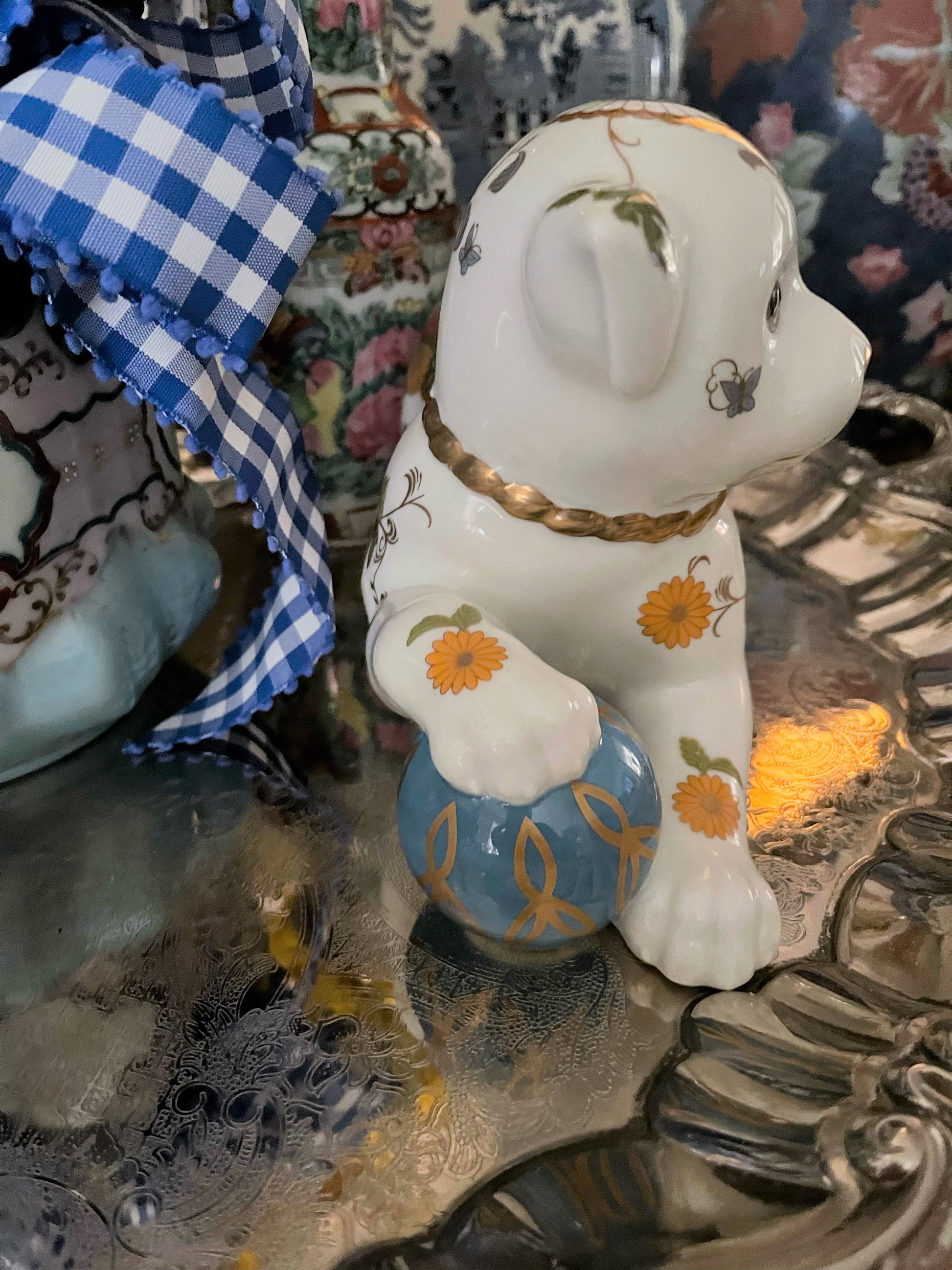 Vintage 'Imperial Puppy of Satsuma'. This posh pup is hand painted in various vibrant florals, including chrysanthemums, with a gold braided band as a collar and a gilt nose and tail atop a white porcelain background. The pup has its paw resting on a blue and gold ball - its stance is reminiscent of a traditional foo dog or shi shi lion. It's a stunning piece by The Franklin Mint c1987. Marked as shown.