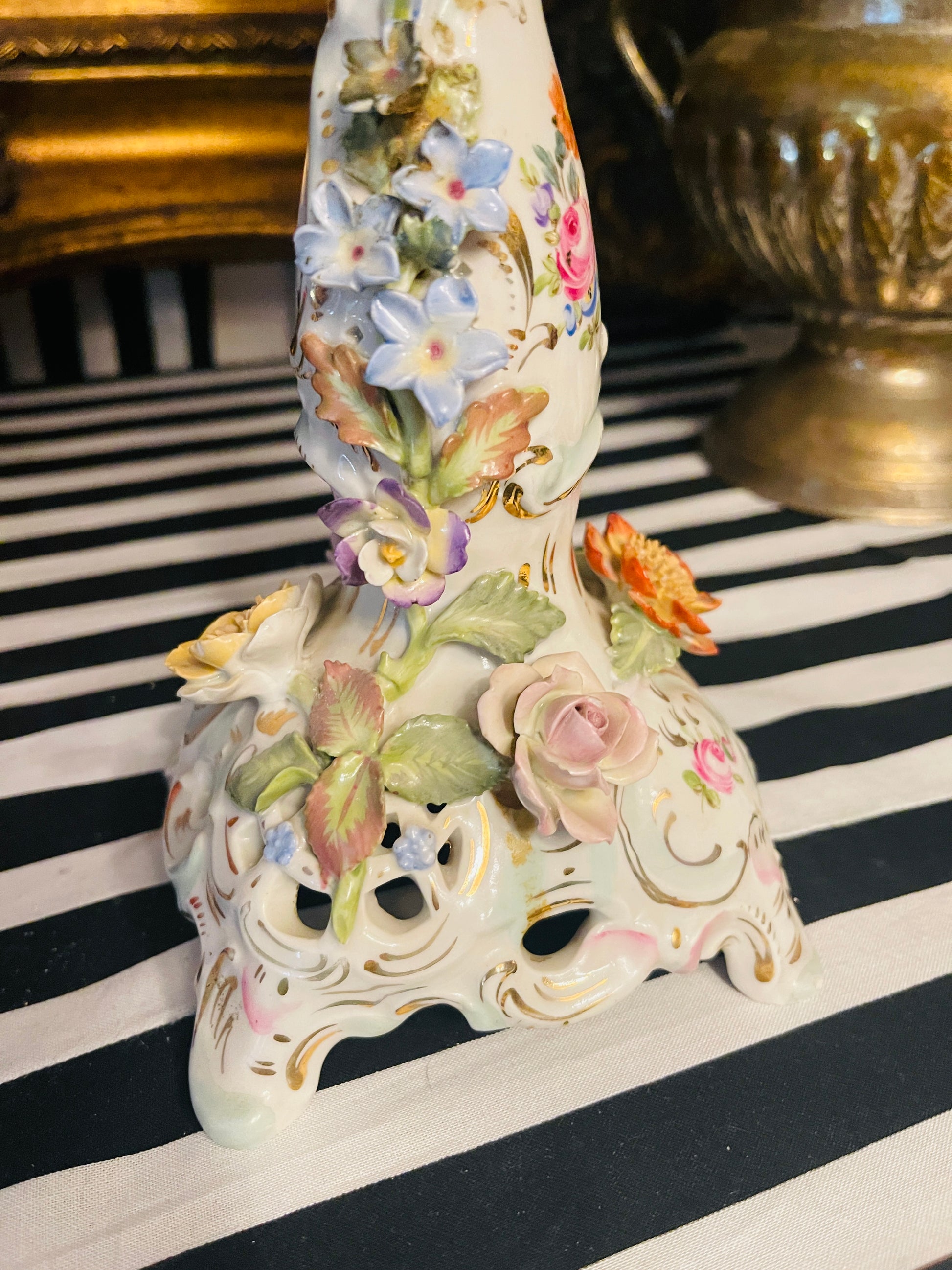 Did you see the pink bows?? This Fantastic antique Carl Thieme German Dresden centerpiece compote with the colorful flowers and pink bows is a DREAM!