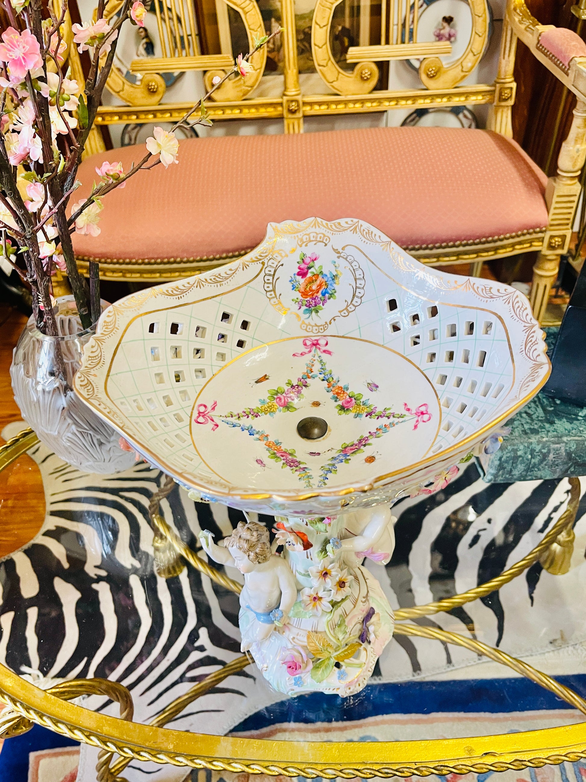 Standing an impressive 14 inches tall, this Rococo revival centerpiece features a reticulated basket-form bowl adorned with hand-painted floral cartouches, lavish gilding, and extraordinary applied porcelain blossoms. Two finely modeled cherubs support the stem, climbing amidst cascading florals in soft pastels of blush, cornflower blue, lavender, and pale celadon.