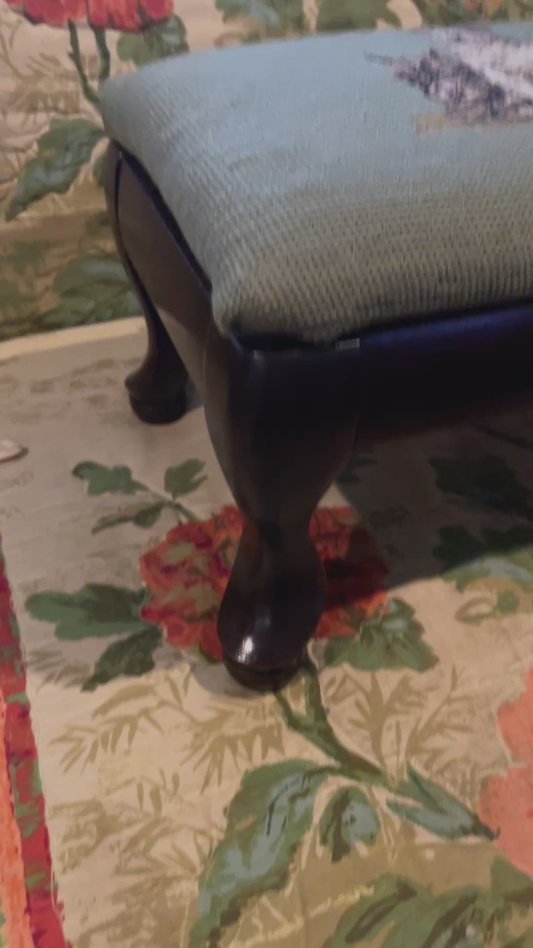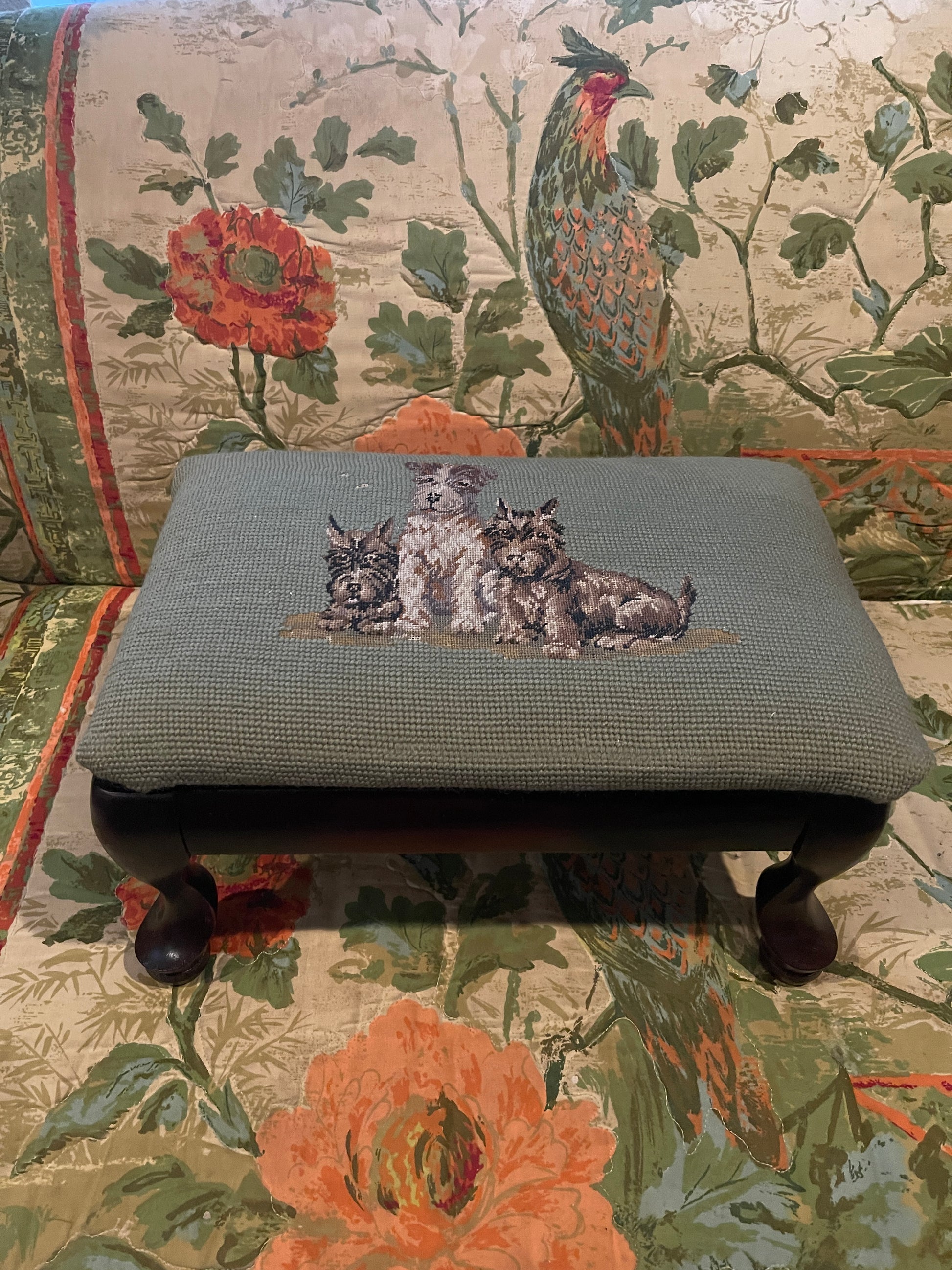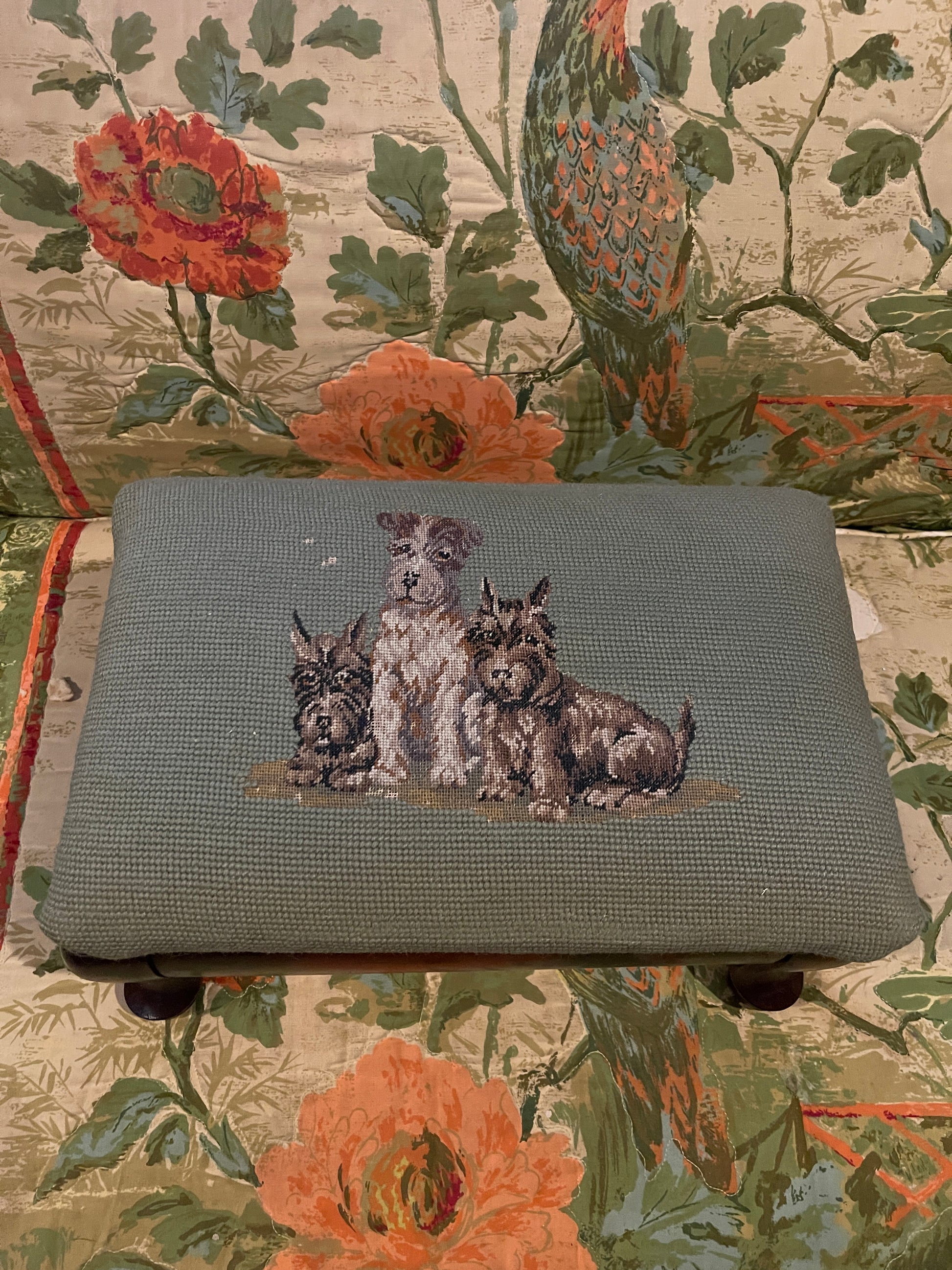 Antique English Needlepoint Dog Ottoman – Terriers on Sage Green Wool, Mahogany, Cabriole Legs