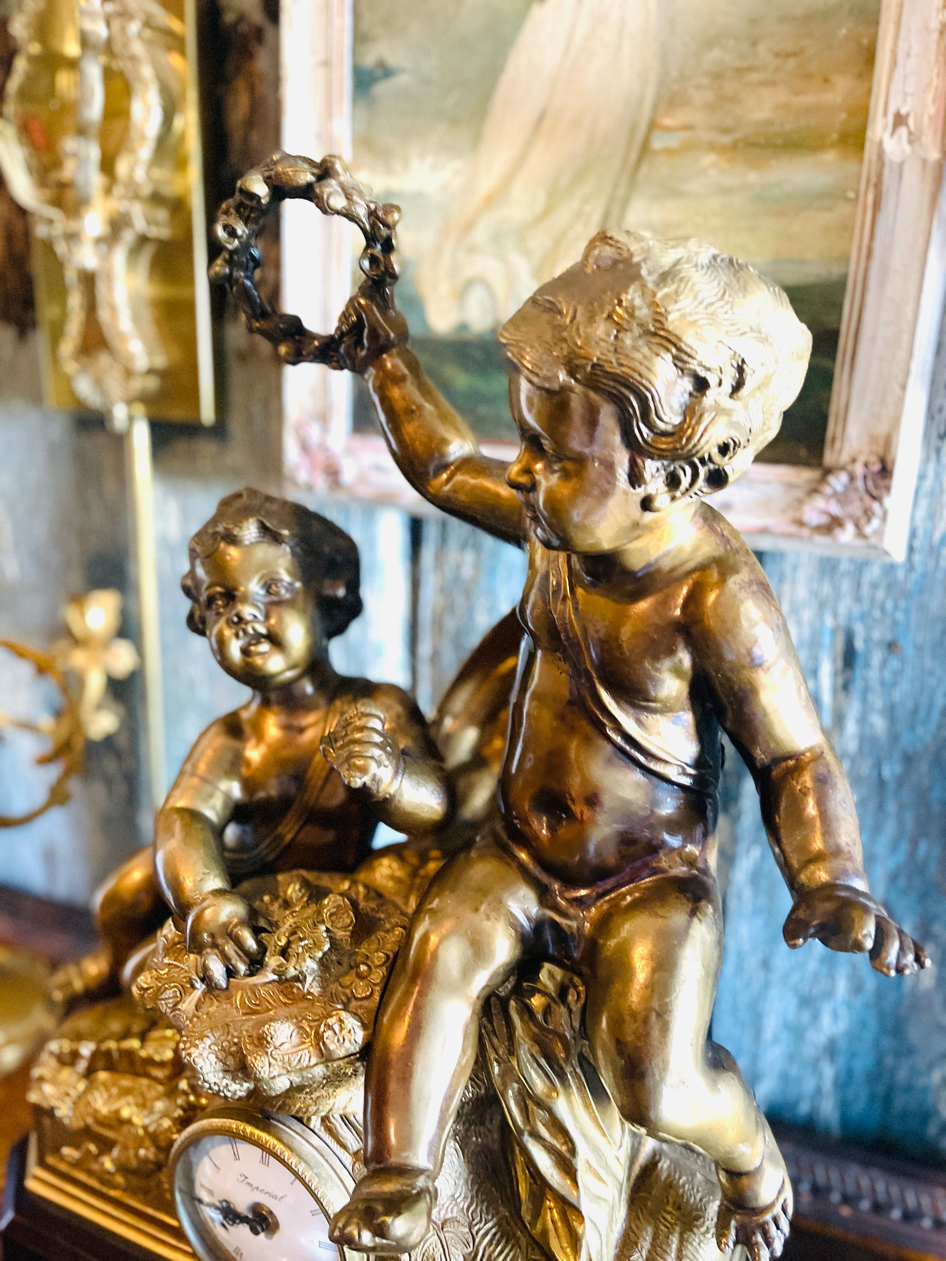 Y'all...this is one of those pieces you dream of finding! It’s a breathtaking pièce de résistance of the Belle Époque, a monumental French figural bronze clock signed Imperial is a symphony of artistry, opulence, and movement. Cast in glowing bronze with gilded accents, two jubilant putti or cherubs recline amidst classical garlands and laurel wreaths — one holding a crown of victory, the other nestled beside a cornucopia of plenty — all symbols of joy, love, and the golden spirit of France’s decorative age.