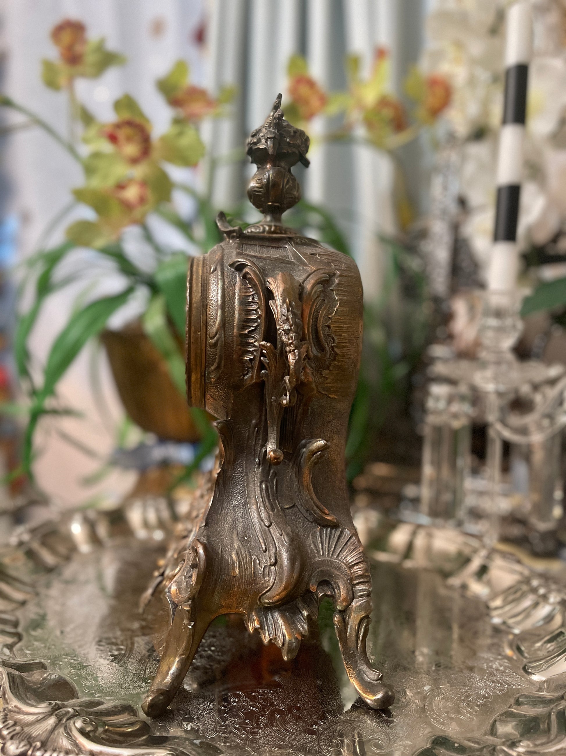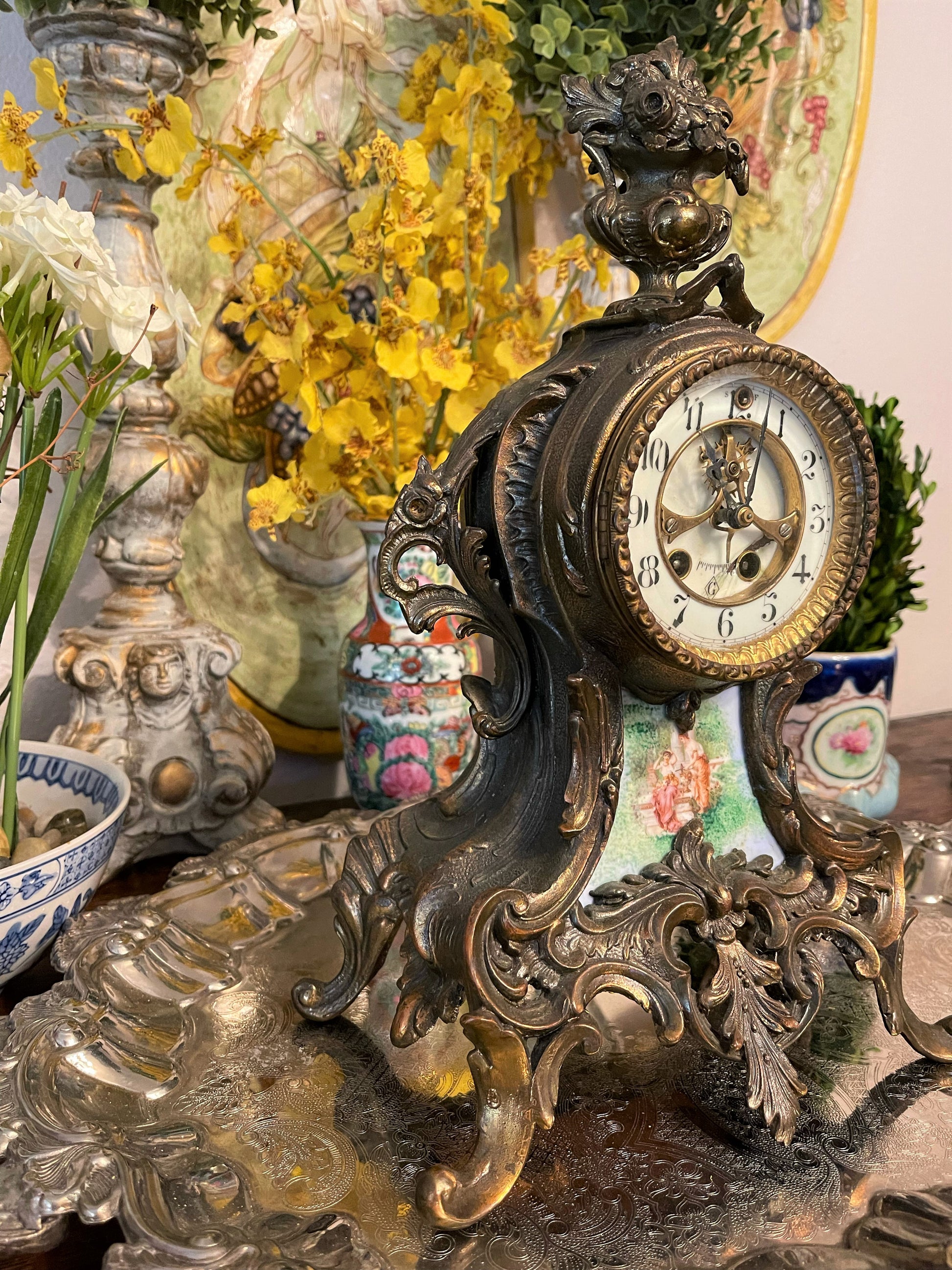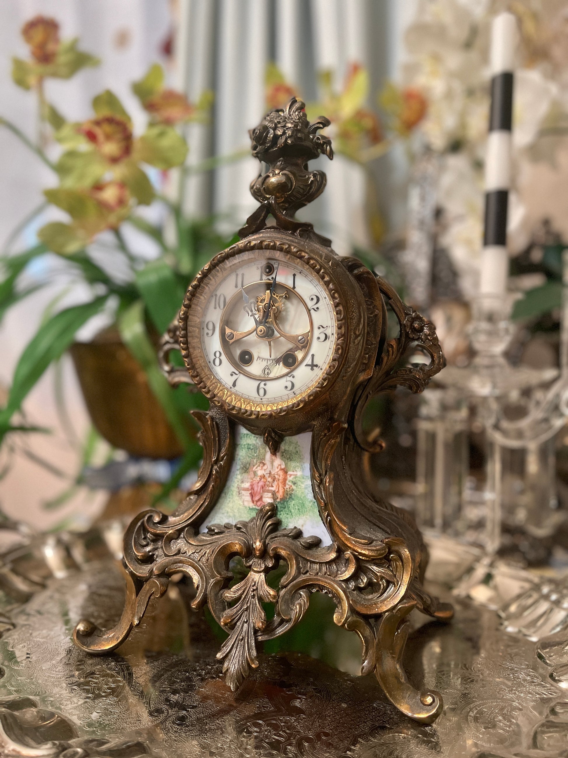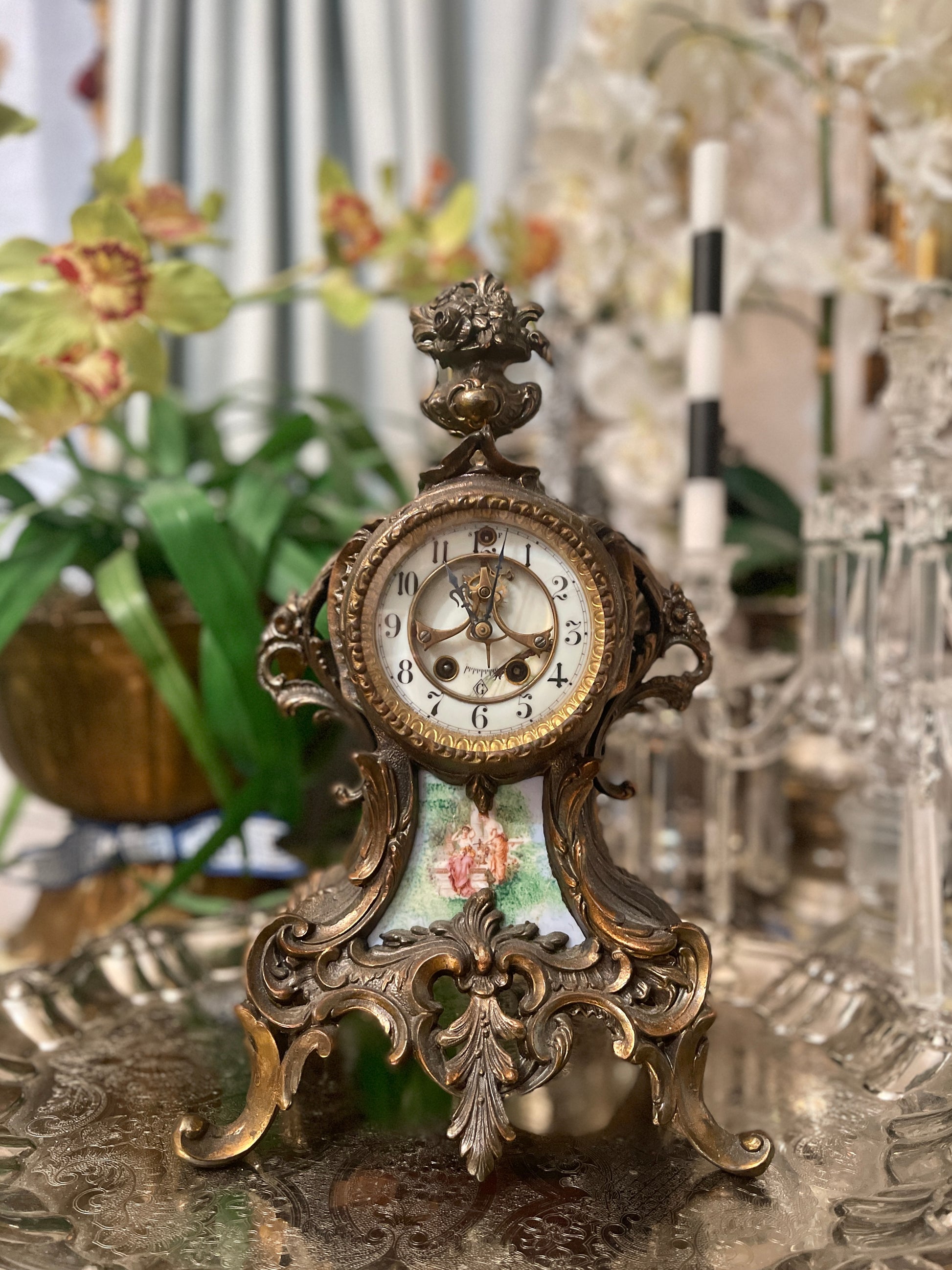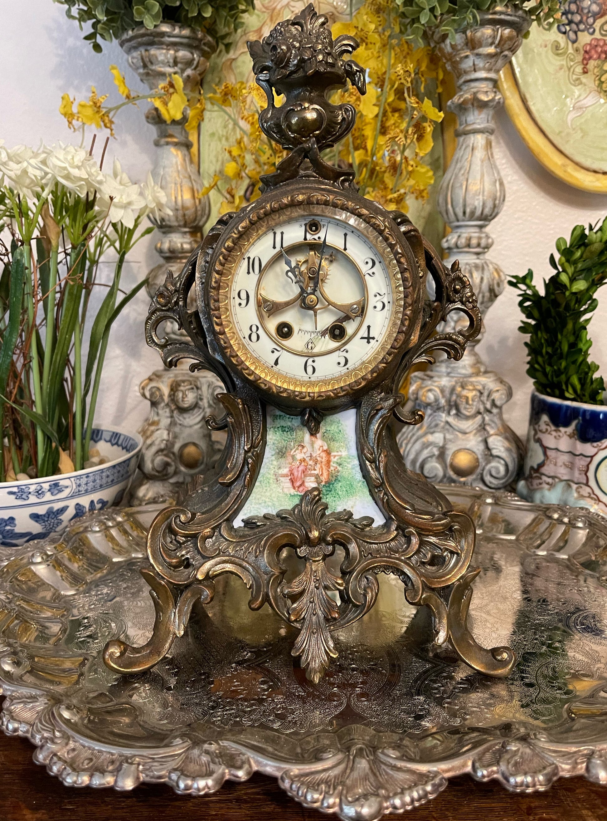 Antique French Ormolu Bronze Mantel Clock with Hand Painted Porcelain Adornment