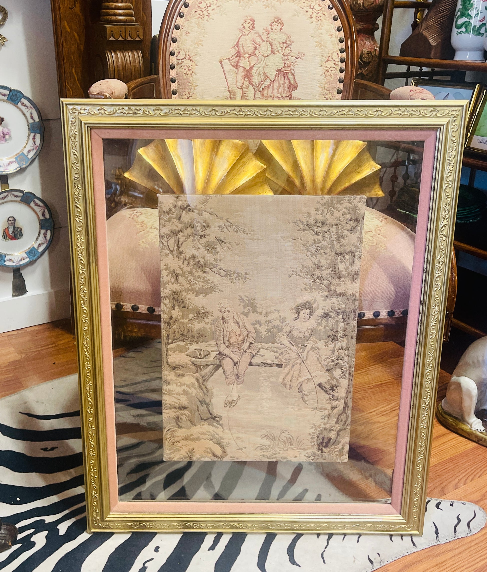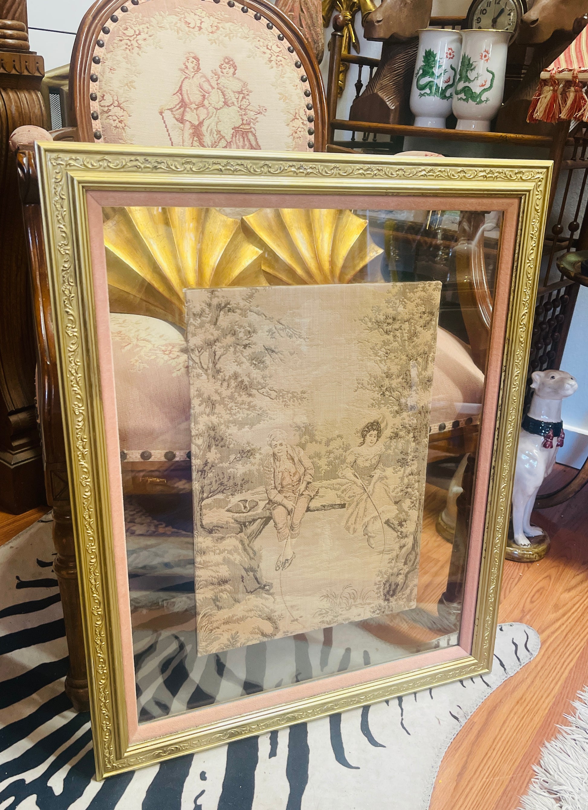 Antique French Pastoral Tapestry in Gilt Frame – Romantic Pastoral Toile Courting Scene with Pink Velvet Matting, Unique Floating Framing