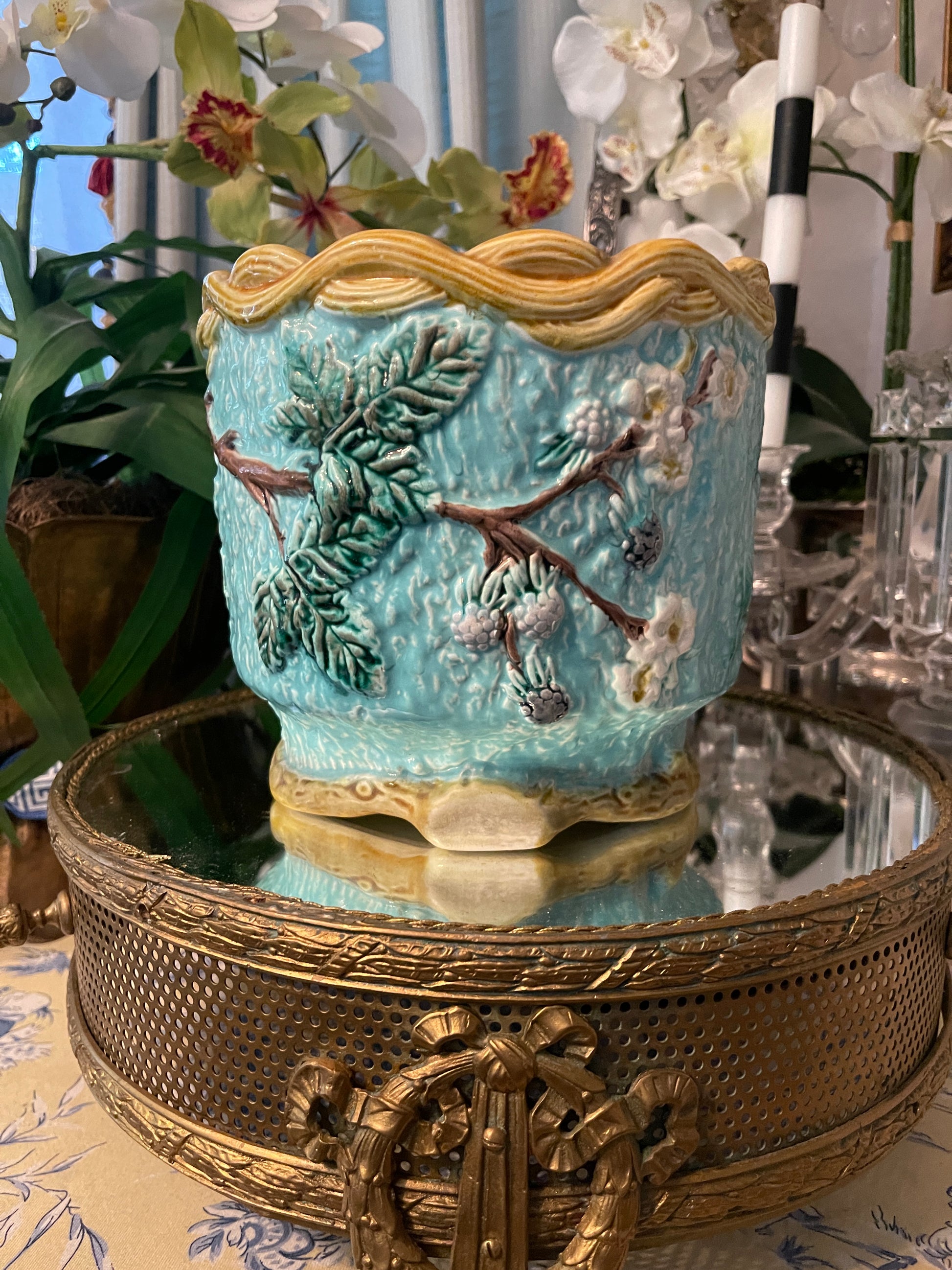 Bring a touch of Old-World elegance to your home with this 19th-century Majolica Cache Pot, a stunning hand-painted jardinière bursting with vibrant color and charm. Featuring the classic Majolica glazing technique—known for its rich hues, glossy finish, and incredible texture—this piece showcases intricate floral motifs with a dimensional, almost sculptural quality.