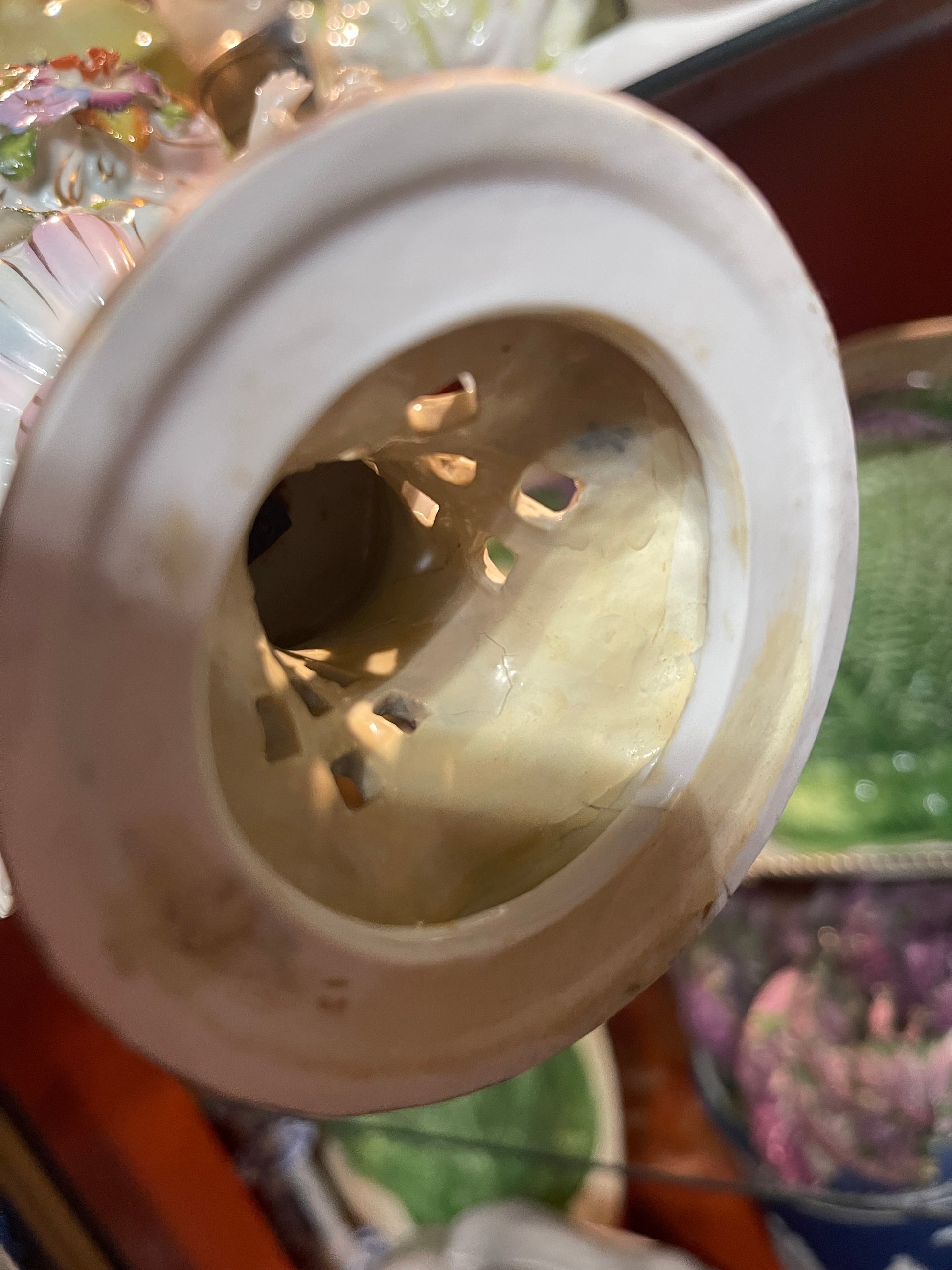 - Decoration: Hand-painted floral scenes, gilt accents, applied floral encrustation