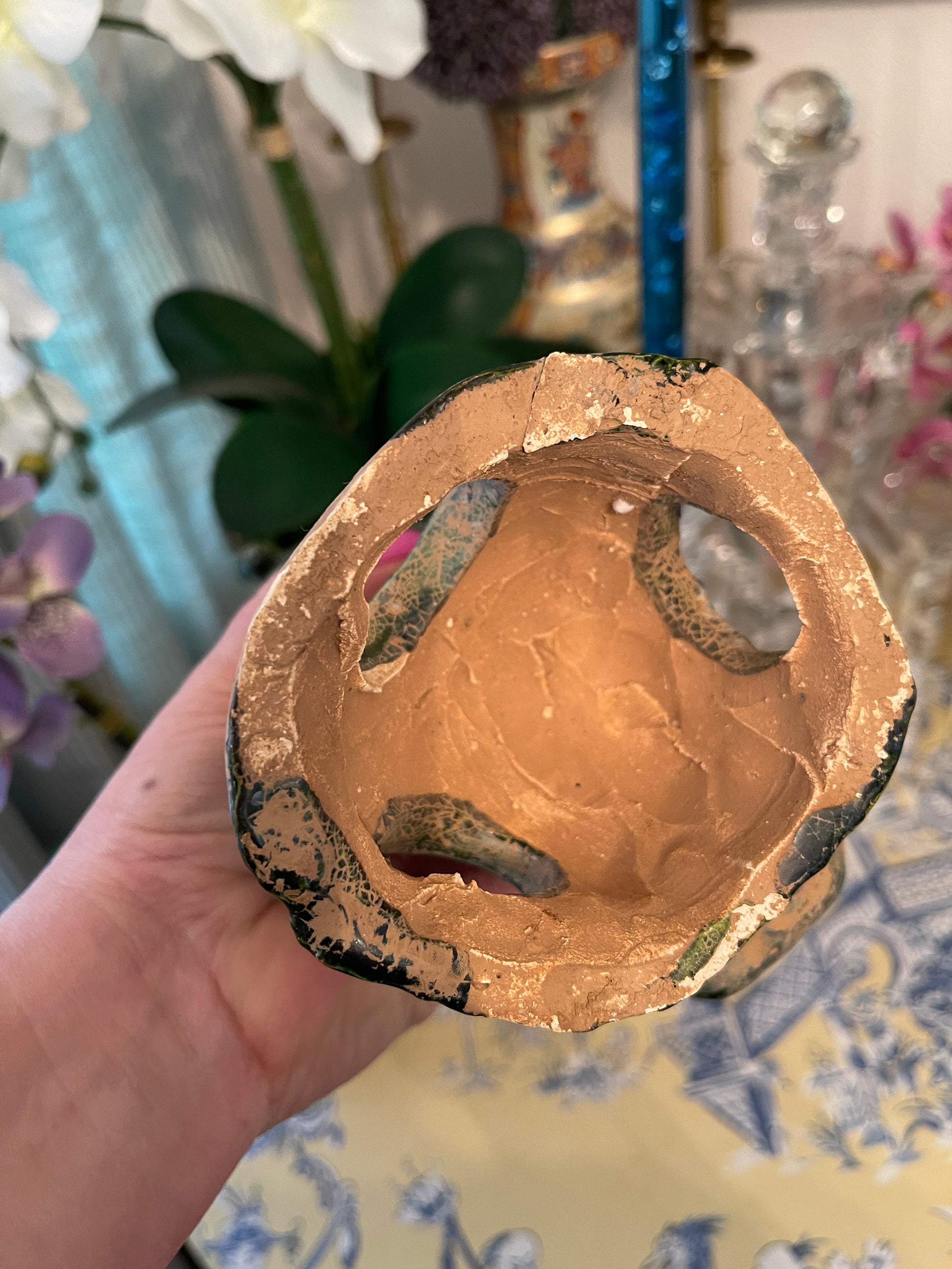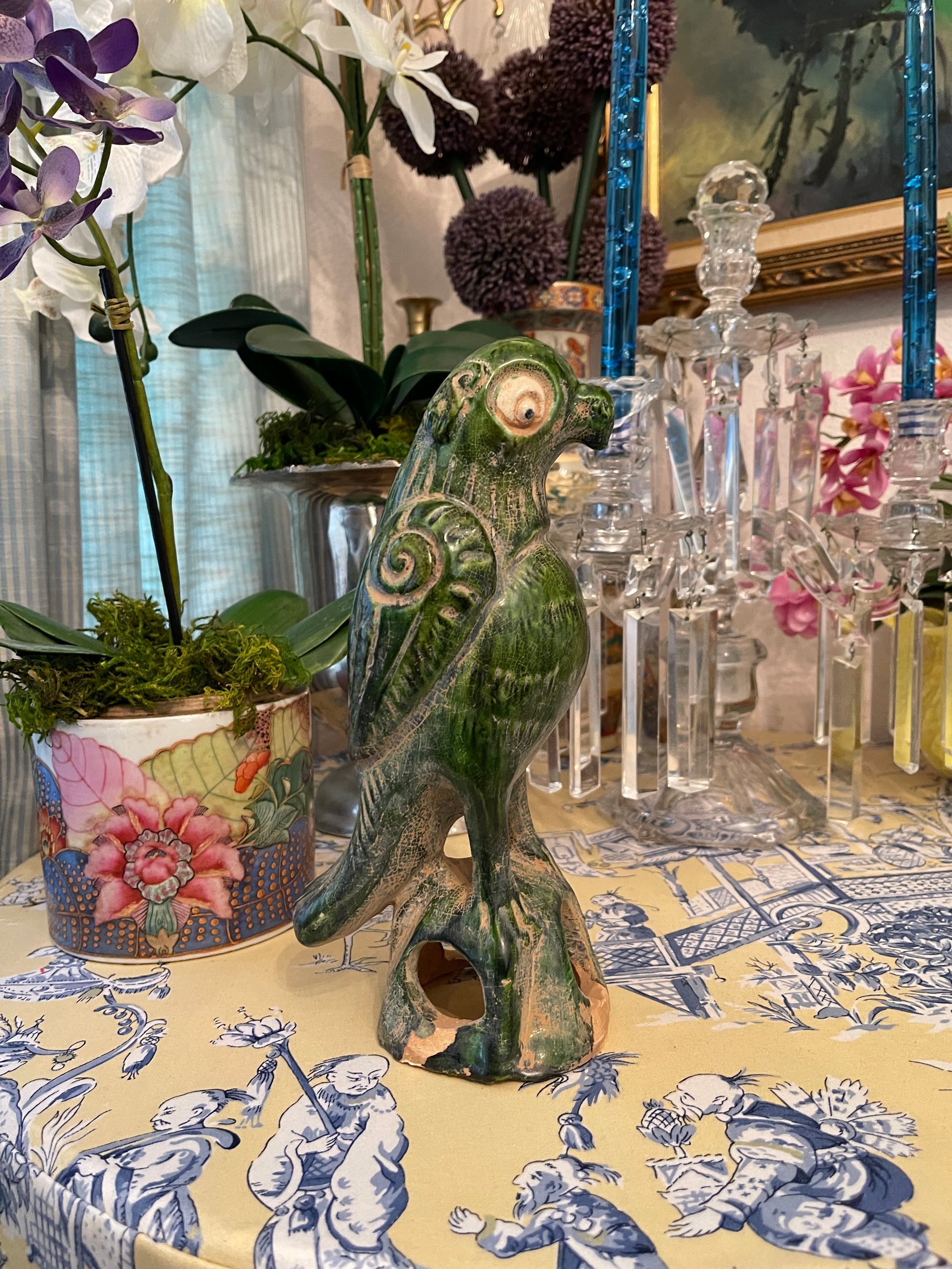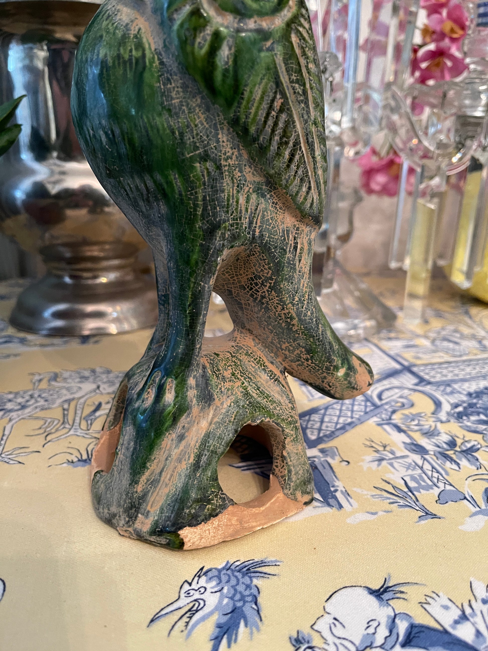 It’s Chinese pottery that has been hand sculpted, painted, and glazed in this glorious green…you can still see the sculpting marks underneath. It does show some age associated wear but no chips or cracks. It’s sure to be a favorite conversation piece.