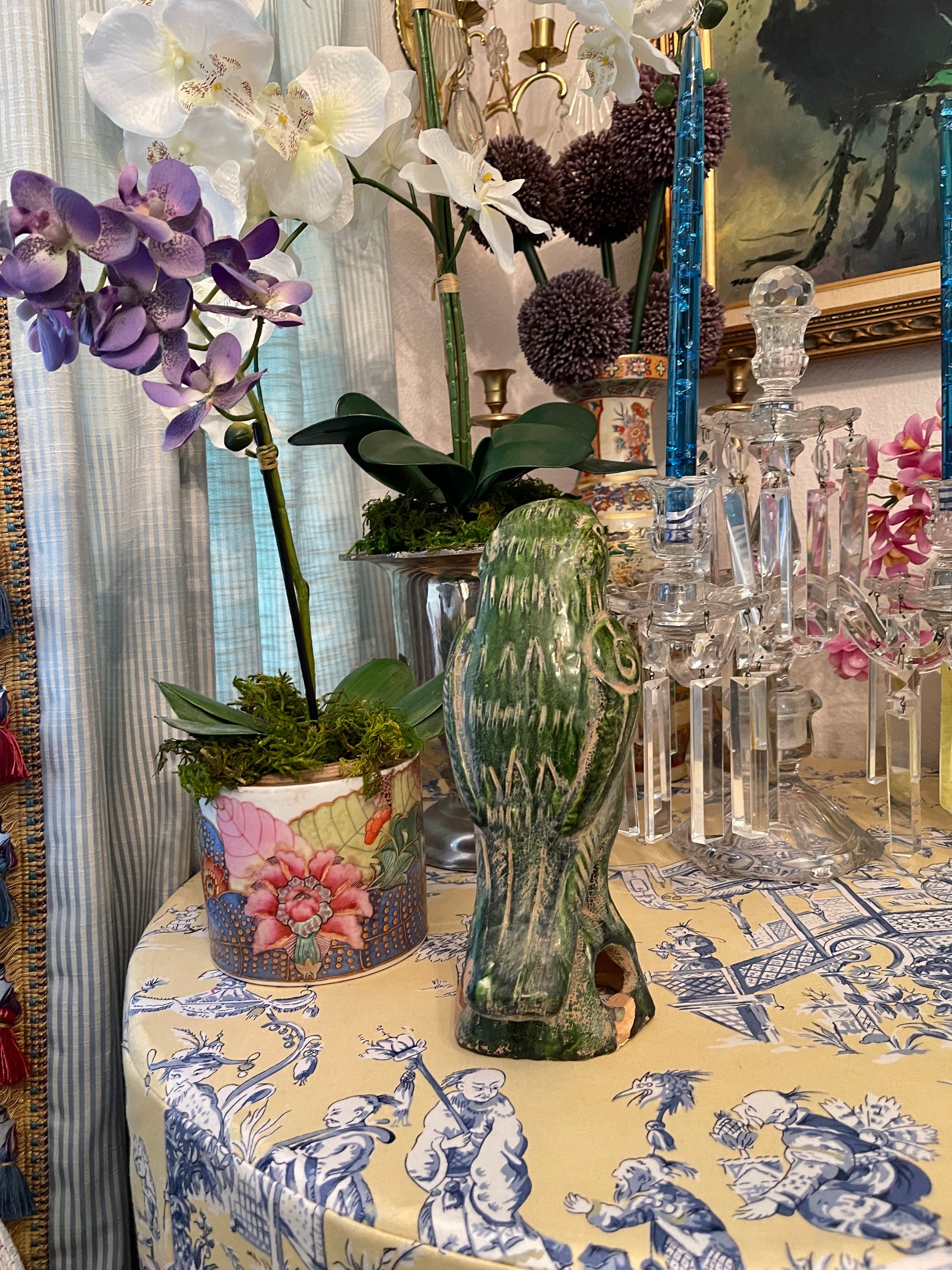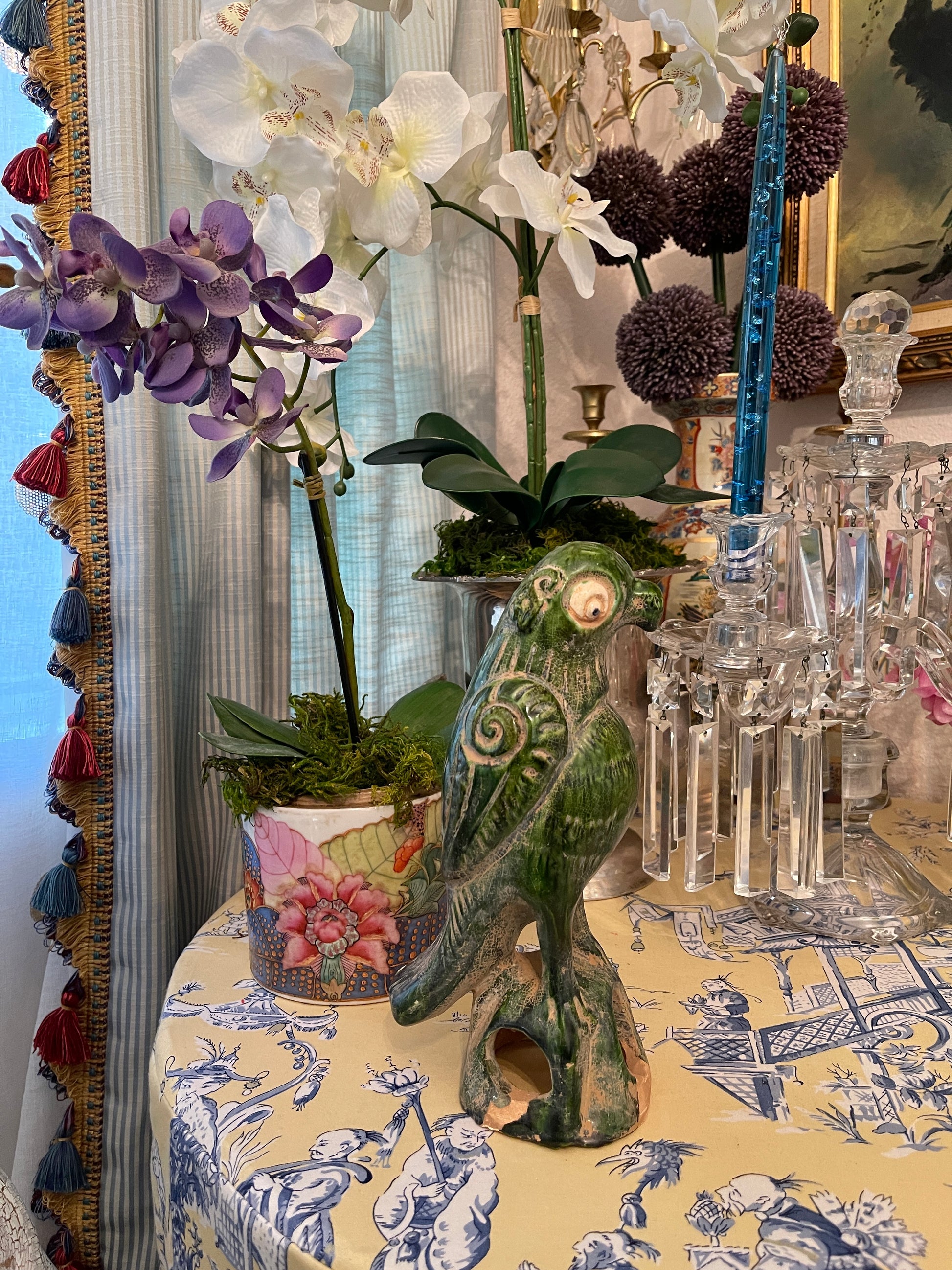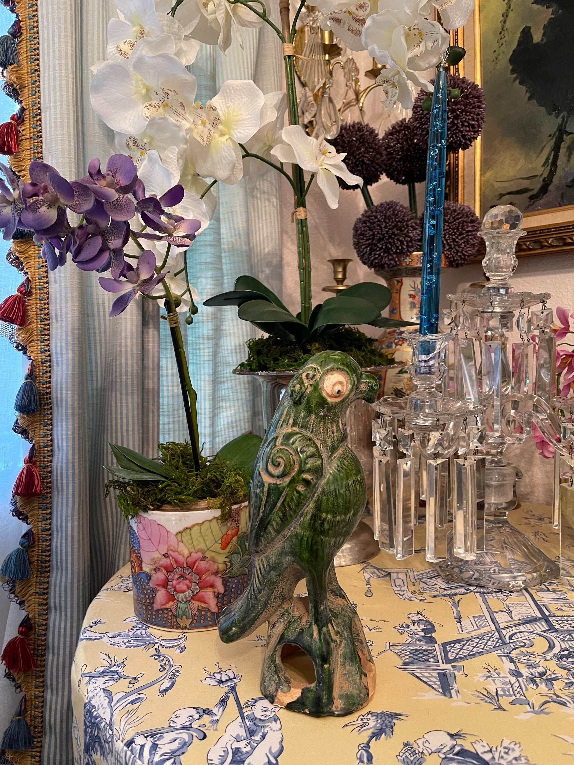 It’s Chinese pottery that has been hand sculpted, painted, and glazed in this glorious green…you can still see the sculpting marks underneath. It does show some age associated wear but no chips or cracks. It’s sure to be a favorite conversation piece.