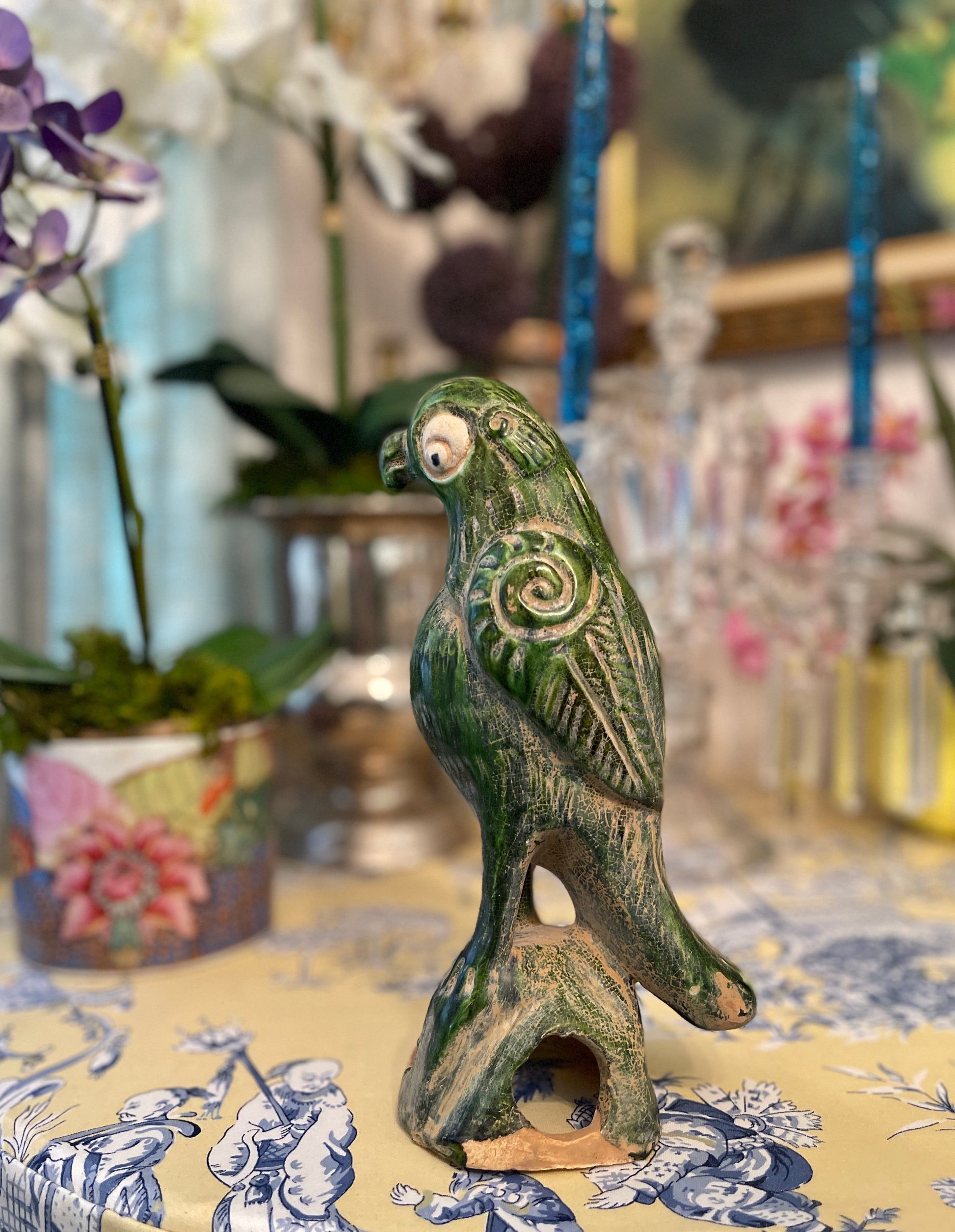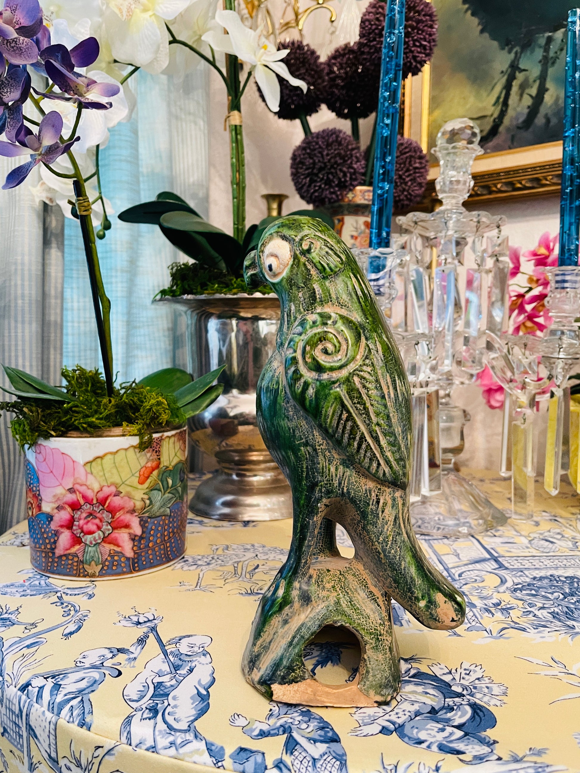Vintage Chinese Green Glazed Parrot, Incense Burner.