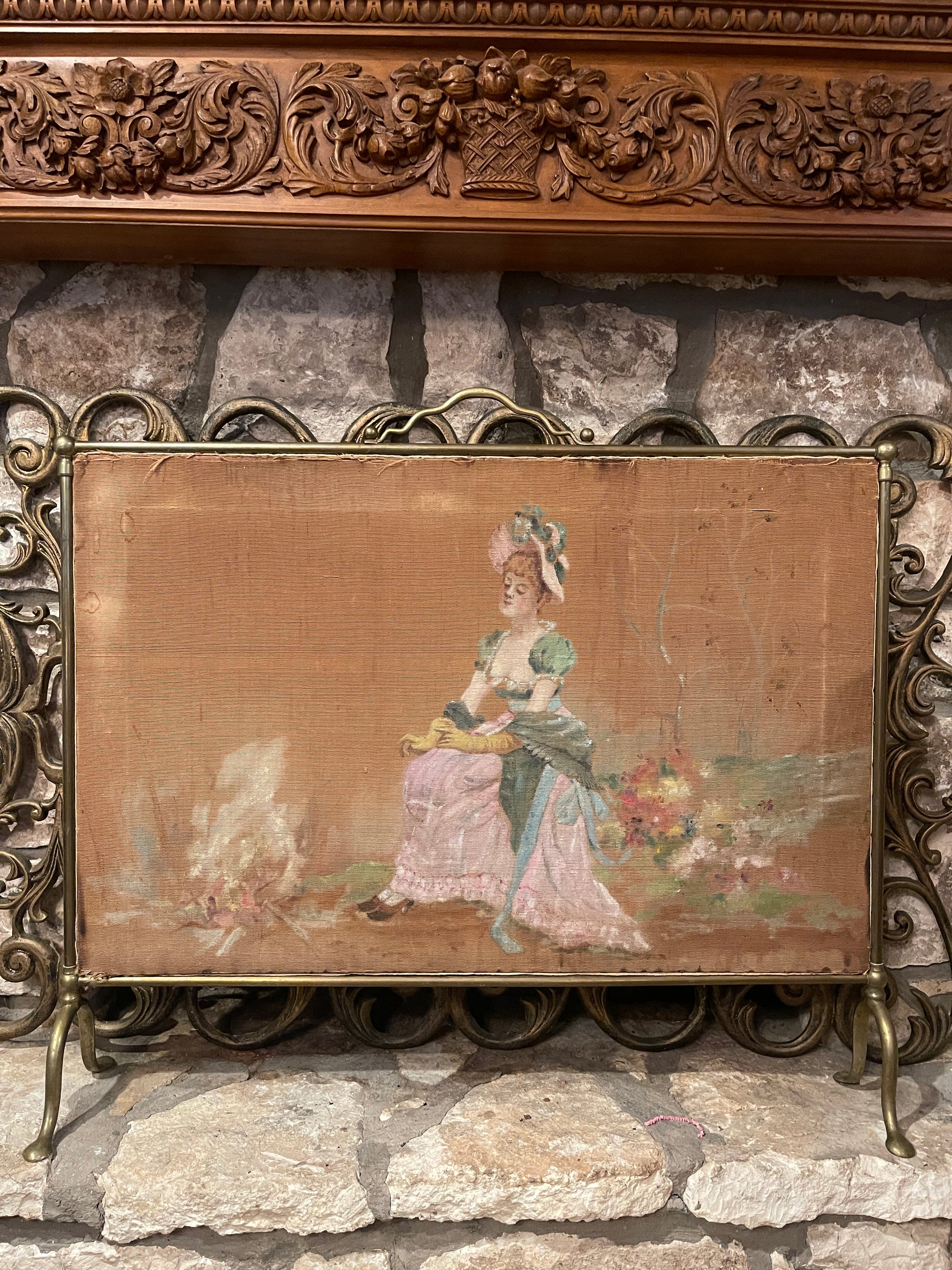 Antique Victorian fireplace screen, hand-painted fire screen, Round Top antiques, 19th century décor, antique brass frame, vintage parlor art, heirloom estate décor, romantic home décor, grandmillennial style, Under the Copper Roof, antique art panel, French Victorian home décor