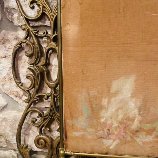 Surrounded by an ornate brass frame with scrollwork detailing and standing gracefully on curved feet, this screen is the perfect marriage of art and function — originally used to soften the glow of the hearth, now a statement piece of timeless allure.