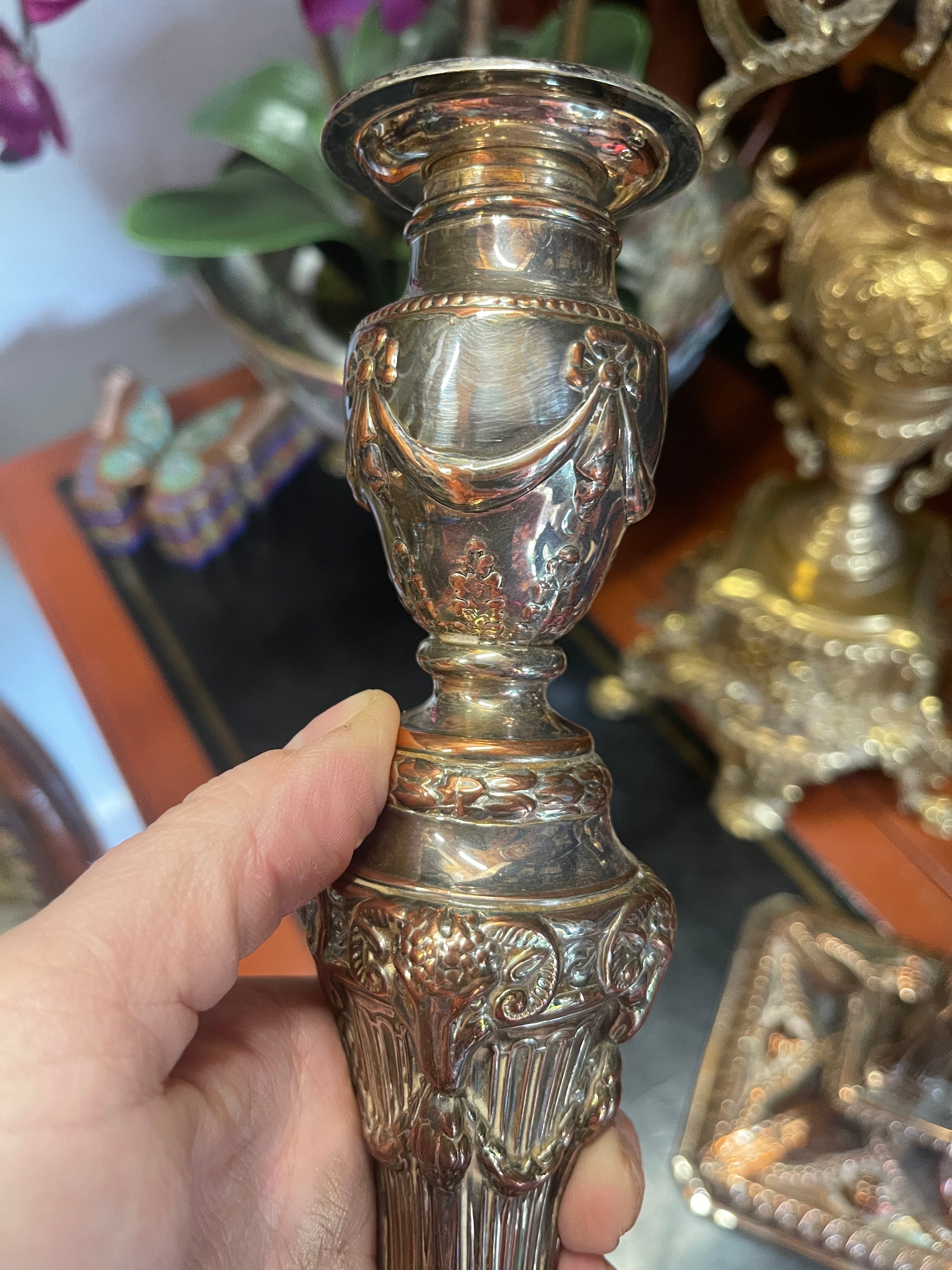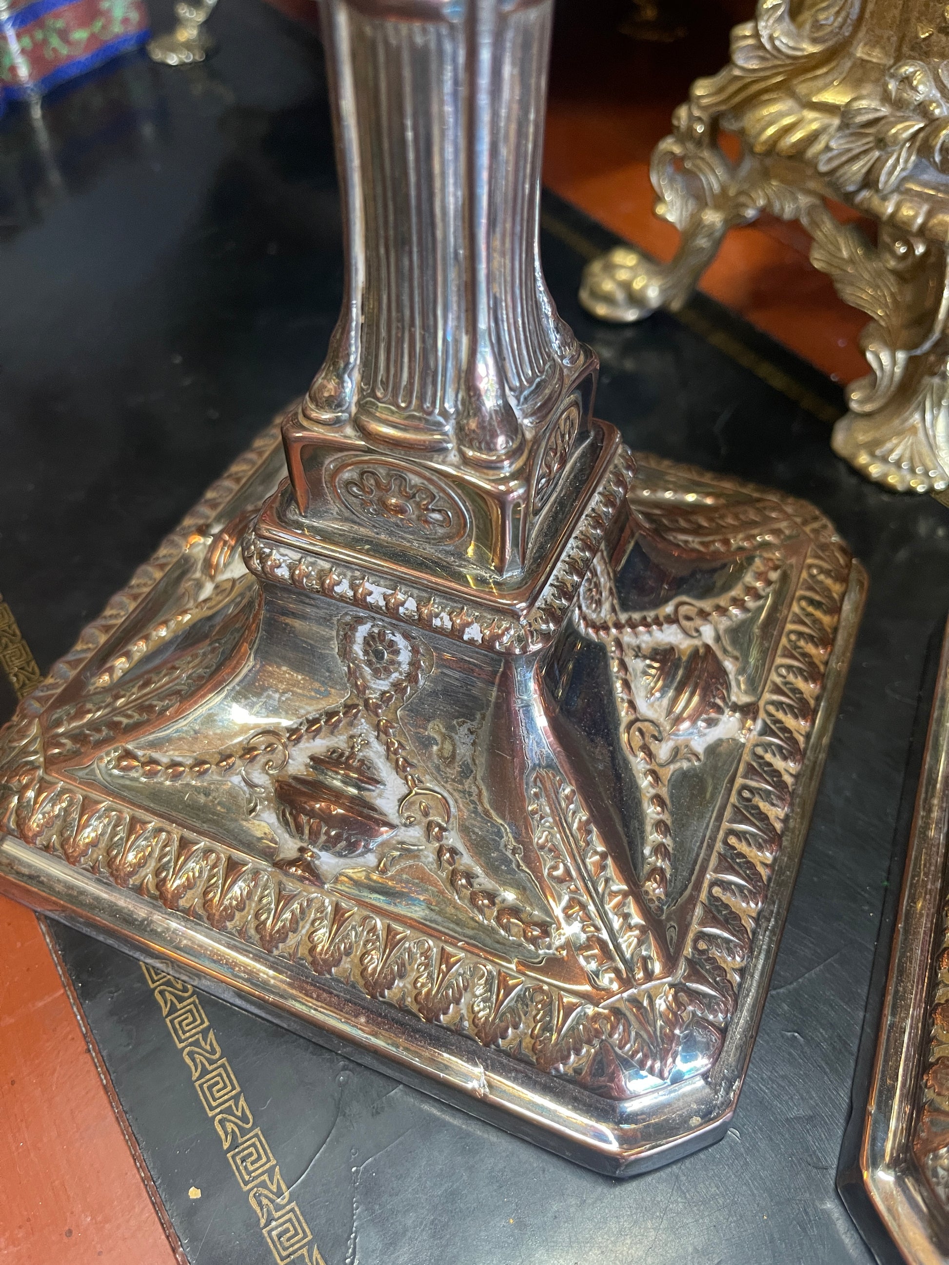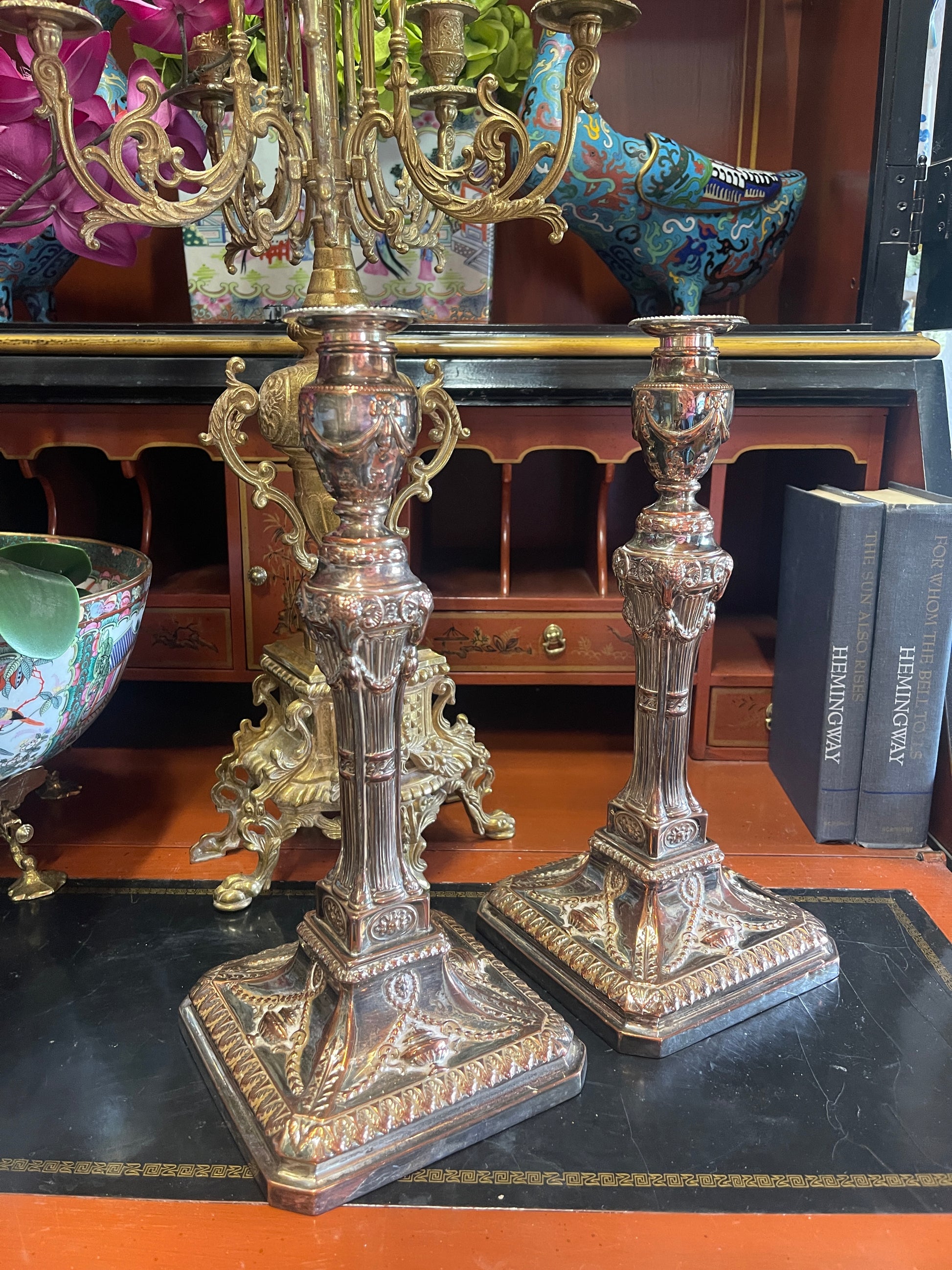The craftsmanship is exceptional, with fluted columns rising to finely cast capitals, all silver-plated with a rich, time-softened patina that adds incredible depth and warmth from the visible copper . These are not your subtle table toppers—they are commanding centerpieces perfect for mantels, flanking a mirror, or elevating a formal tablescape.