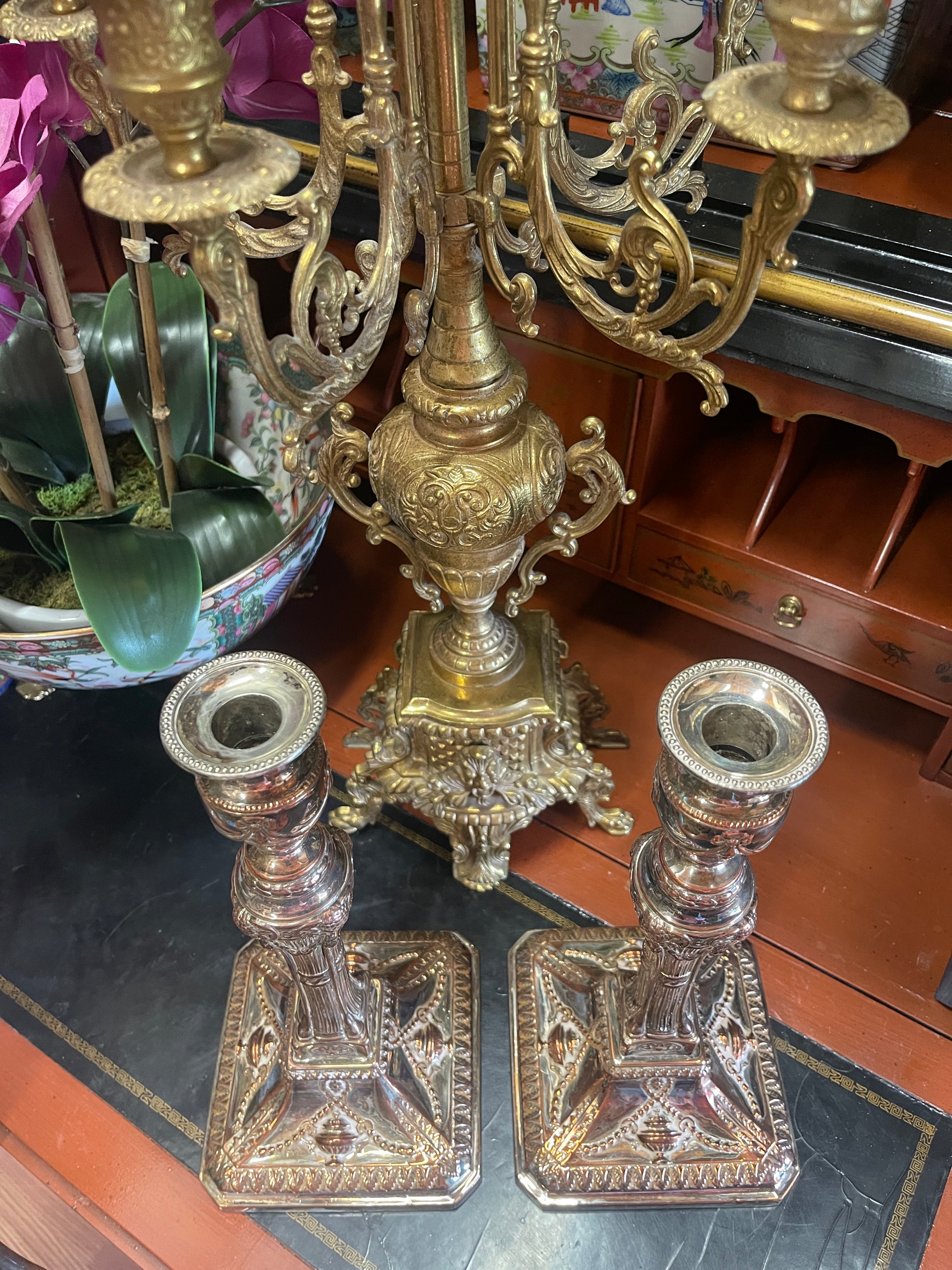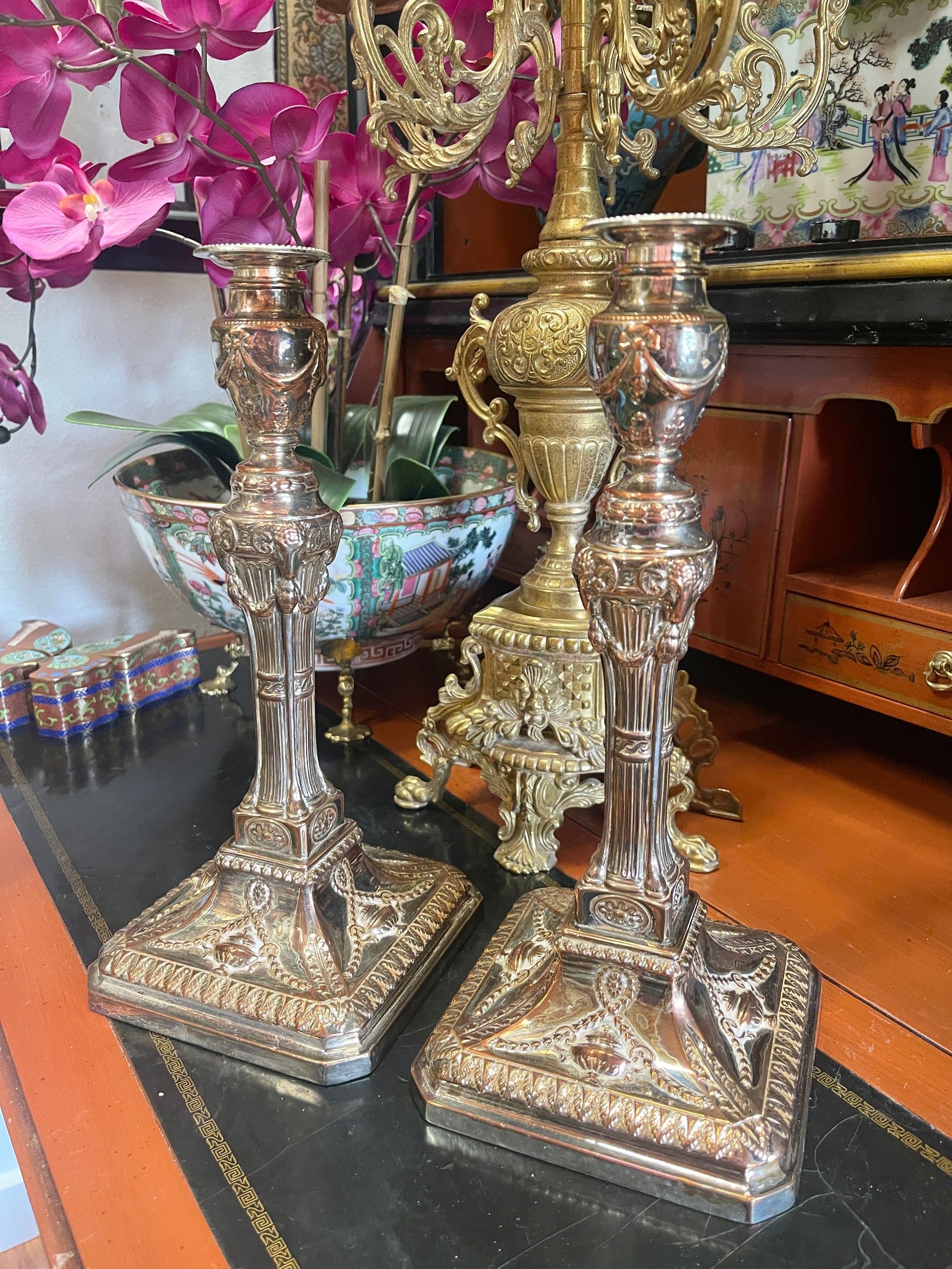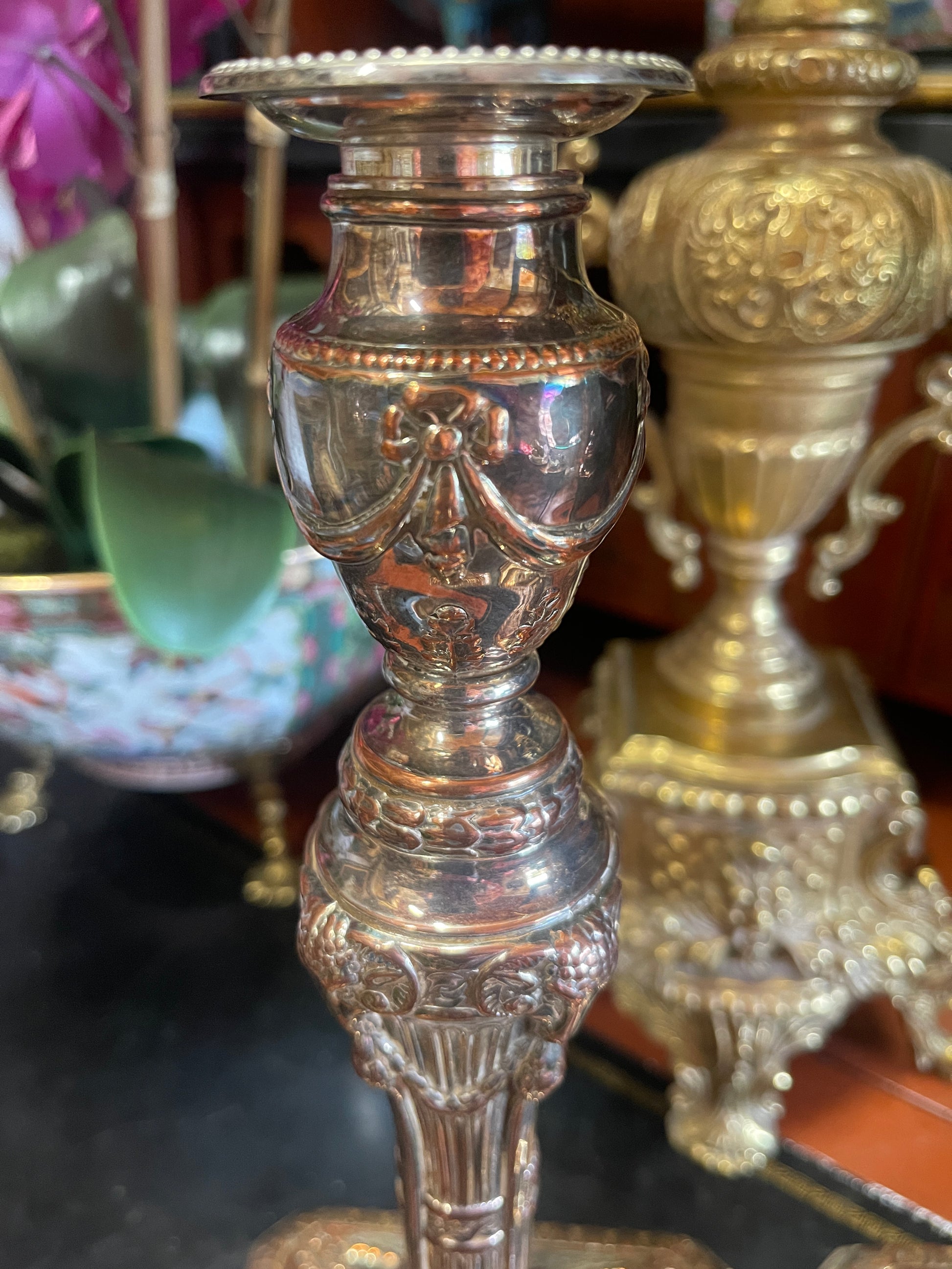 The craftsmanship is exceptional, with fluted columns rising to finely cast capitals, all silver-plated with a rich, time-softened patina that adds incredible depth and warmth from the visible copper . These are not your subtle table toppers—they are commanding centerpieces perfect for mantels, flanking a mirror, or elevating a formal tablescape.