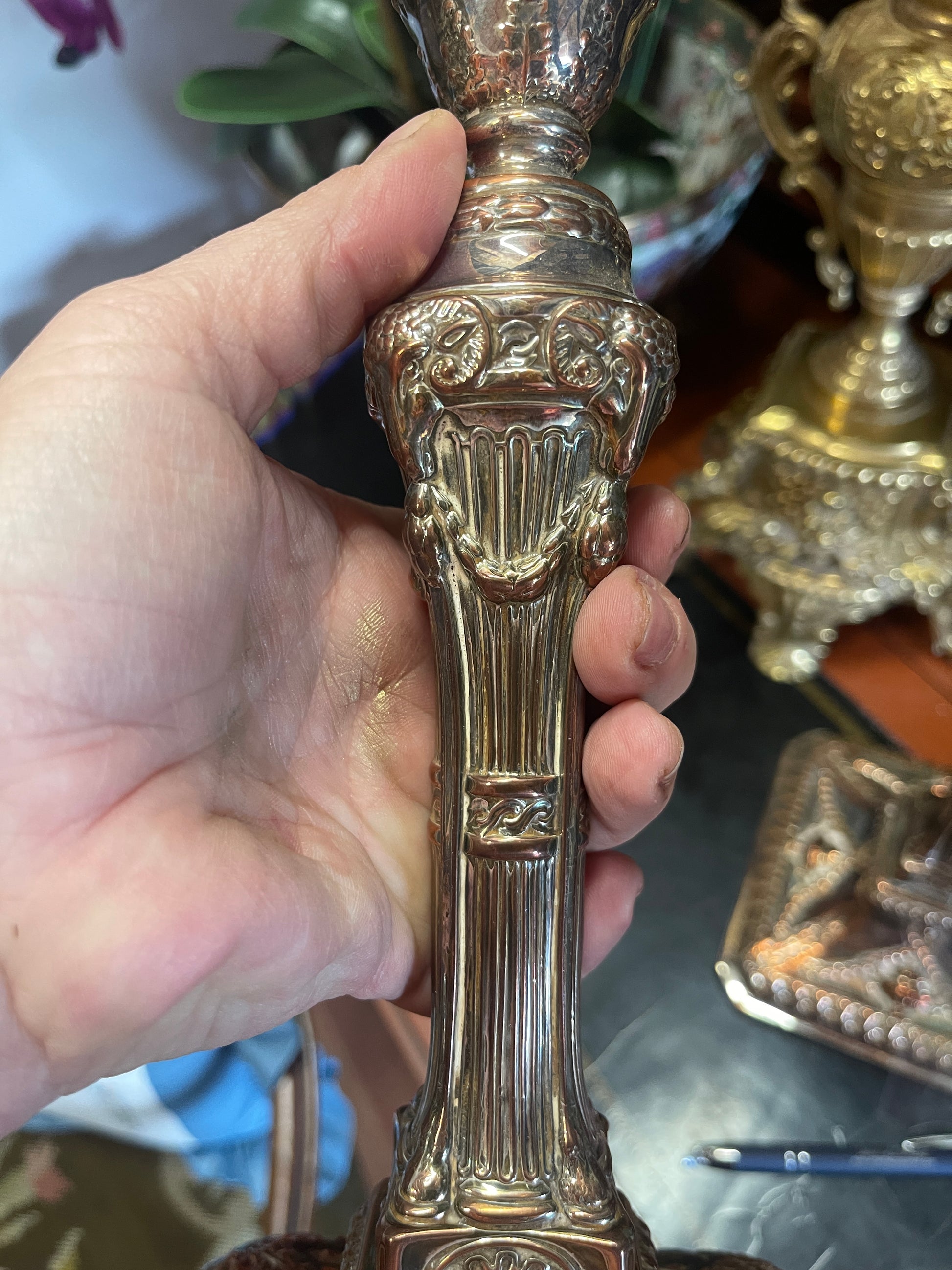 Perfectly Patinaed Antique Walker & Hall Silver Plate Over Copper Candlesticks| Neoclassical Empire Style | English Silverplate | Ornate Ram’s Head, Urn & Swag Motif