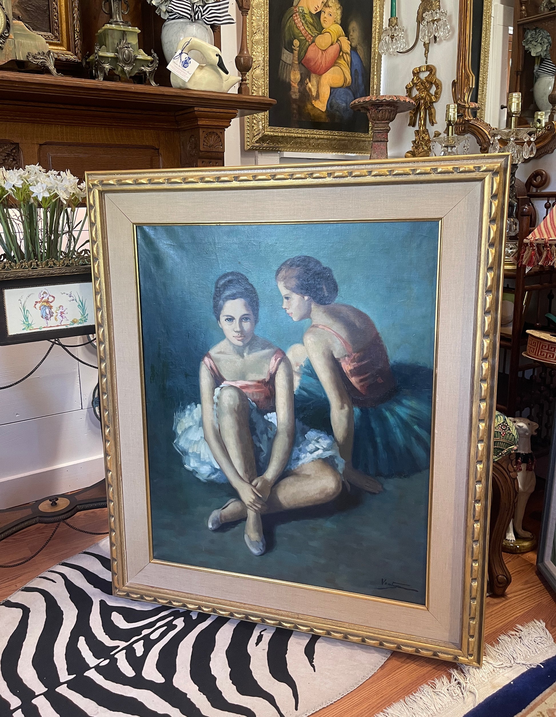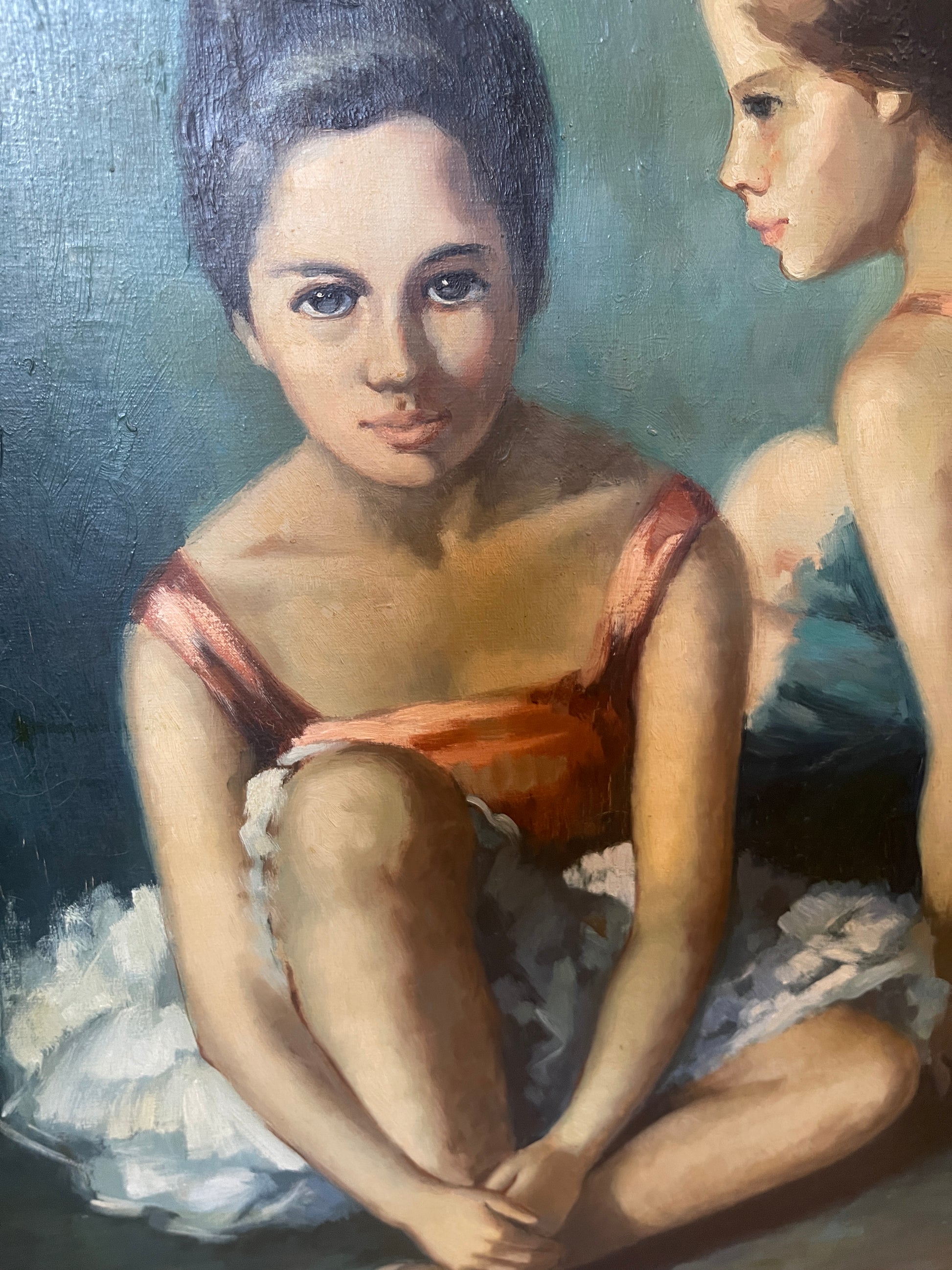 “Young Dancers Sitting” signed Ventage | Vintage Mid-Century Ballet Oil Painting