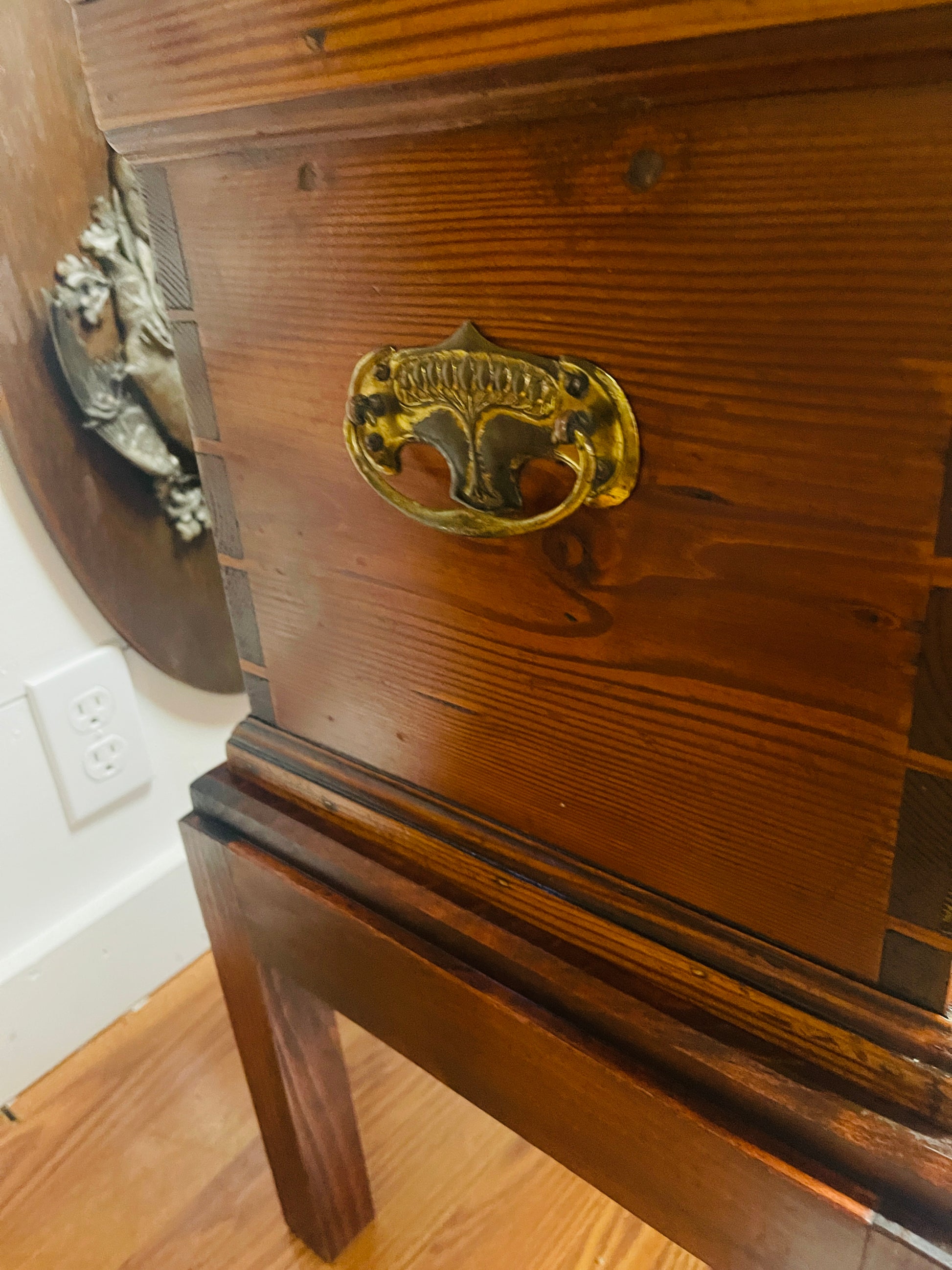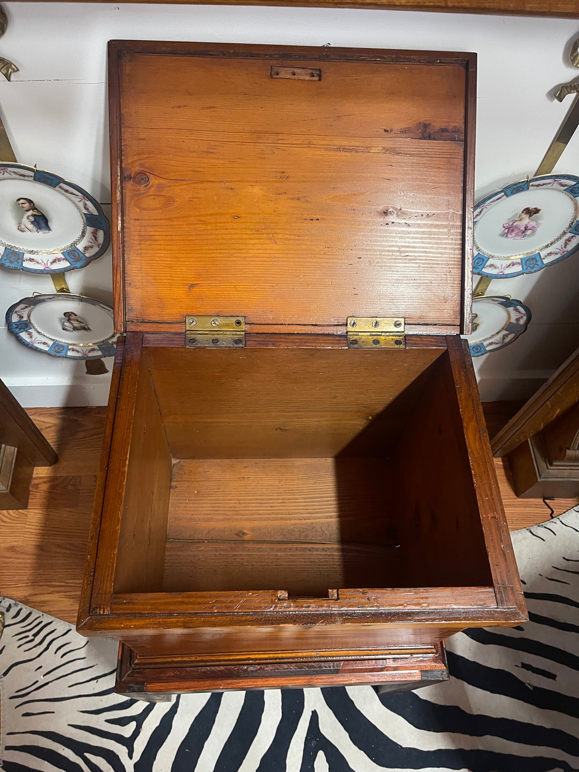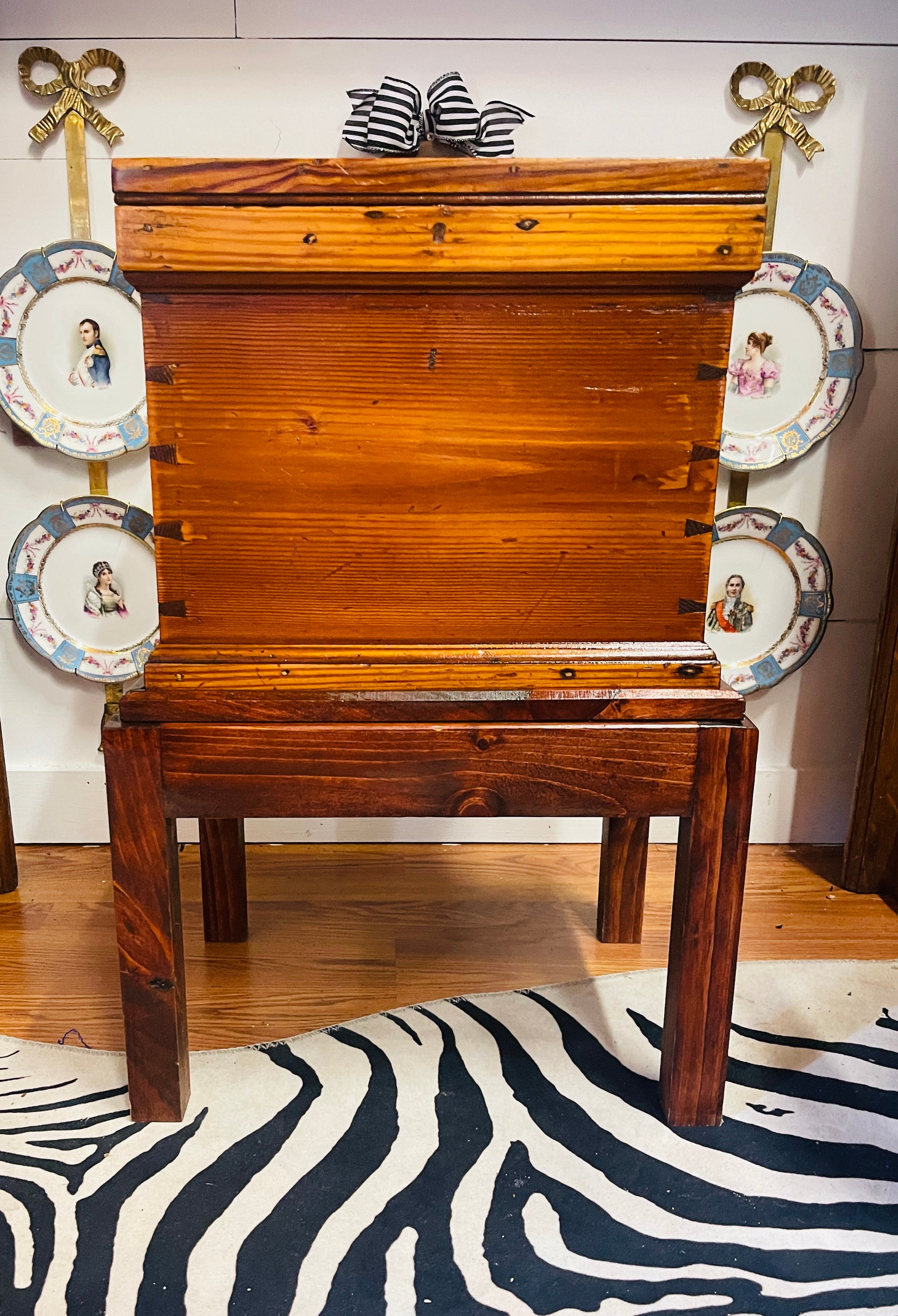 Picture a low-beamed country parlor: kettle singing, wet wellies by the door, a battered pine chest by the settle holding the family Bible, marriage lines, and last year’s seed packets. That’s the feeling this darling piece brings. Our warmly patinated pine Bible box—boarded, pegged, dovetail-style joined—now perches on a later custom stand that lifts it to perfect cottage table height. Set a lamp, a posy of garden roses, or the evening pot of tea atop; secret bits & bobs tuck neatly inside. English cottage charm with a Texas find’s heart—what a match.
