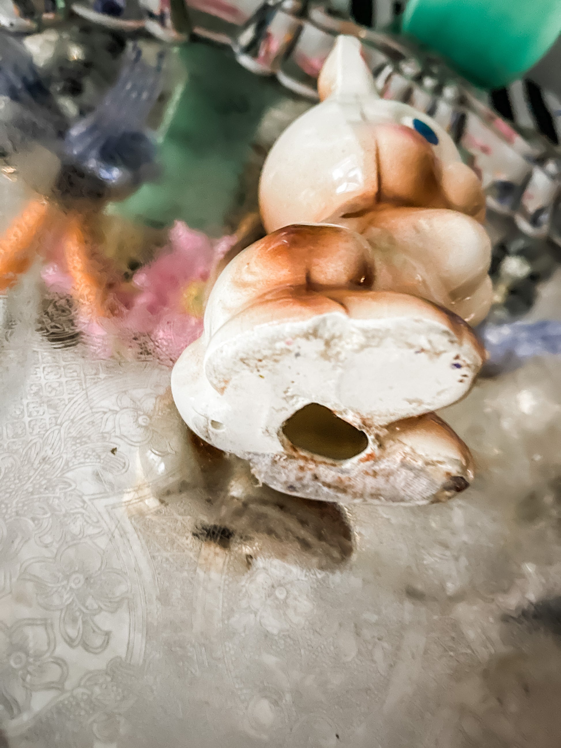Take a look at the bottom… it looks like at one time it was glued to something… and there’s a spot that looks like a chip but whim you turn it to the side it isn’t visible. Other than that, it’s in lovely estate condition.