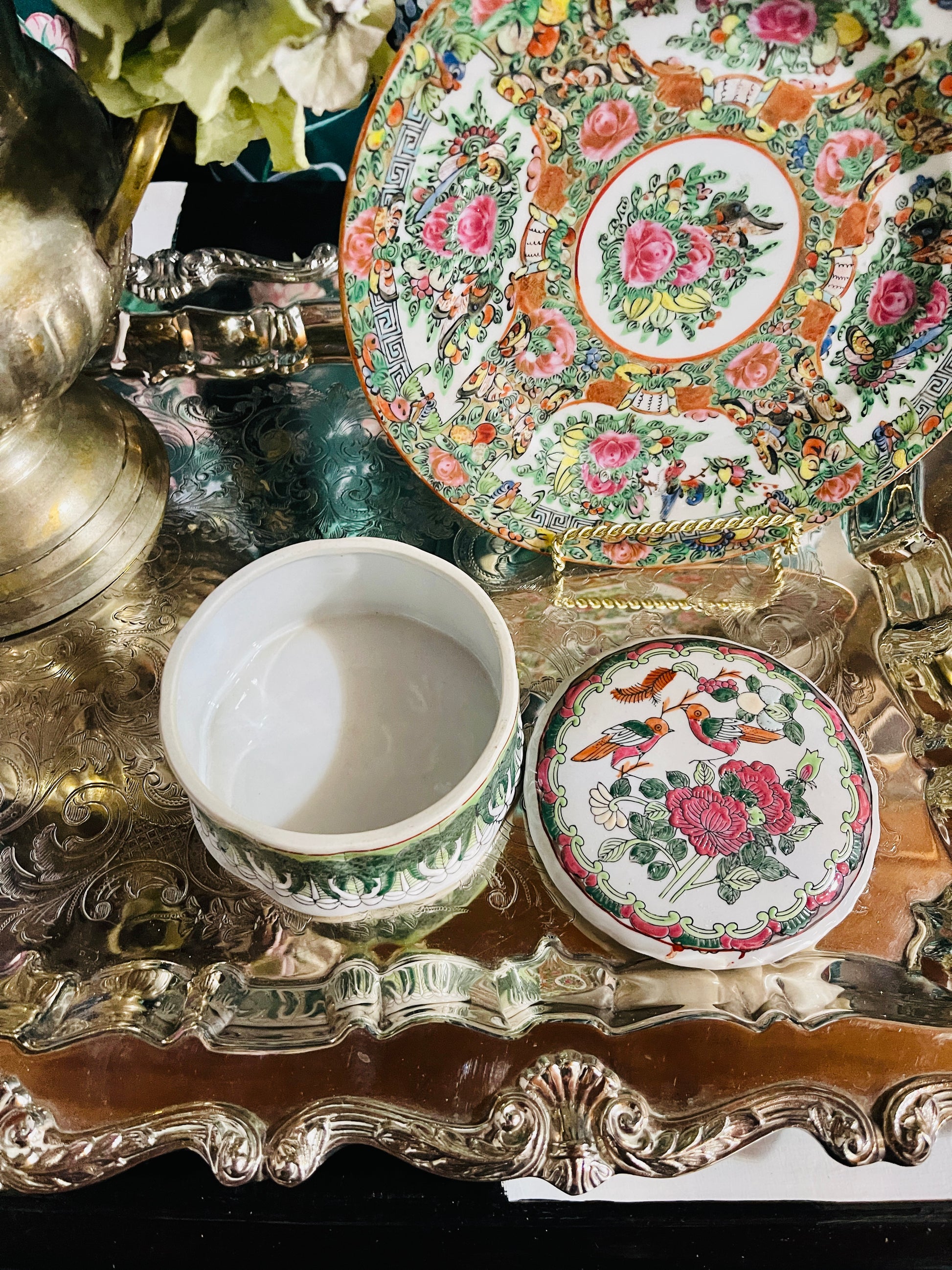 Lovely vintage bok choy/famille verte porcelain trinket box. Vibrantly detailed bok choy lines the sides of the bottom half with the lid decorated with pink florals and a pair of coloful birds.