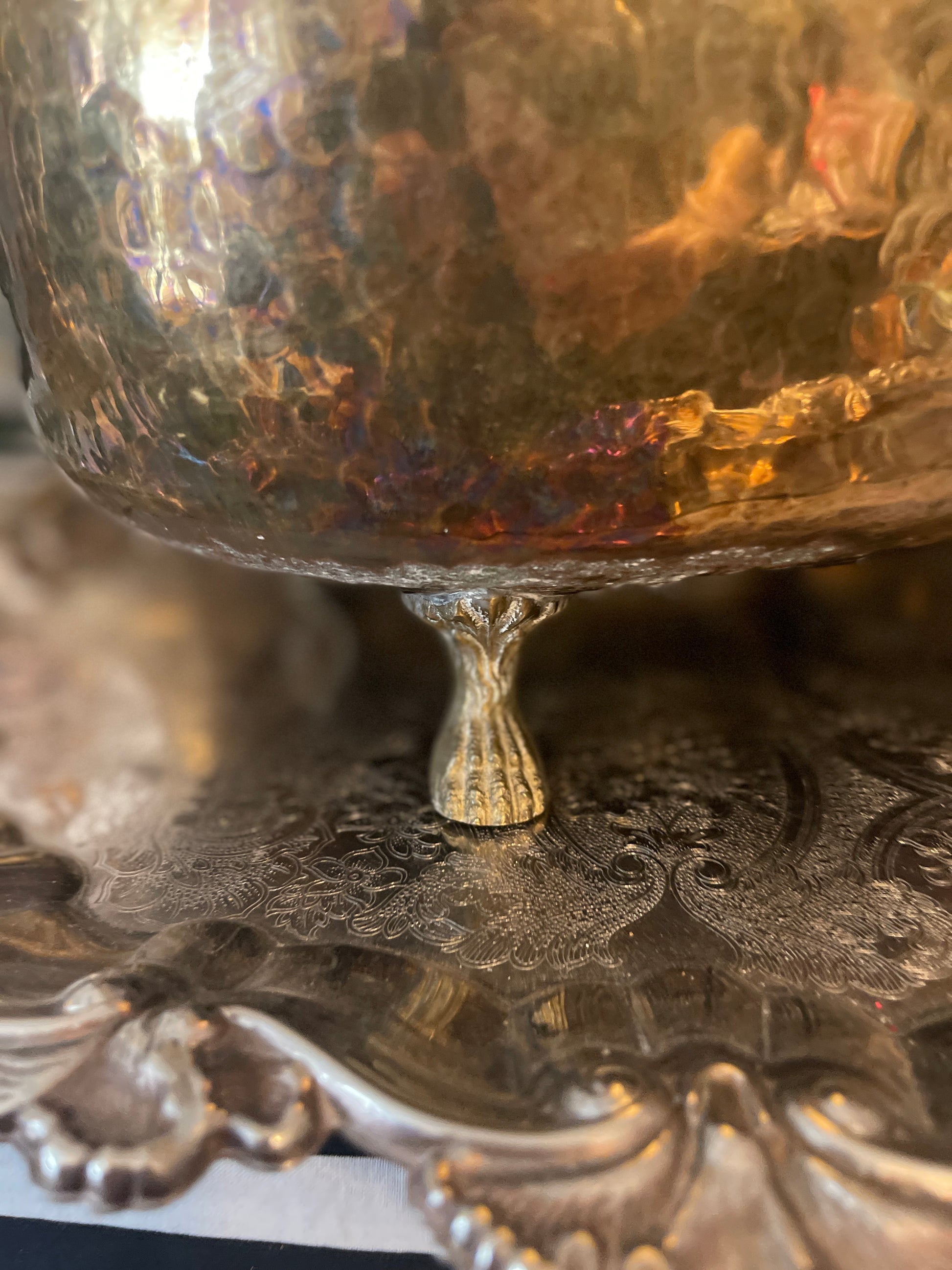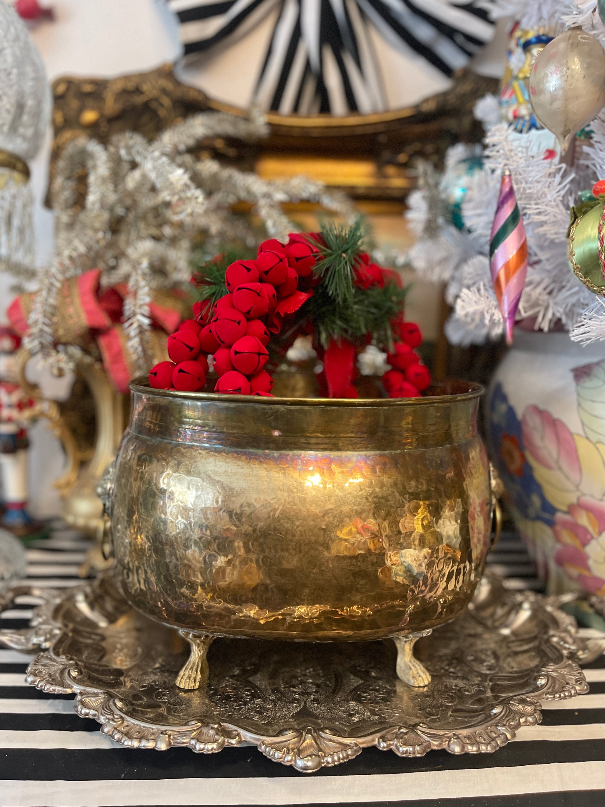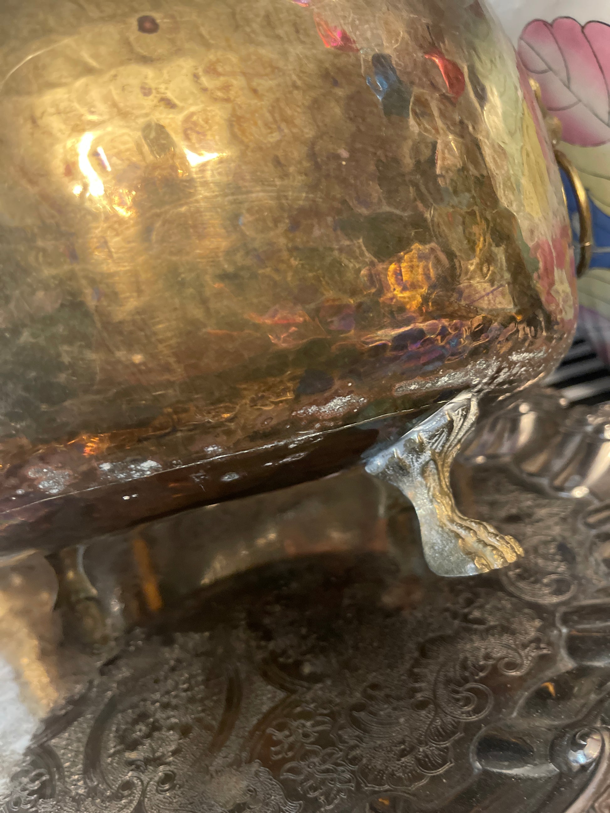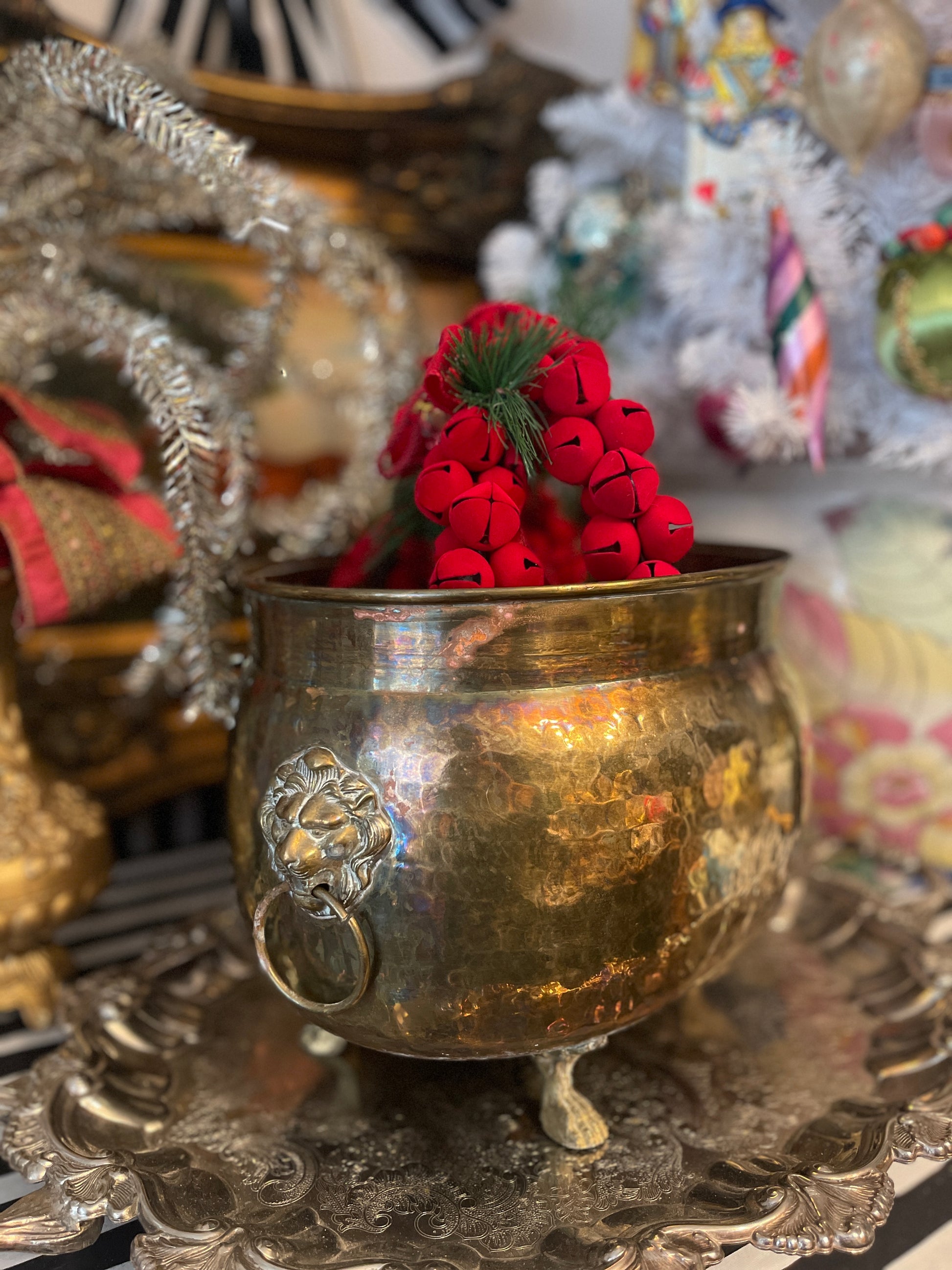 Large vintage Empire Hammered Brass Jardinière with ringed lion’s heads, paw feet, and a rolled top collar. It’s so beautifully crafted with a touch of natural verdigris and English charm.