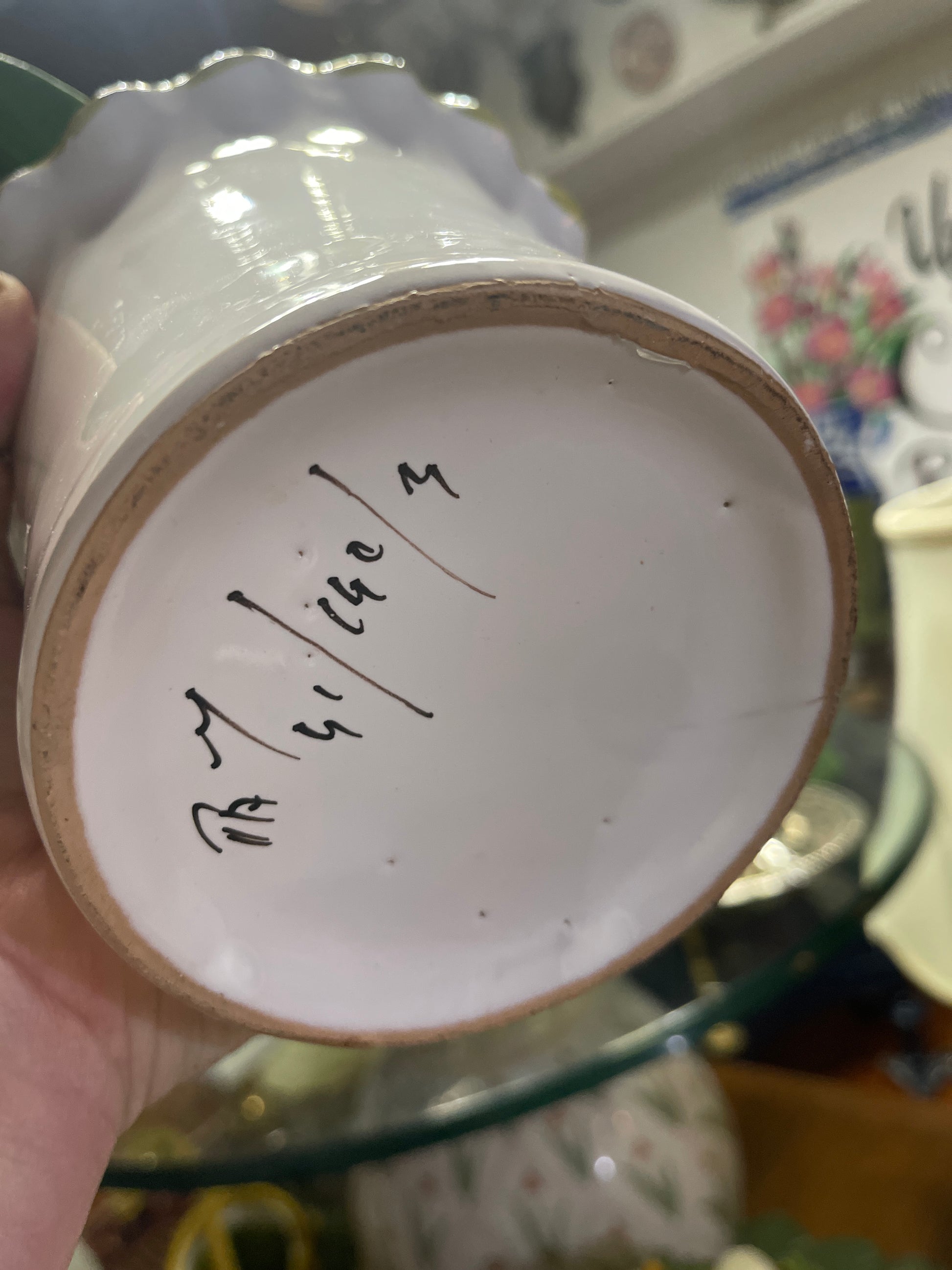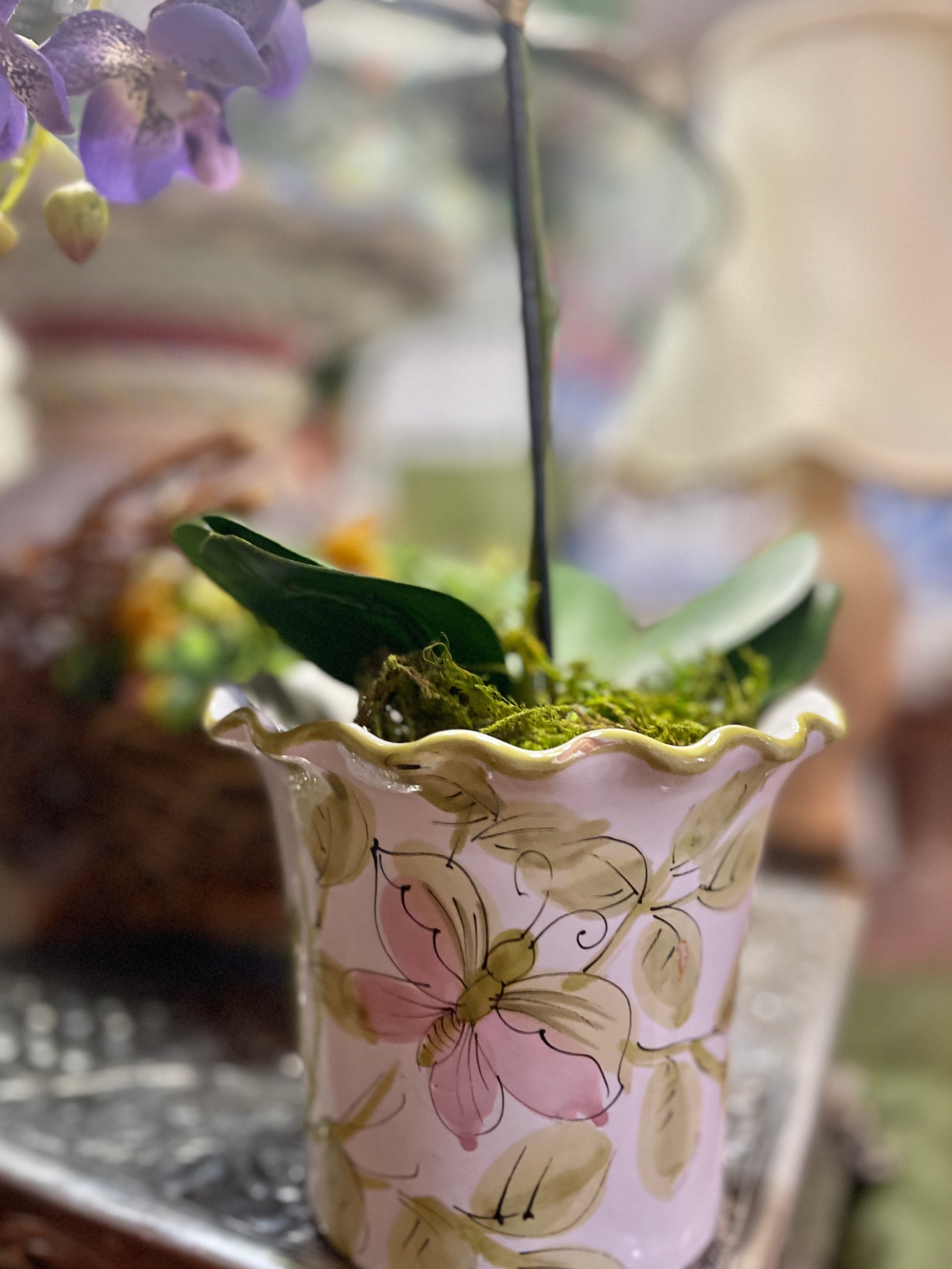Butterfly Cachepot, Made in Italy, Hand Painted, Pink and Green, Scalloped Edge