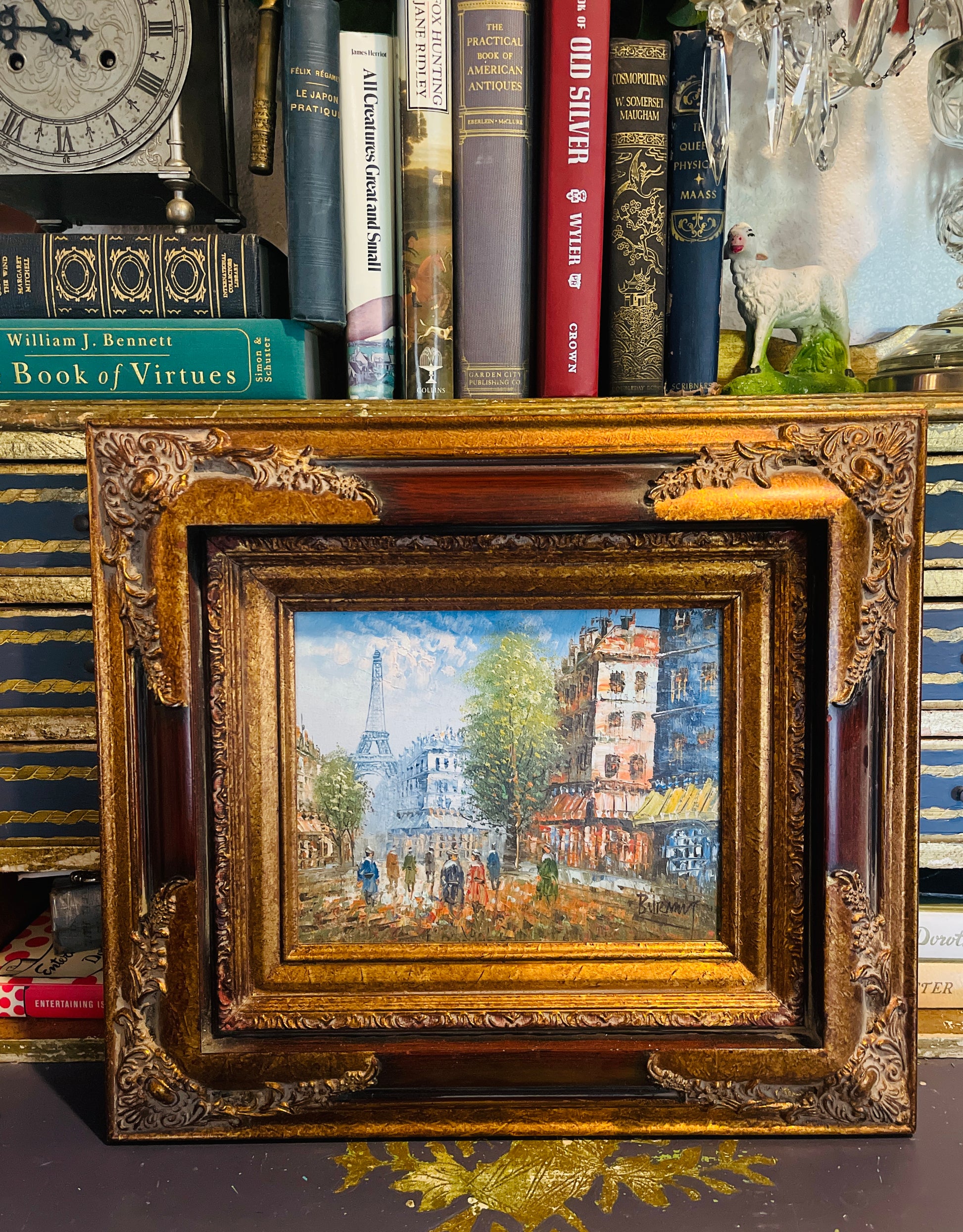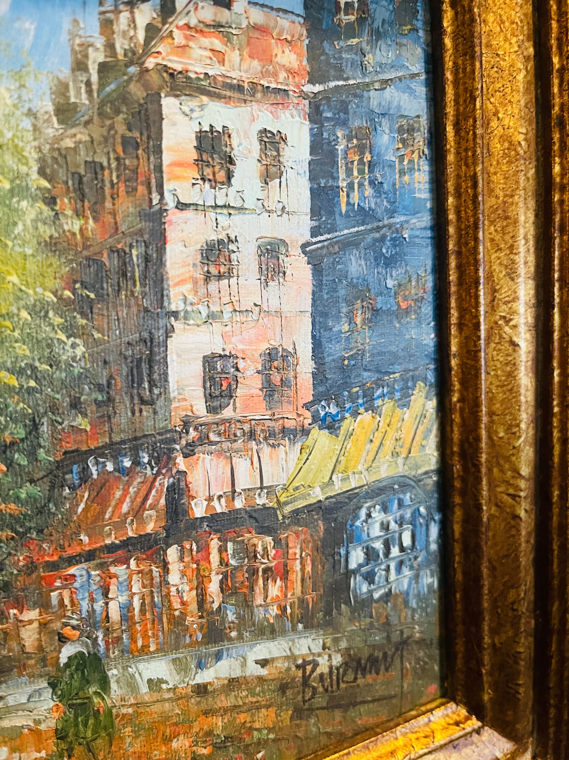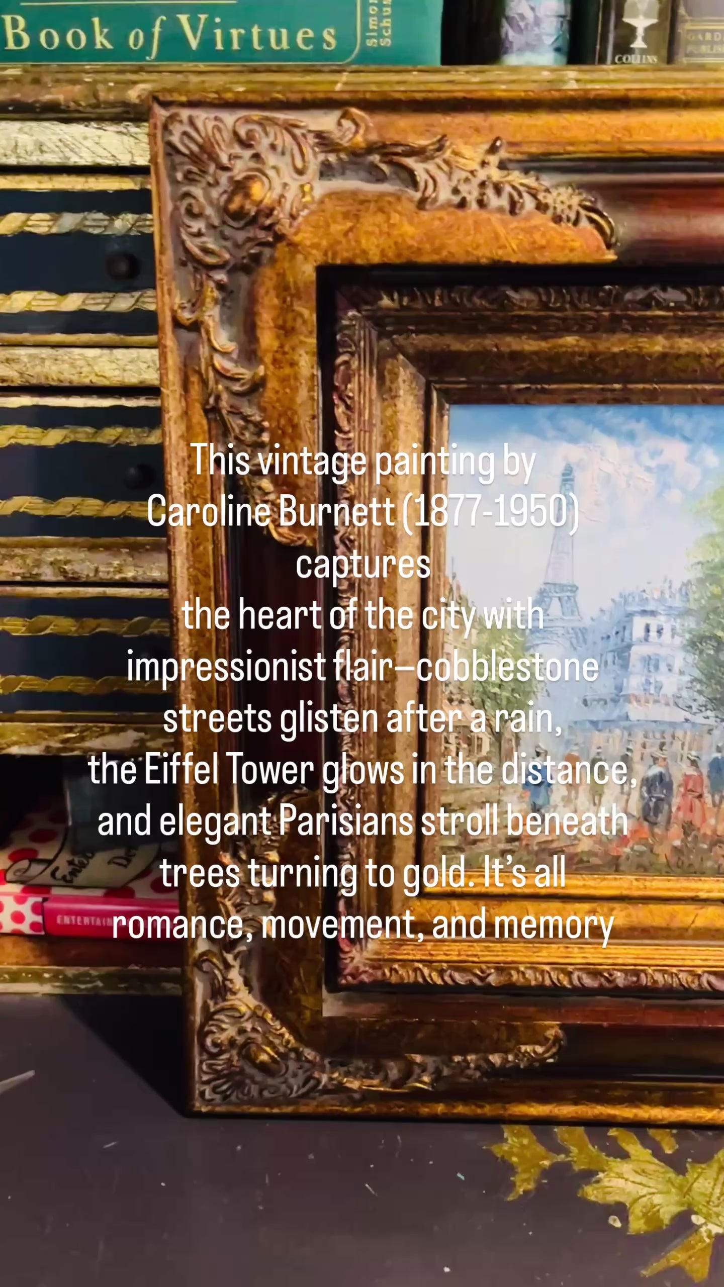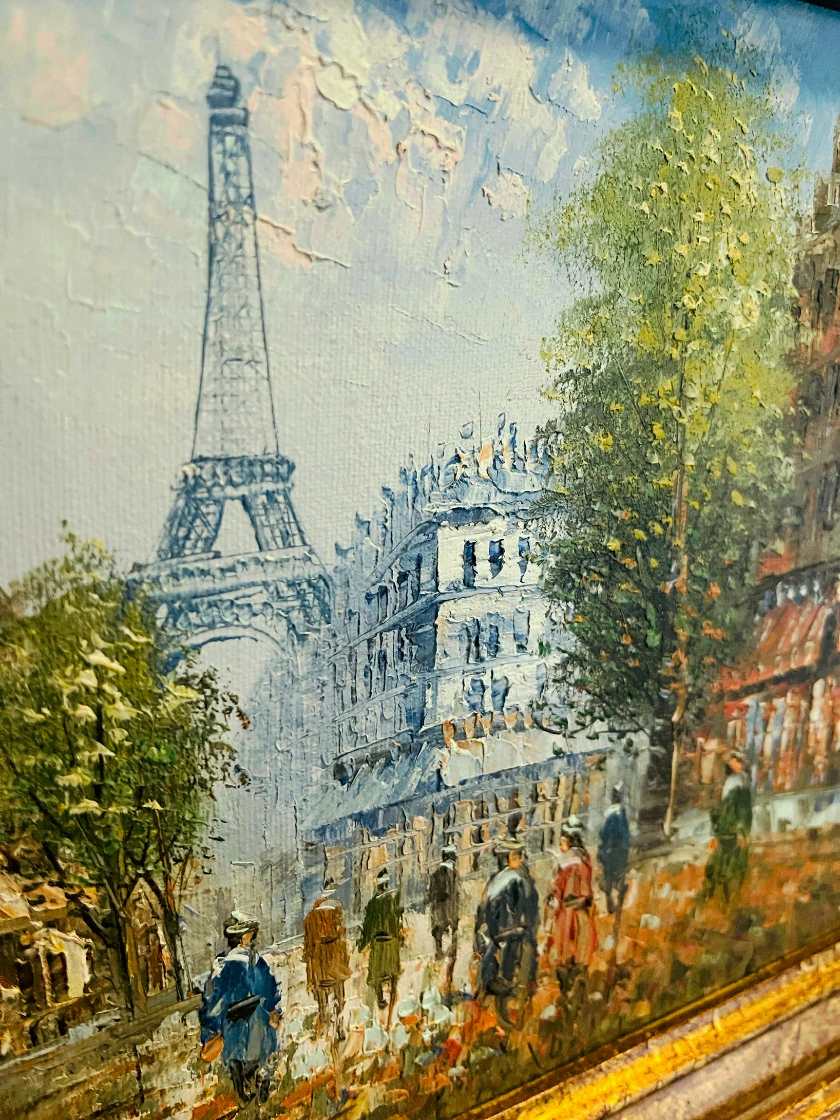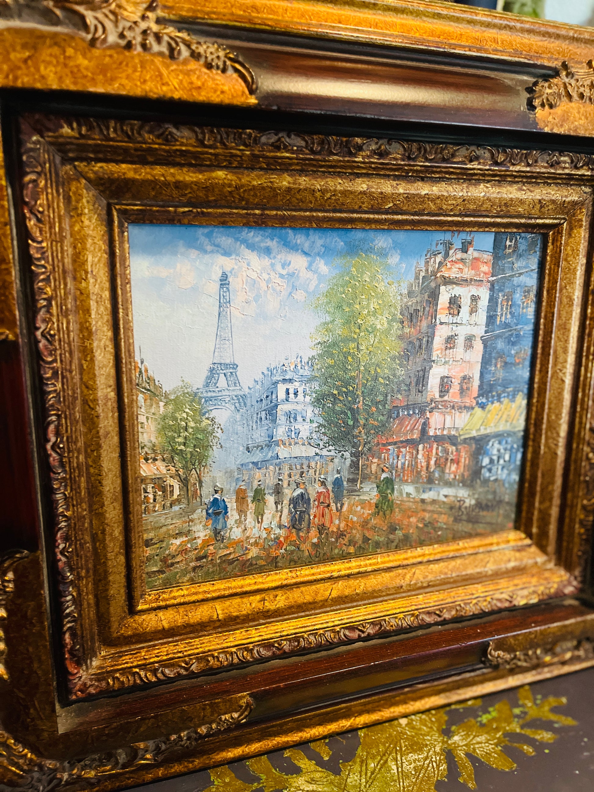 Glorious Caroline Burnett(1877-1950) painting of a bustling Parisian street scene with the Eiffel Tower in the distance. The colors are links, blues, greens, deep corals…this artist is world renowned for her bold use of color and thick use of paint.