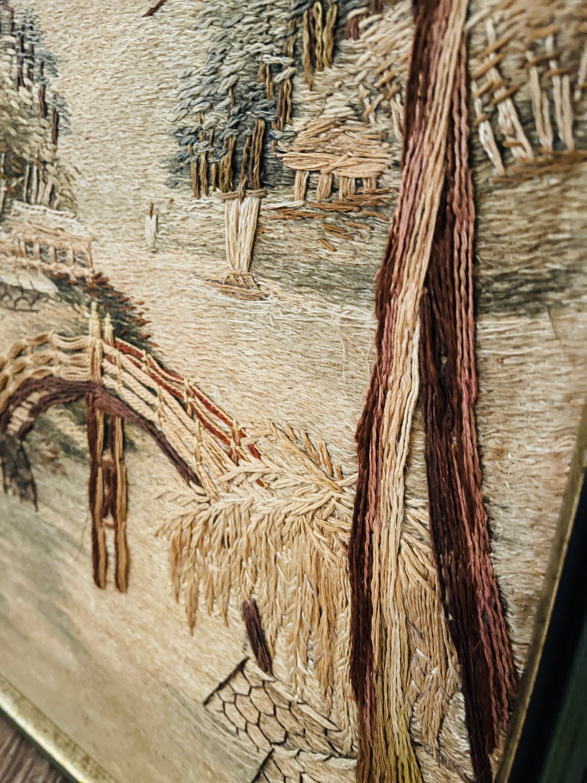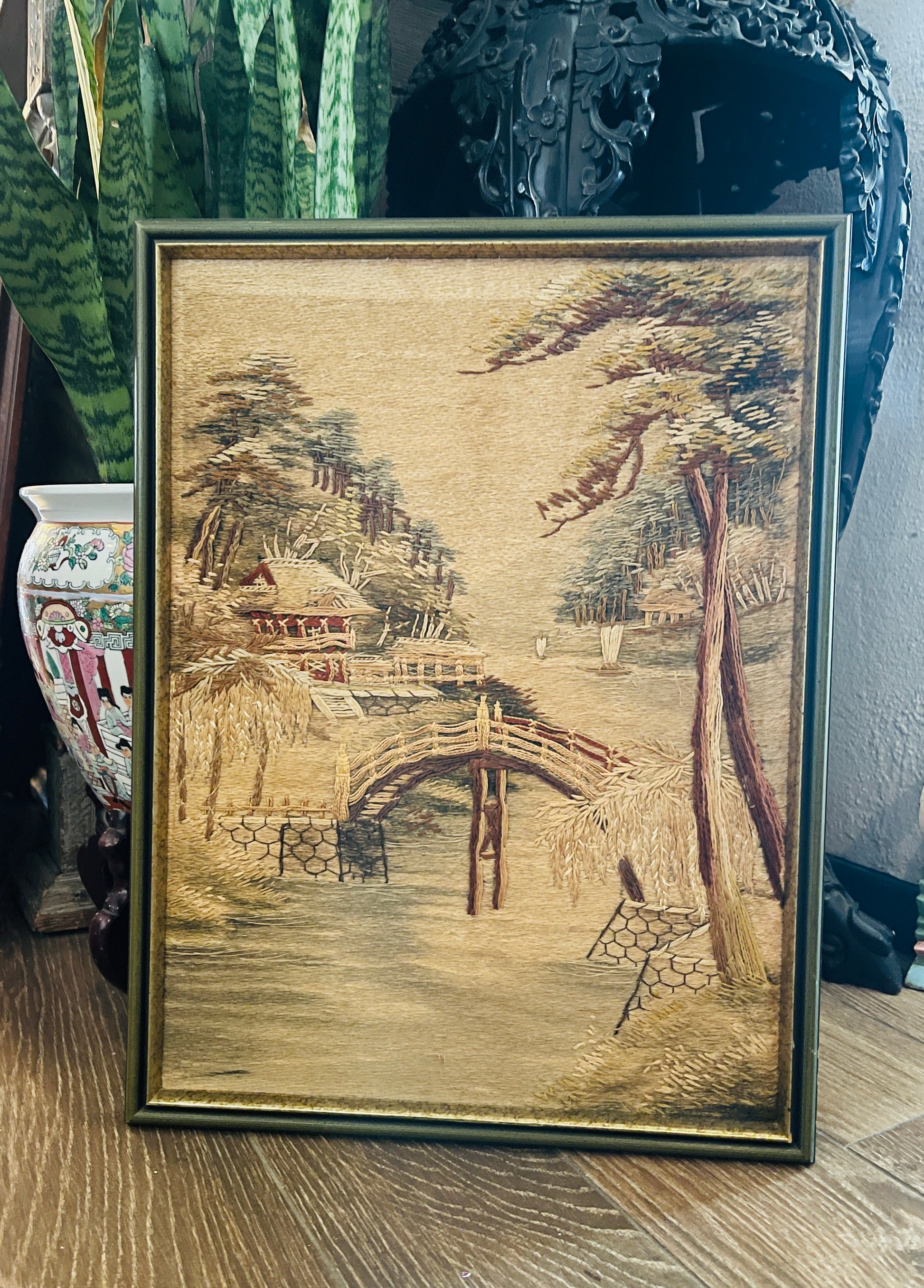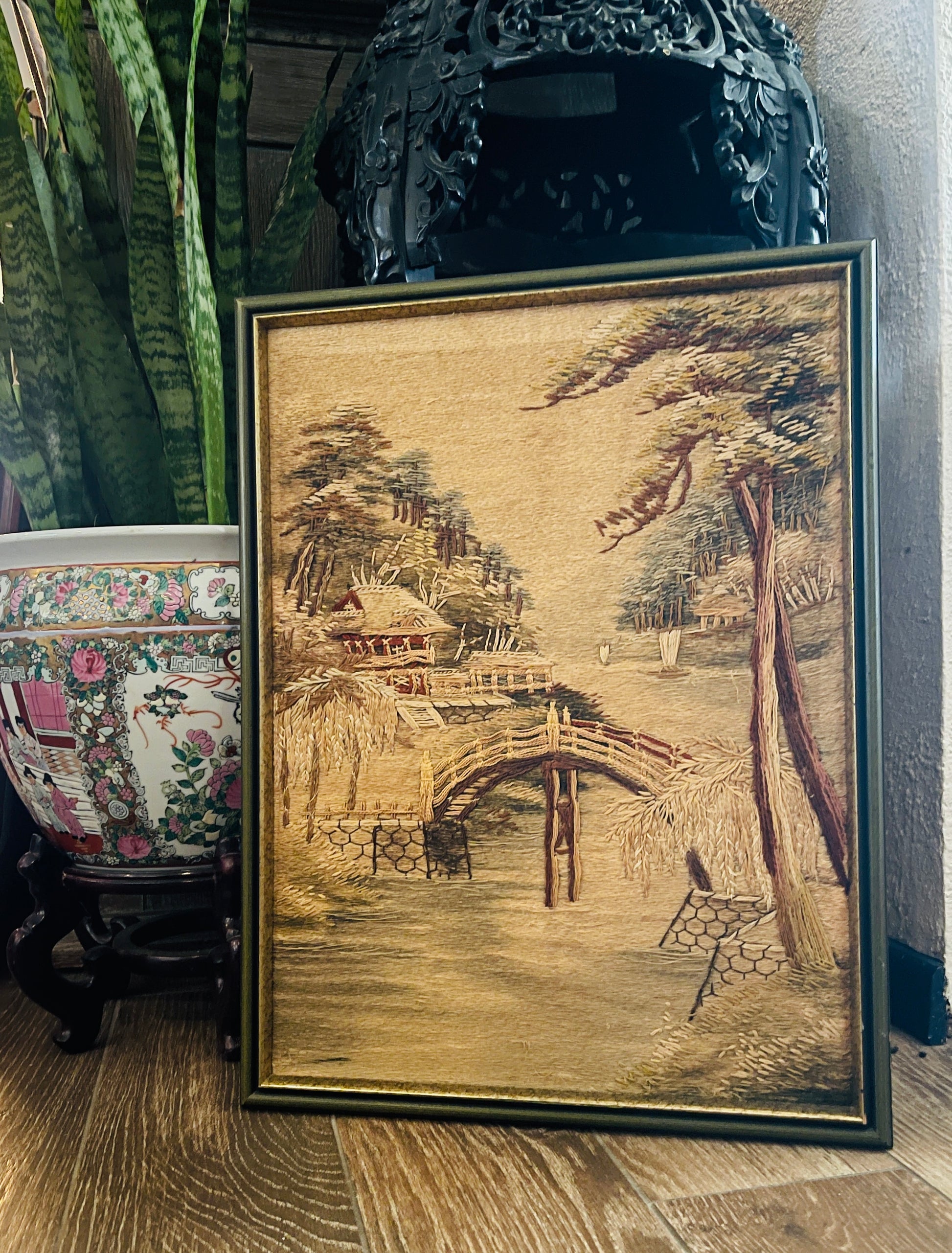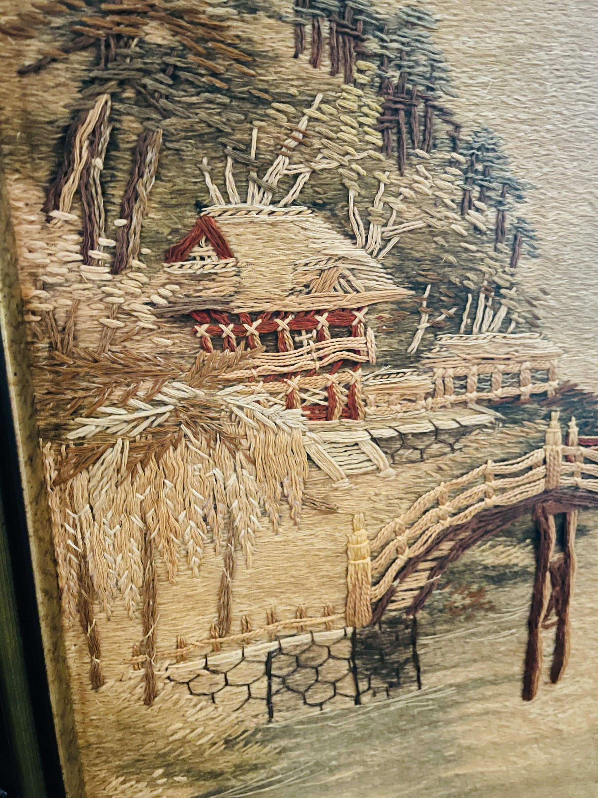 Mid Century Chinoiserie Crewel. So much detail in this fantastic piece. Layers of thread in varying shades and weights artfully craft the Japanese scene of a pagoda, trees, bridge and waterway.