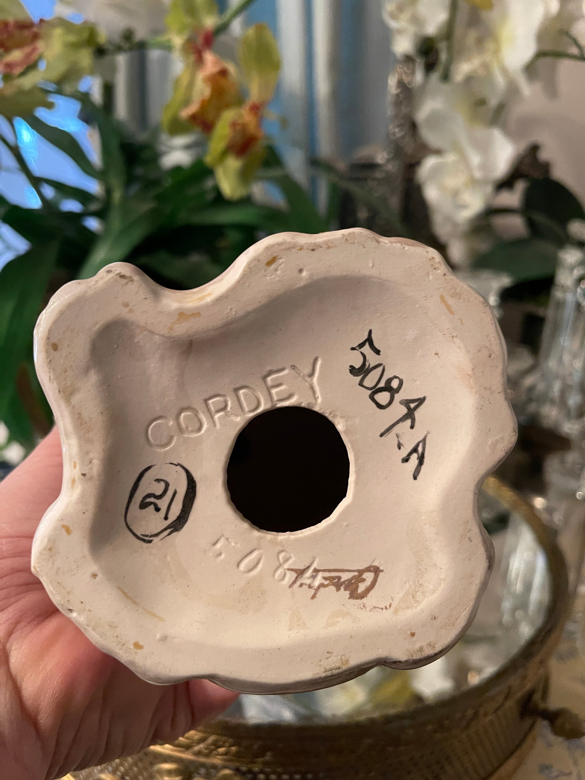 Showcasing the wonderfully playful charm that made Cordey so beloved, this statuette shows the delicately hand-painted details, soft nuances, flowing drapery, and sculpted lace-like textures giving that romantic, theatrical quality reminiscent of Versailles salon décor… No two are exactly the same.