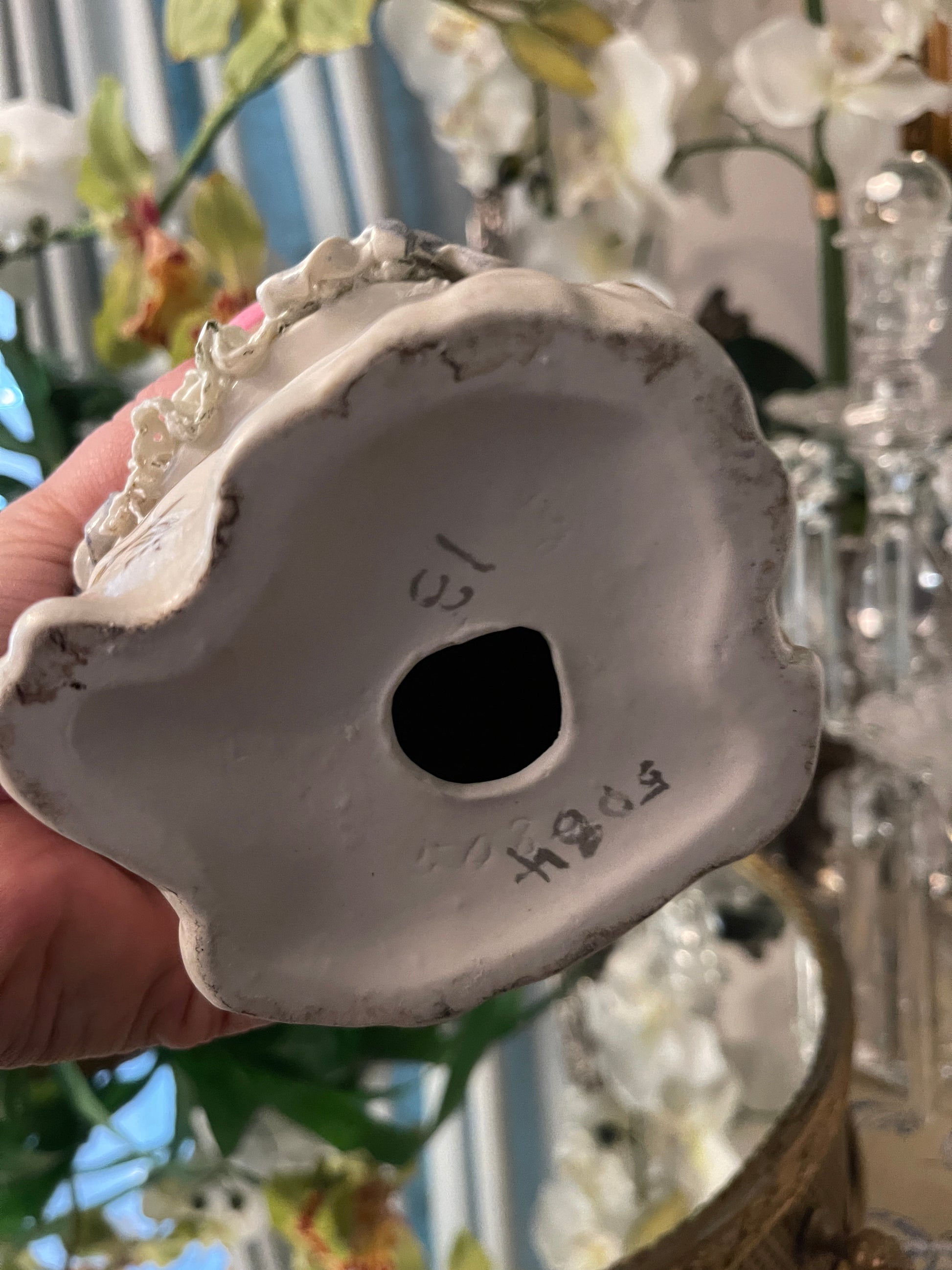 Showcasing the wonderfully playful charm that made Cordey so beloved, this statuette shows the delicately hand-painted details, soft nuances, flowing drapery, and sculpted lace-like textures giving that romantic, theatrical quality reminiscent of Versailles salon décor… No two are exactly the same.