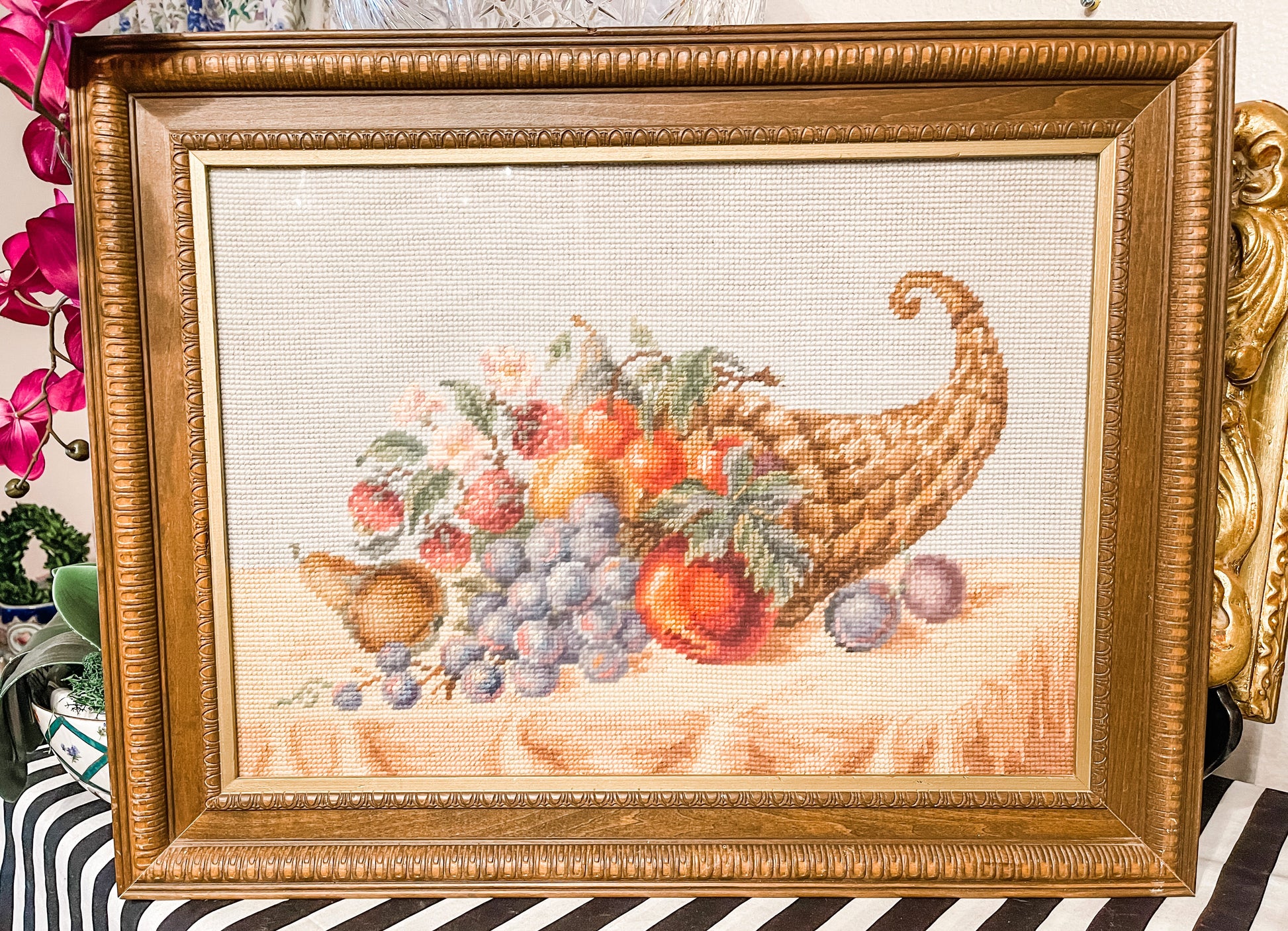 Vintage Cornucopia Needlepoint, Bountiful Harvest Cornucopia Needlepoint, Framed