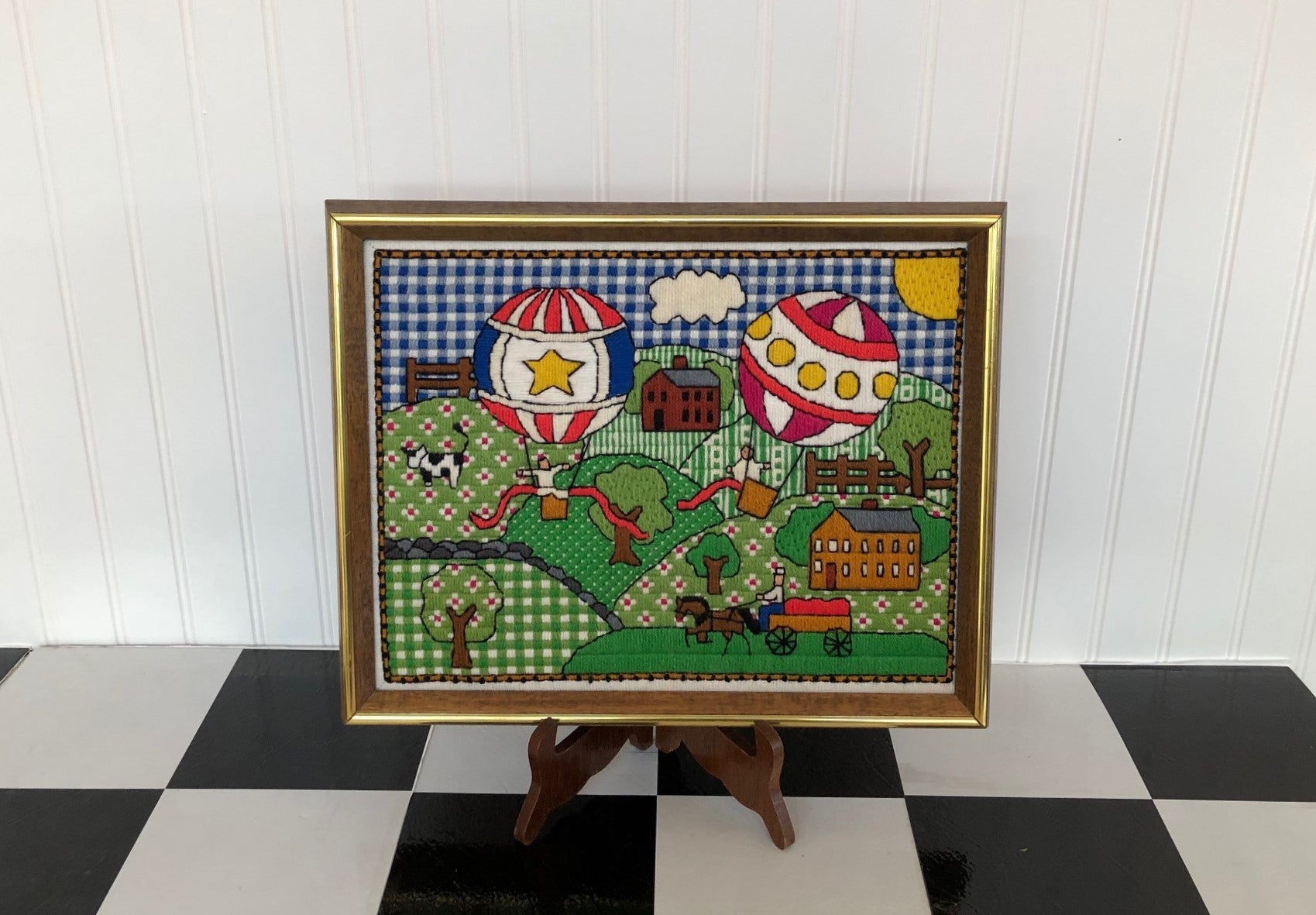 Vintage Crewelwork Wall Hanging, Blue and White Gingham, Hot Air Balloons, Green and White Gingham