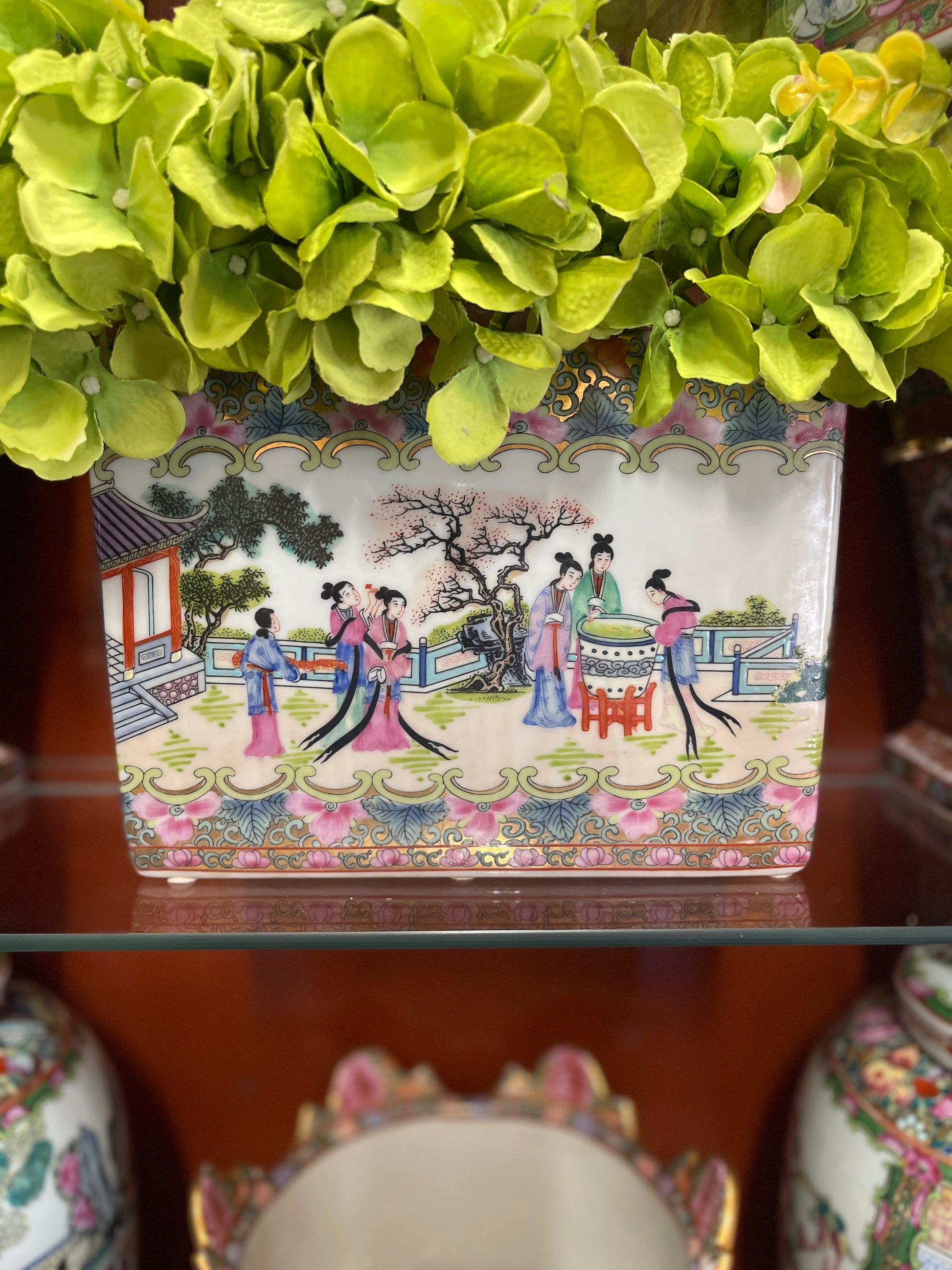 Vintage 20th century Chinese Export Famille Rose Block Cache Pot Planter with hand painted bird and butterfly floral panels between Famille palace courtyard scenes. Marked as shown. The colors are vibrant and the details crisp.
