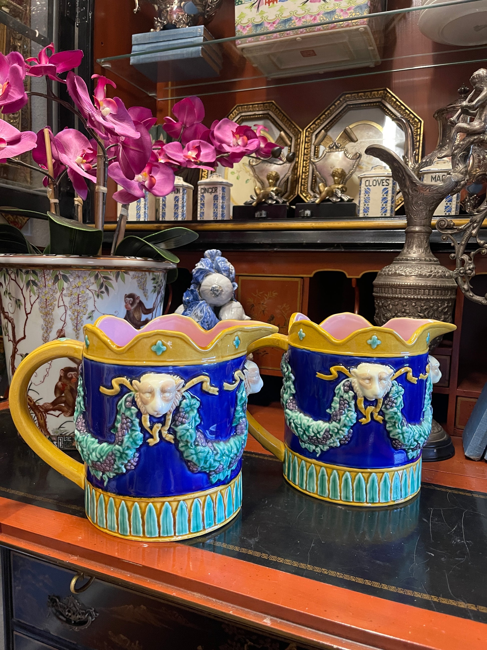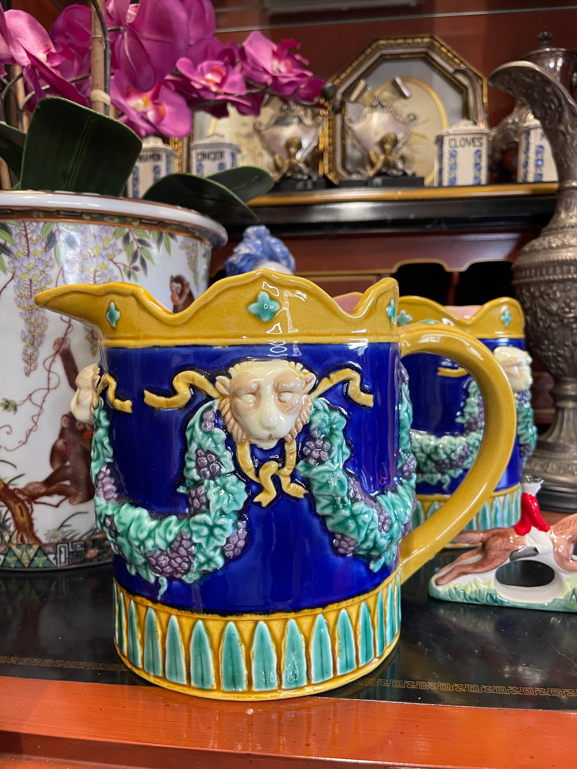 Add a splash of Victorian whimsy to your collection with this showstopping Fitz and Floyd majolica-style pitcher—an exuberant piece clearly inspired by the famed 19th-century ceramics of George Jones. With a cheeky monkey head peeking out from scrolling grapevines in high relief, this pitcher captures the opulence and playfulness that defined the Victorian love of animalia and theatrical design.