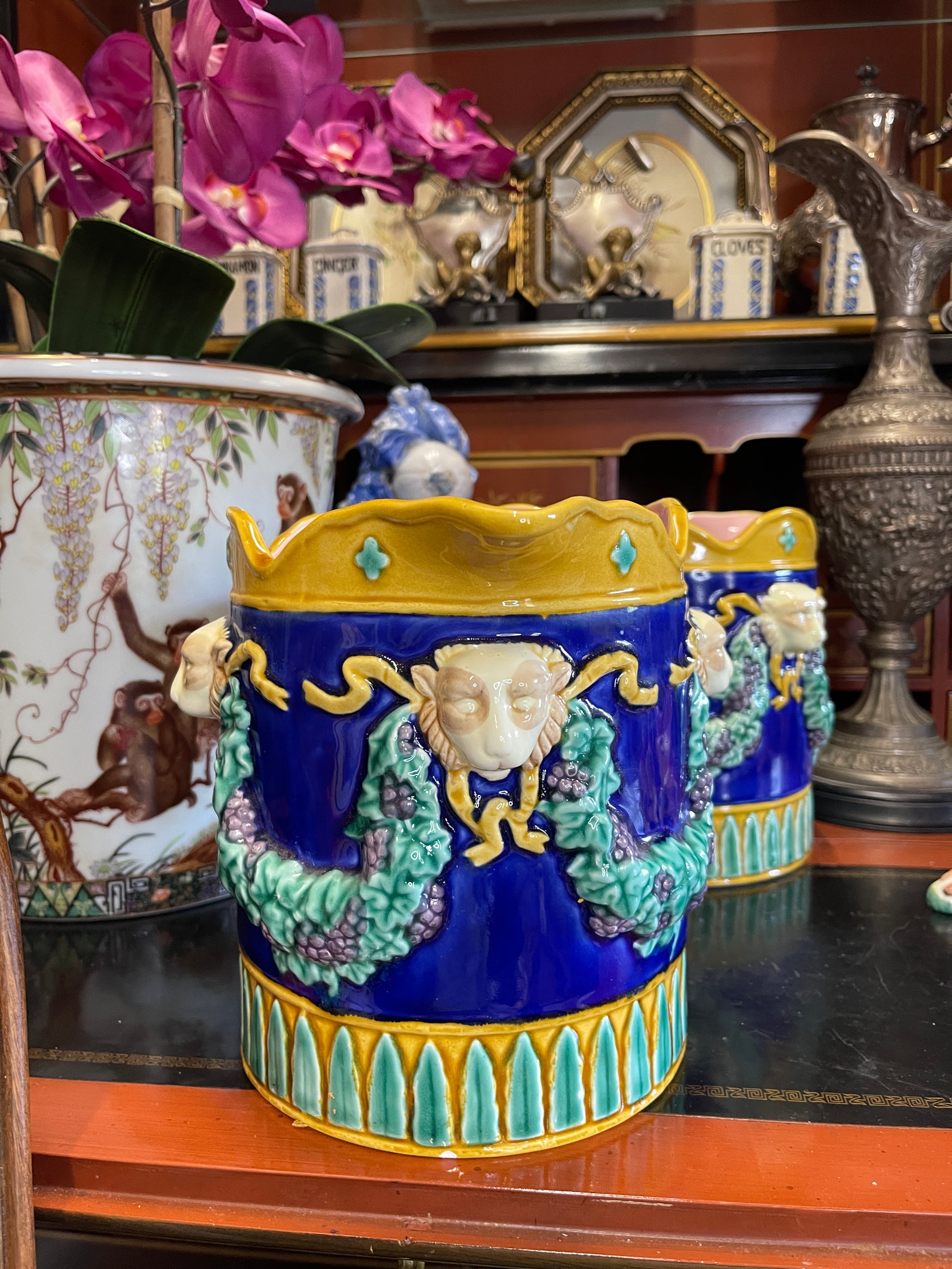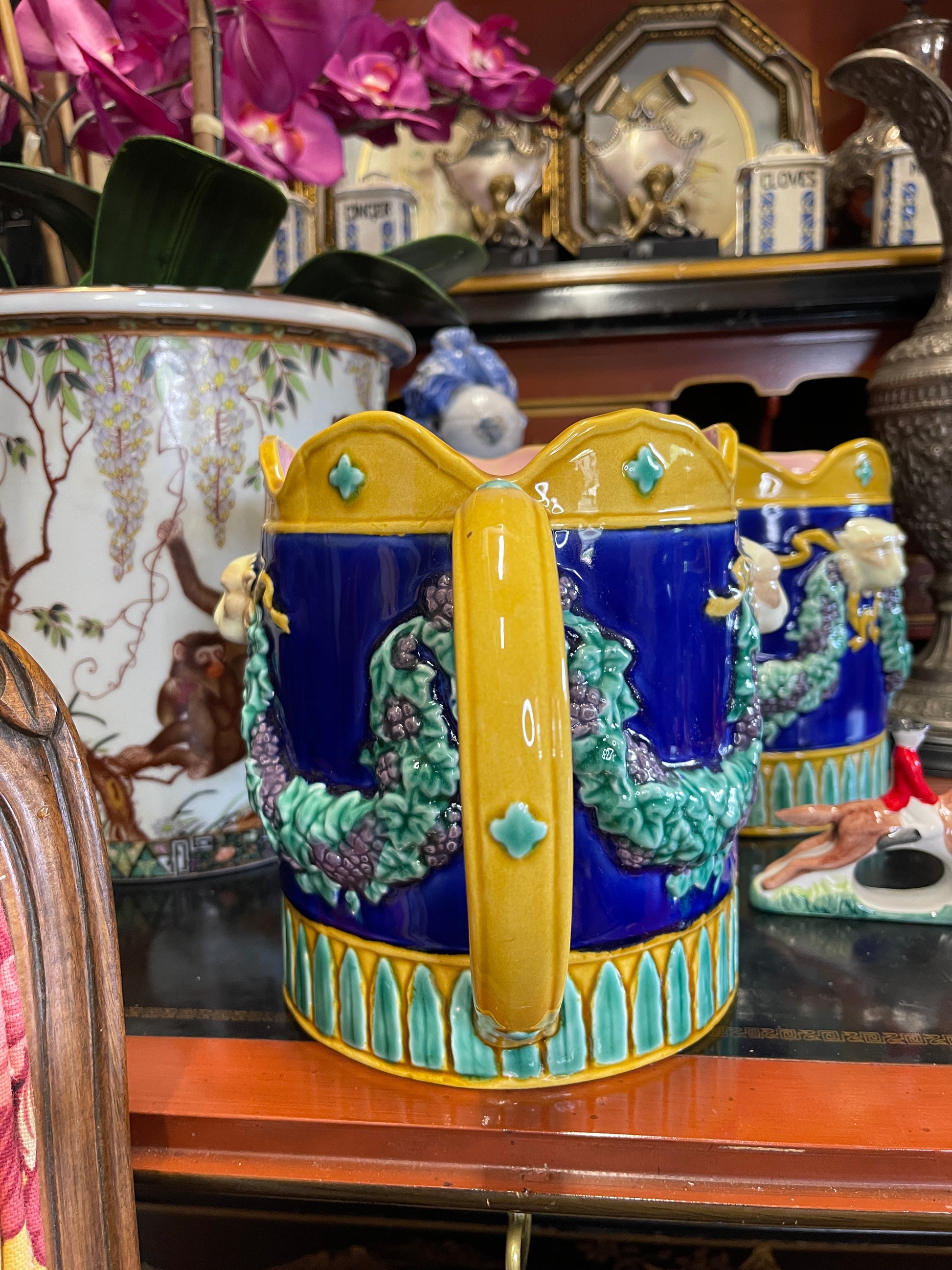 Style Tip: Use it as a flamboyant vase, a bar cart centerpiece, or let it sit proudly on a shelf where it can catch the light—and compliments. A fantastic addition for majolica collectors, eclectic decorators, or anyone with a flair for the theatrical.