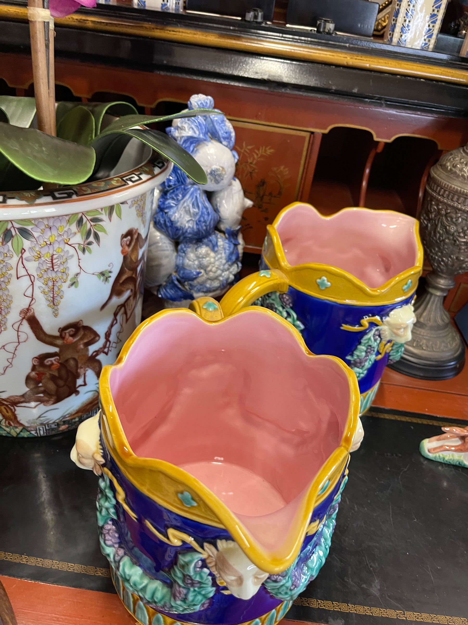 Fitz and Floyd Majolica-Style Pitcher – Monkey Head & Grape Vine Relief | In the Manner of George Jones, TWO AVAILABLE