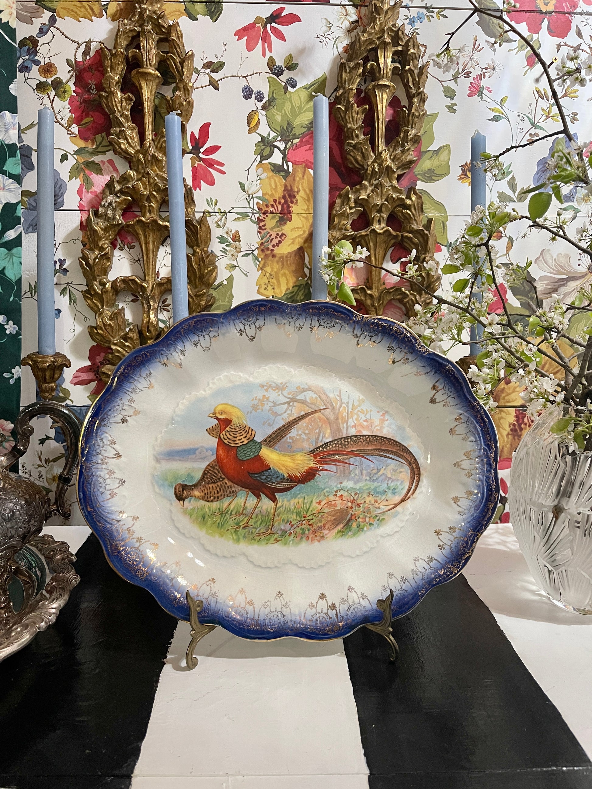Flow Blue Antique Pheasant Platter, Estate Decor