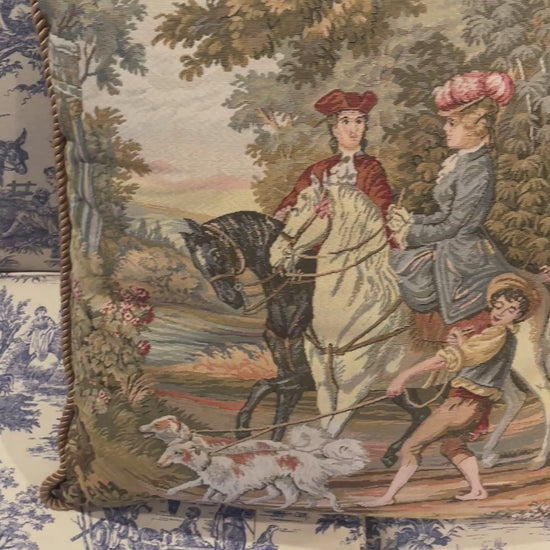 A tapestry of pure enchantment — this antique French Aubusson pillow captures a moment of timeless leisure straight from the gardens of Versailles. A noble lady and gentleman ride side by side through the countryside, their graceful horses mid-stride, as two elegant hounds trot faithfully at their feet. The colors are soft yet sumptuous — rose, ivory, and moss — with every thread whispering of French refinement and pastoral poetry. It’s backed in a camel colored suede.