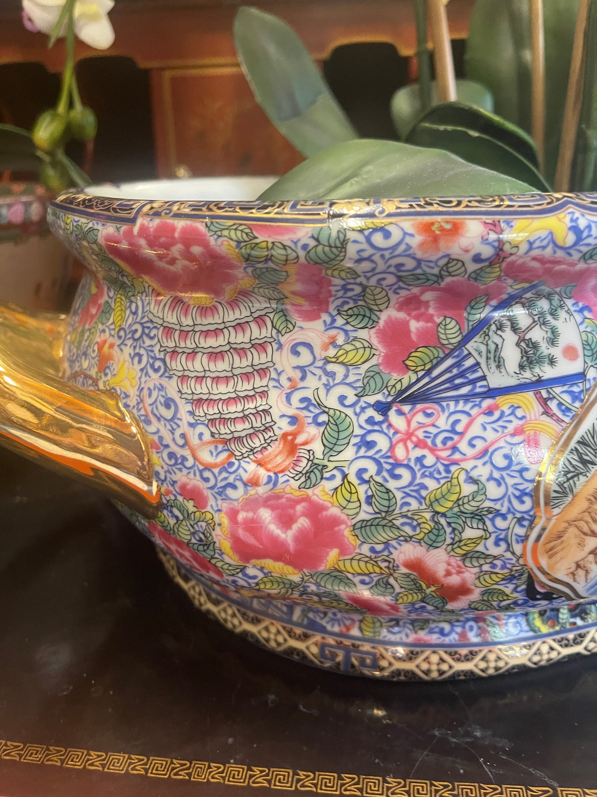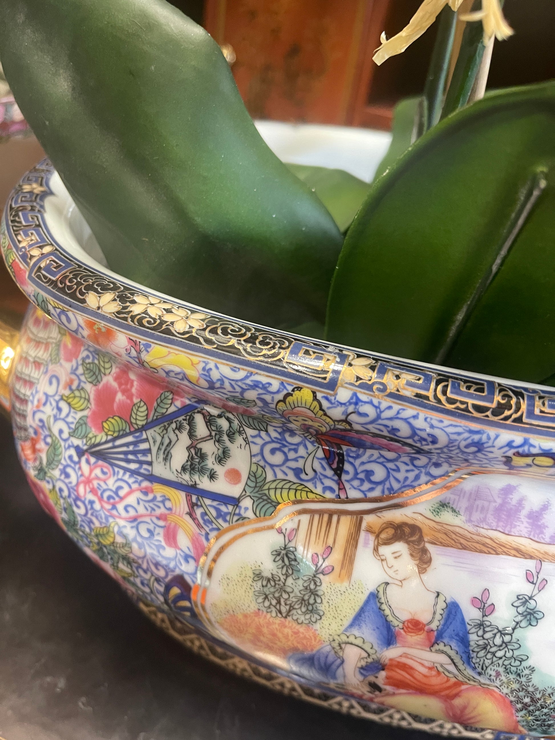 Vintage 20th century porcelain Footbath planter with two coordinating French figural scenes in nature including a sweet playful pup, butterflies and chinoiserie fans. The colors are vibrant and the details crisp. Gilt handles. Unmarked.