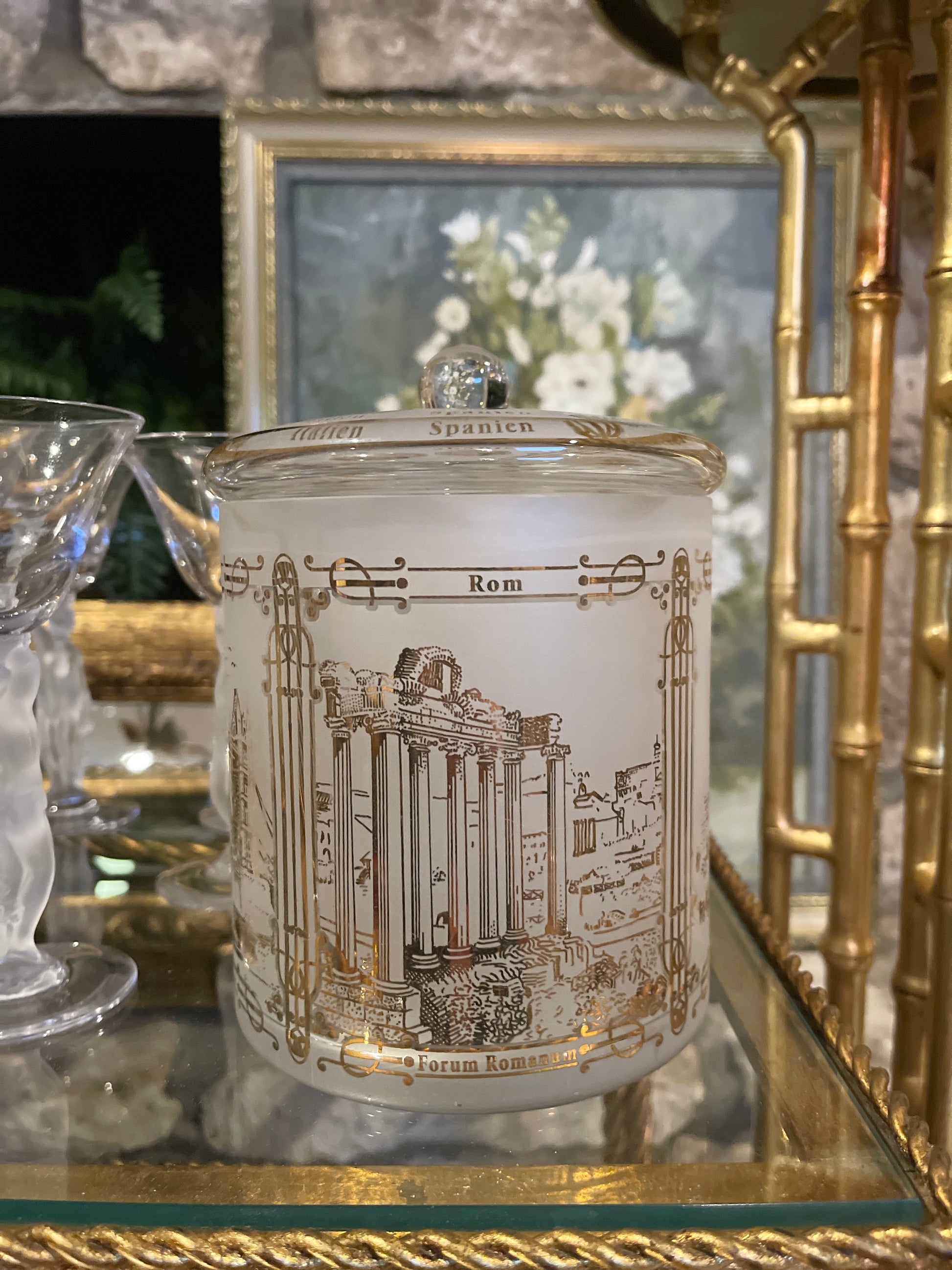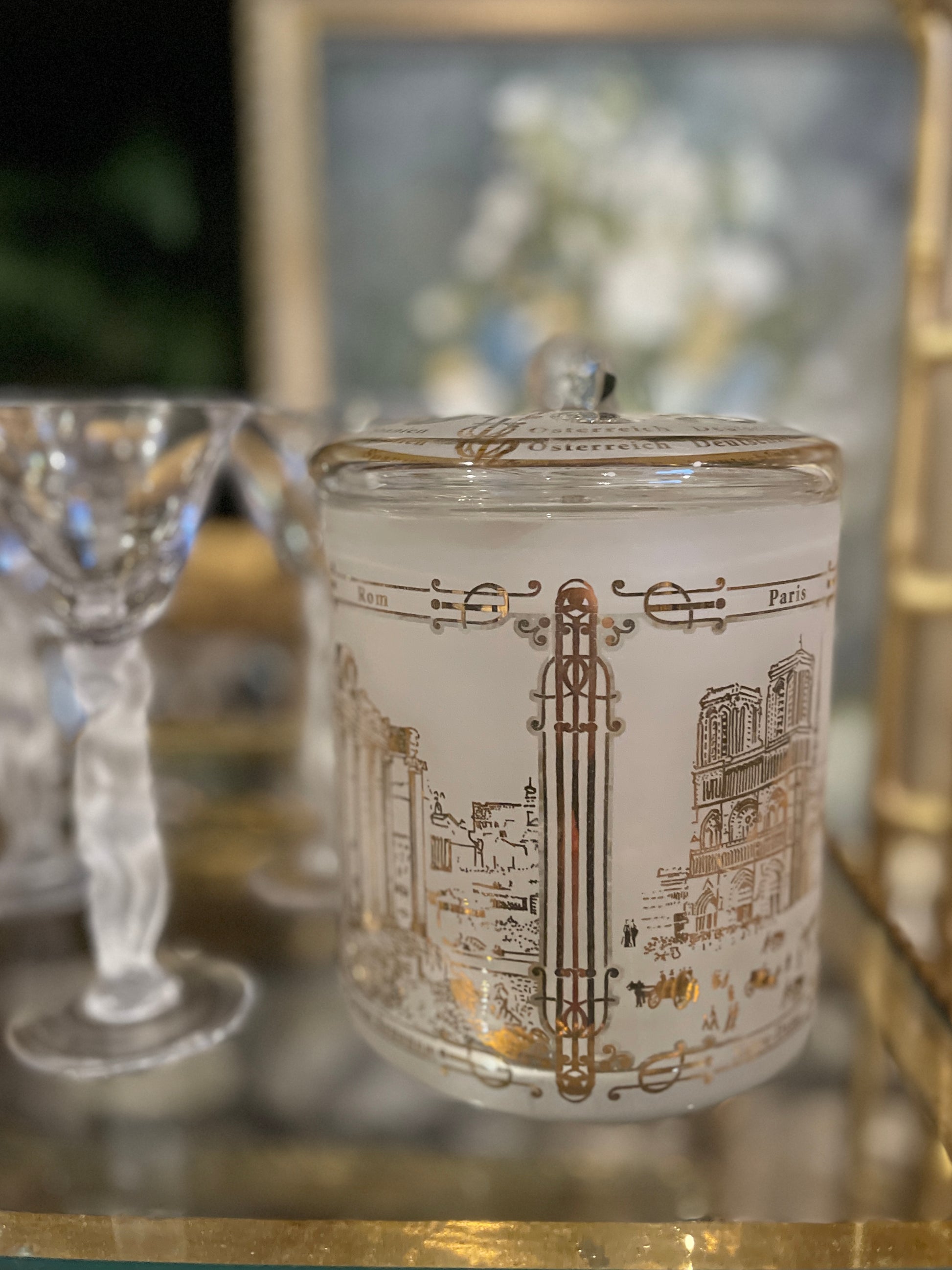 Lebkuchen Schmidt Lidded Canister, Frosted Glass, Gilt Scenes from Paris and London