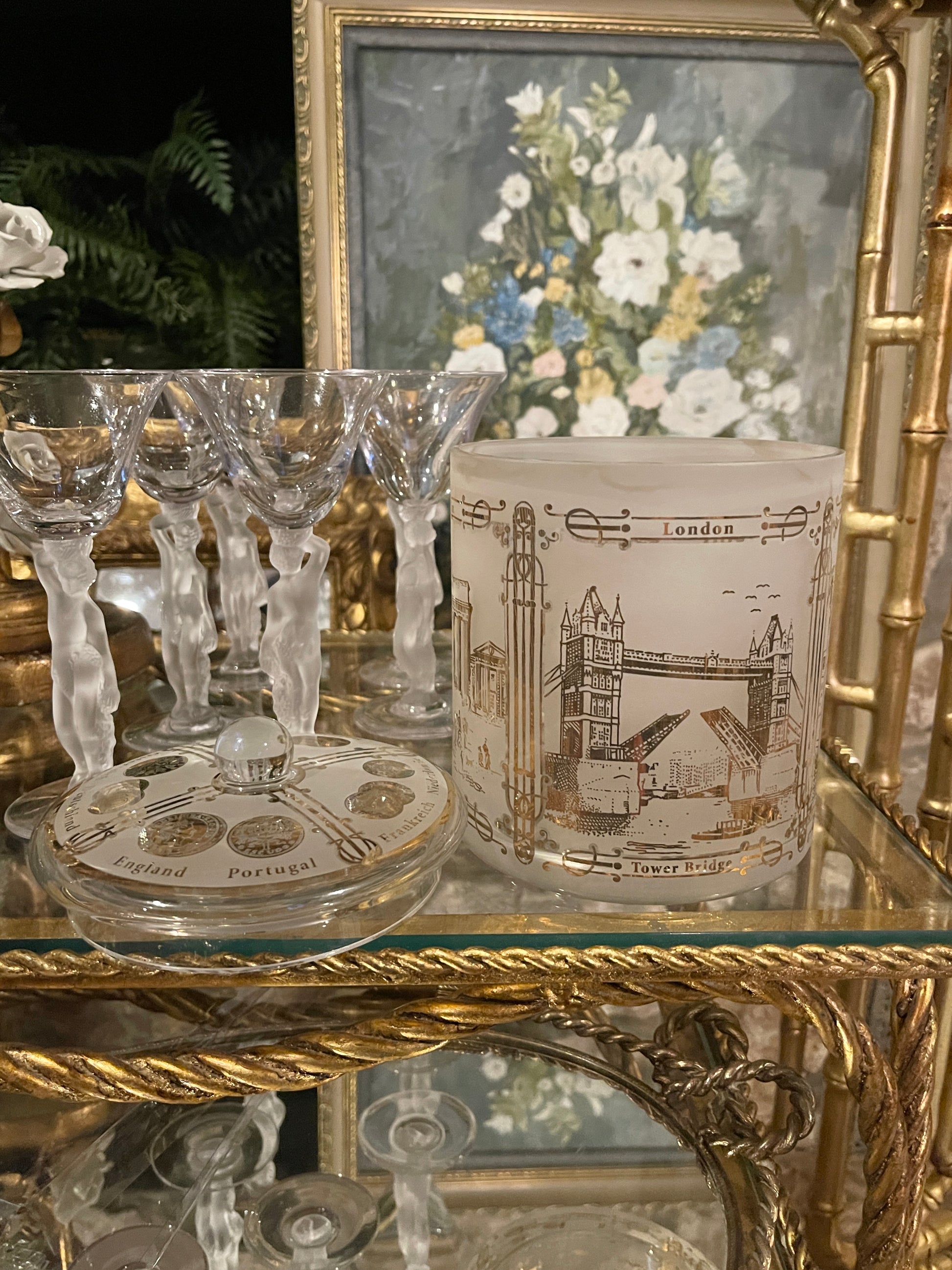 This piece immediately caught my eye! It’s frosted glass with gilt scenes of Notre Dame in Paris, Brandenburger in Berlin, The Tower Bridge in London, and, the Forum in Rome. It was made exclusively for Lebkuchen Schmidt and is marked on the reverse.