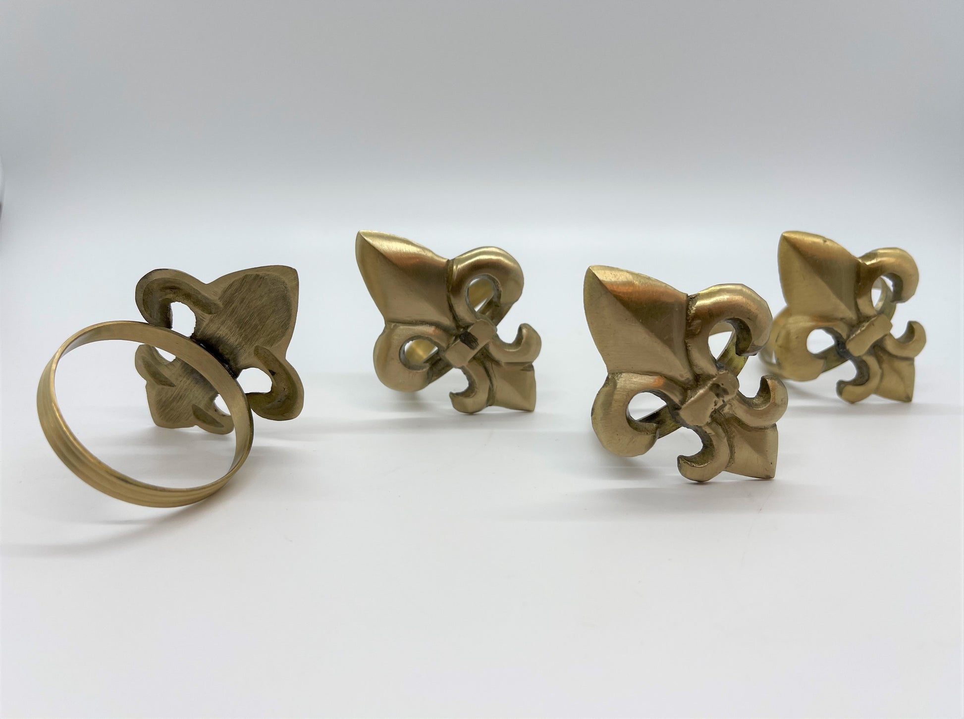 Set of 4 Brushed Gold-Tole Fleur De Lis Napkin Rings. Such a great accent to any table. Please see all pictures as they are considered part of the description.