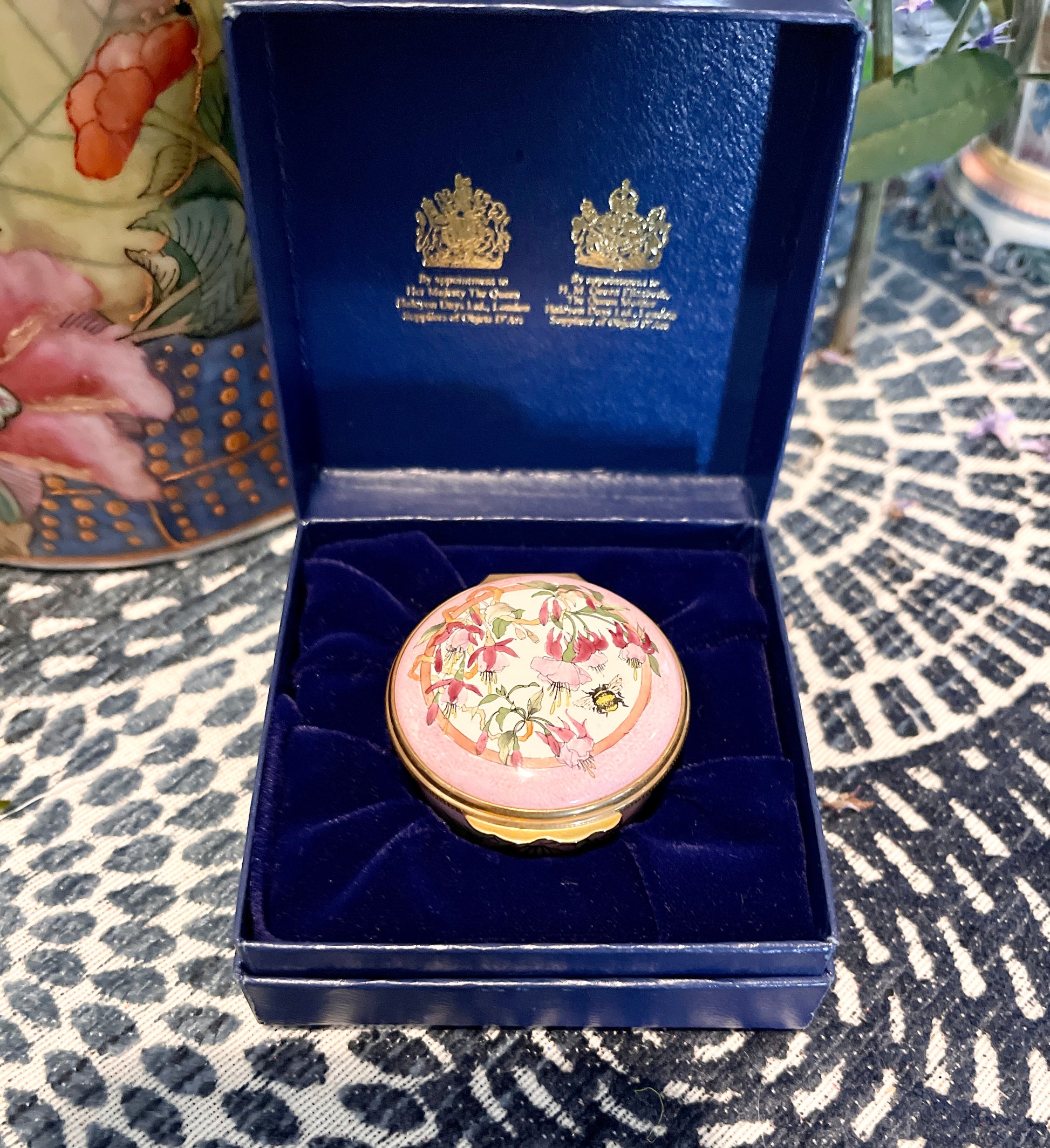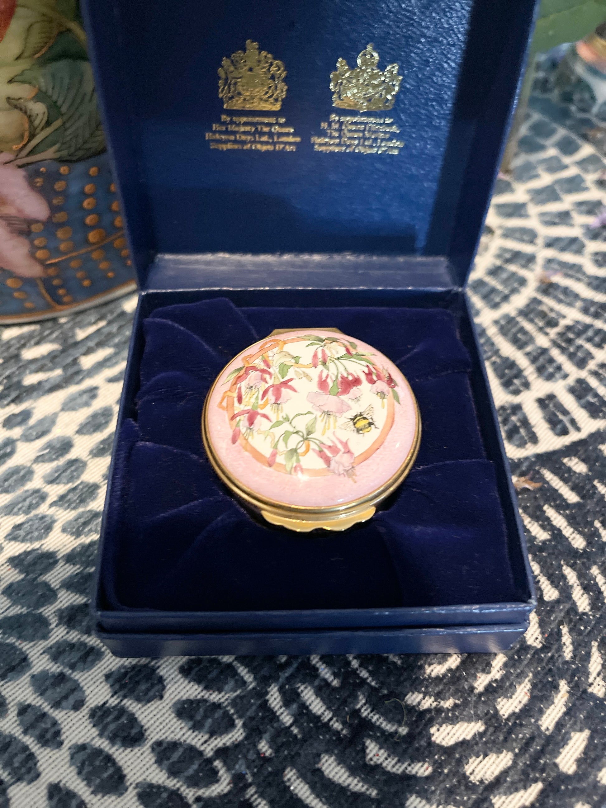 Halcyon Days Enamel Box with Pink Flowers, Viney Green Foliage and a Buzzing Bee, Made in England, Original Box