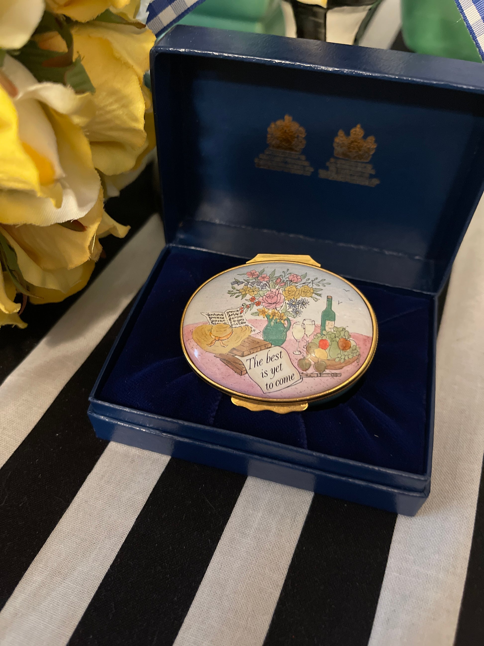 Halcyon Days Enamel Box featuring a lovely table with a note saying, The Best is Yet to Come, amongst a vase of flowers, a sun hat, two glasses, a bottle of wine, and a tray of fruit. It comes in the original box. 24 karat gold plated fittings. Such a charming heirloom piece!