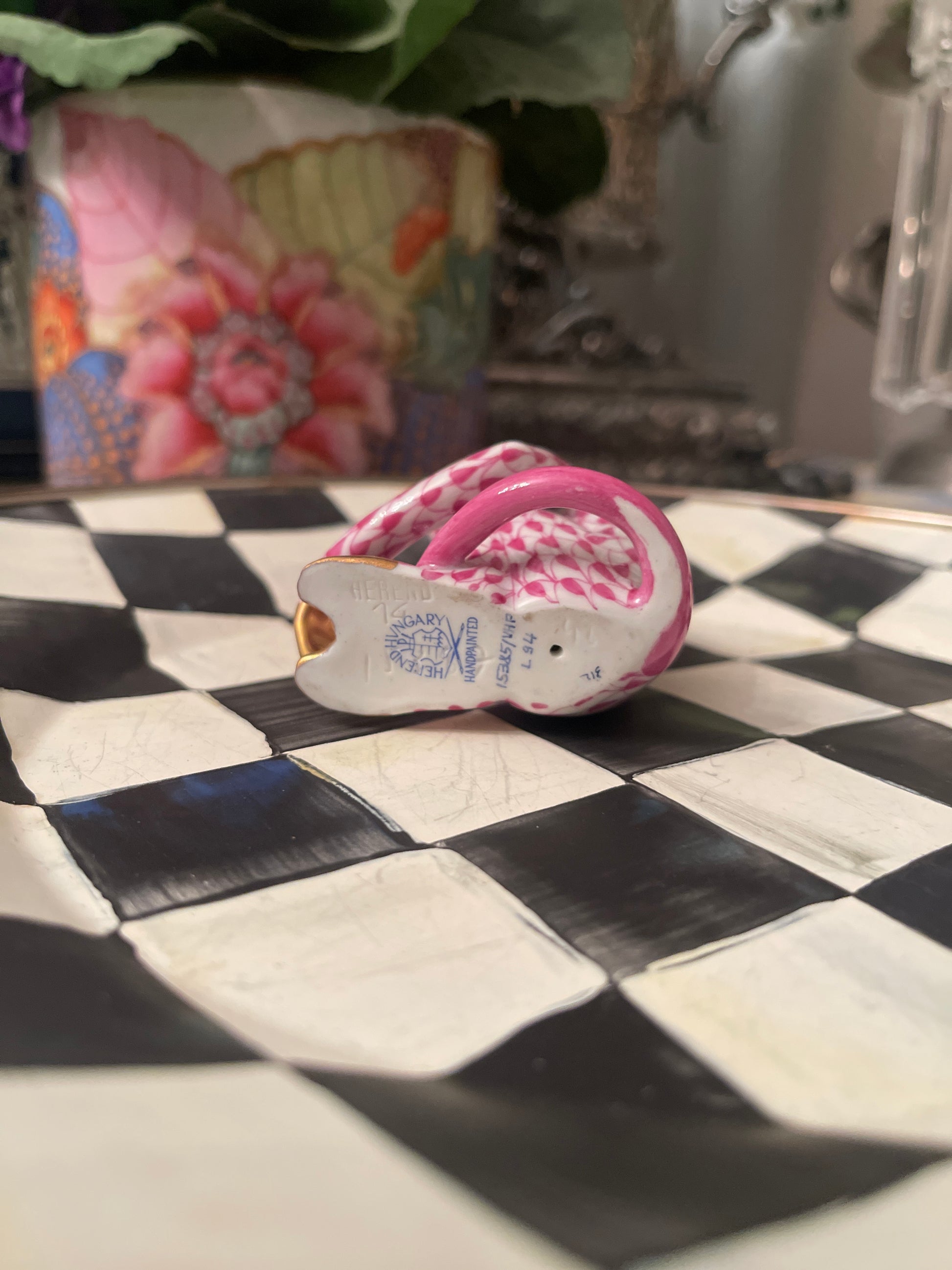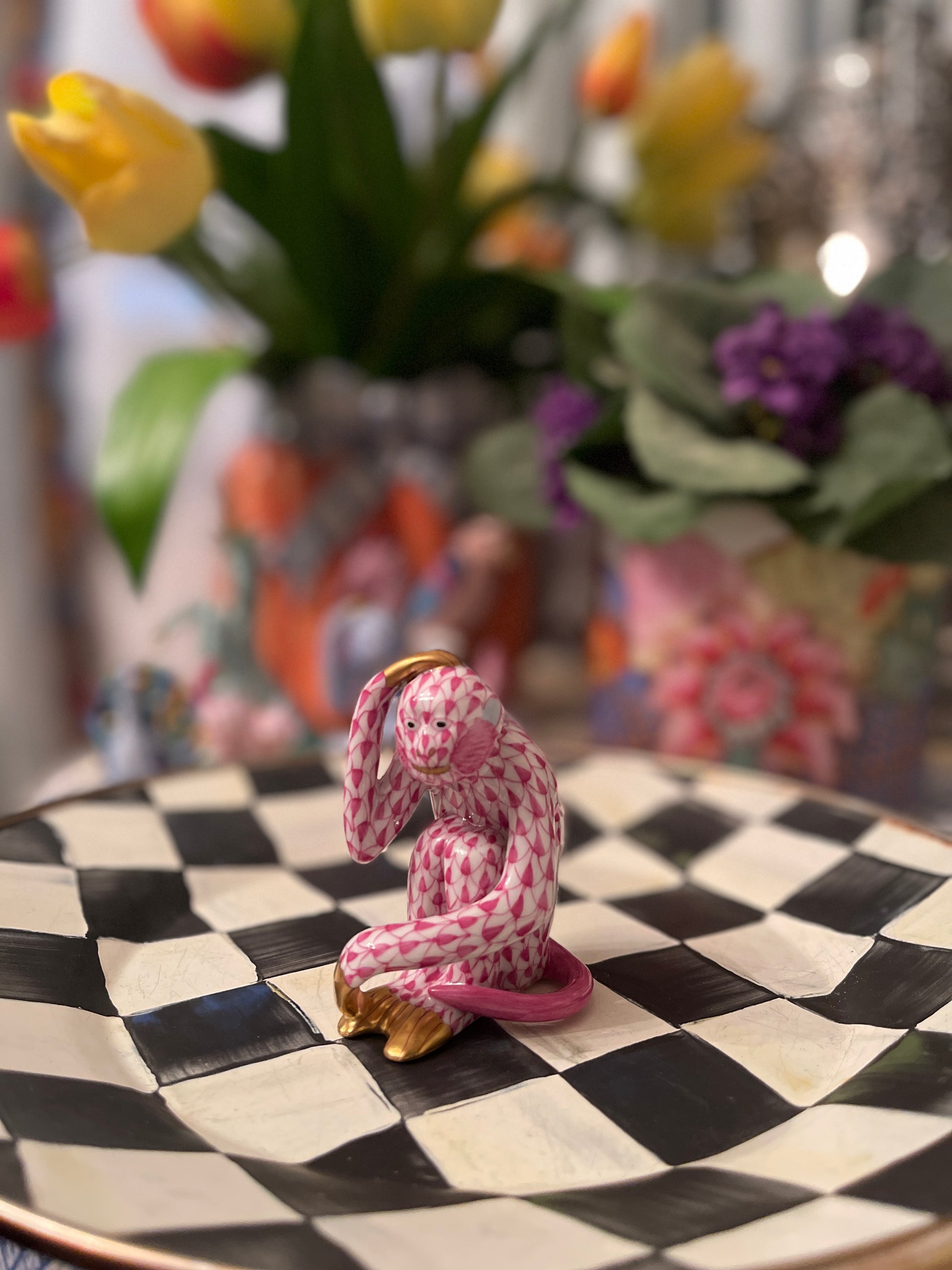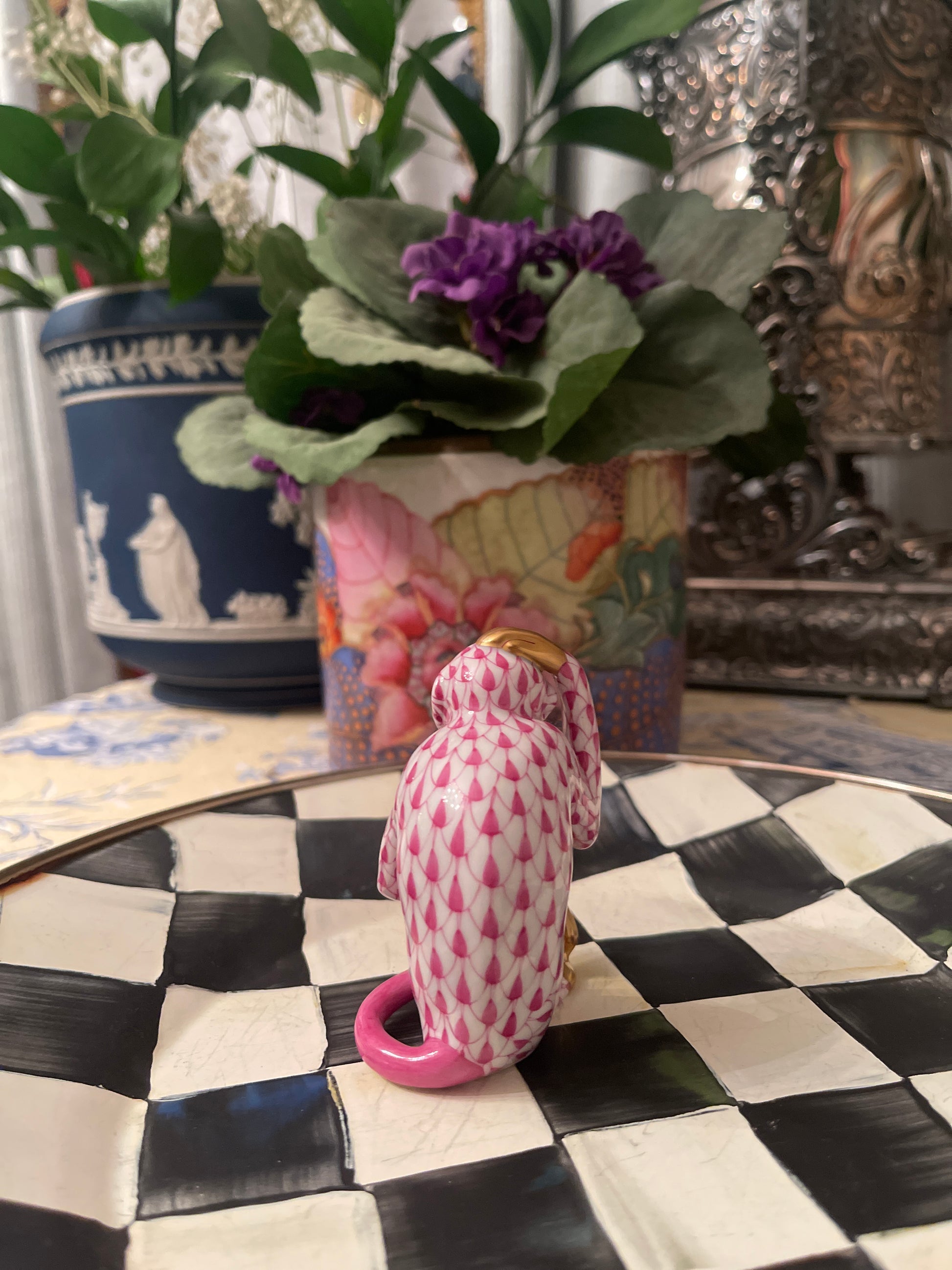 Fantastic Herend Scratching Monkey in raspberry fishnet with 24 kt gold accents. Wonderfully whimsical with so much hand painted detail. This is the first one I've found in the wild and am so smitten. It’s marked with the traditional Herend hallmark and is in lovely estate condition.