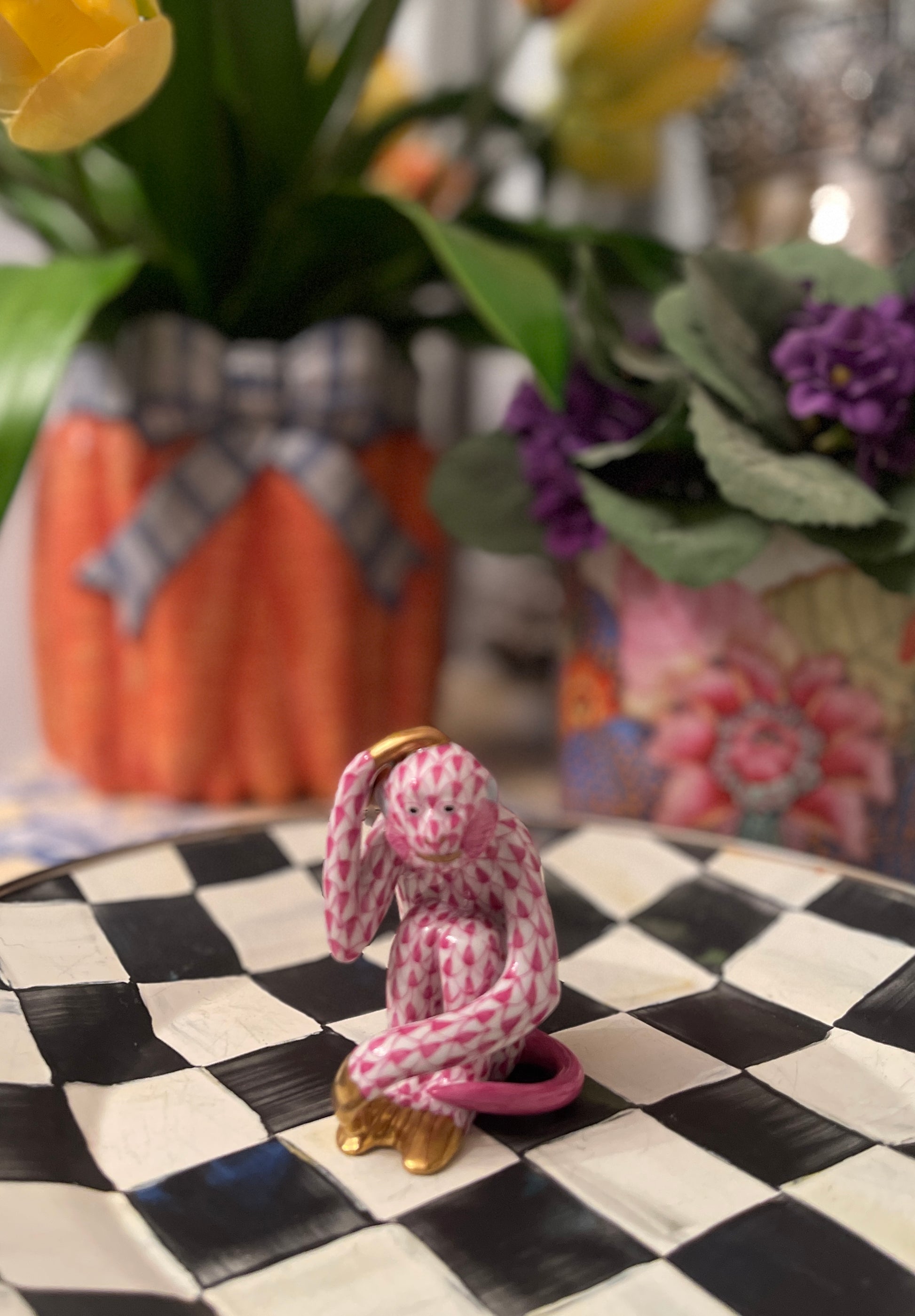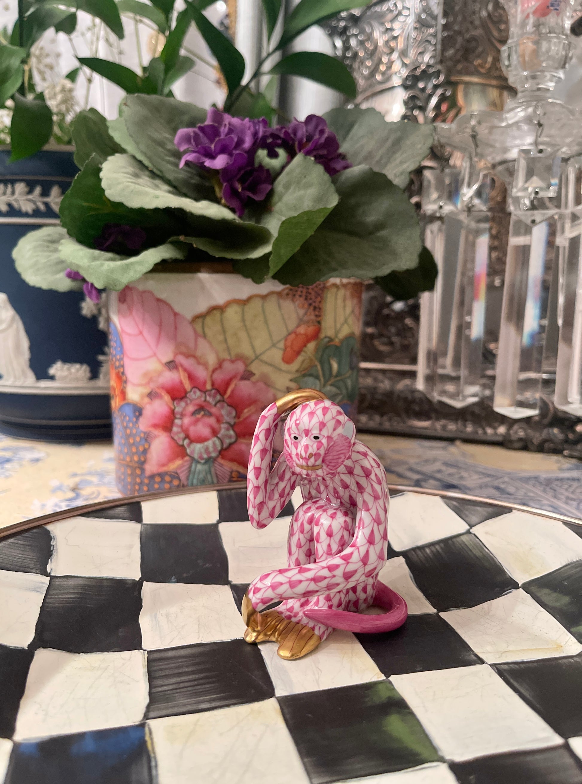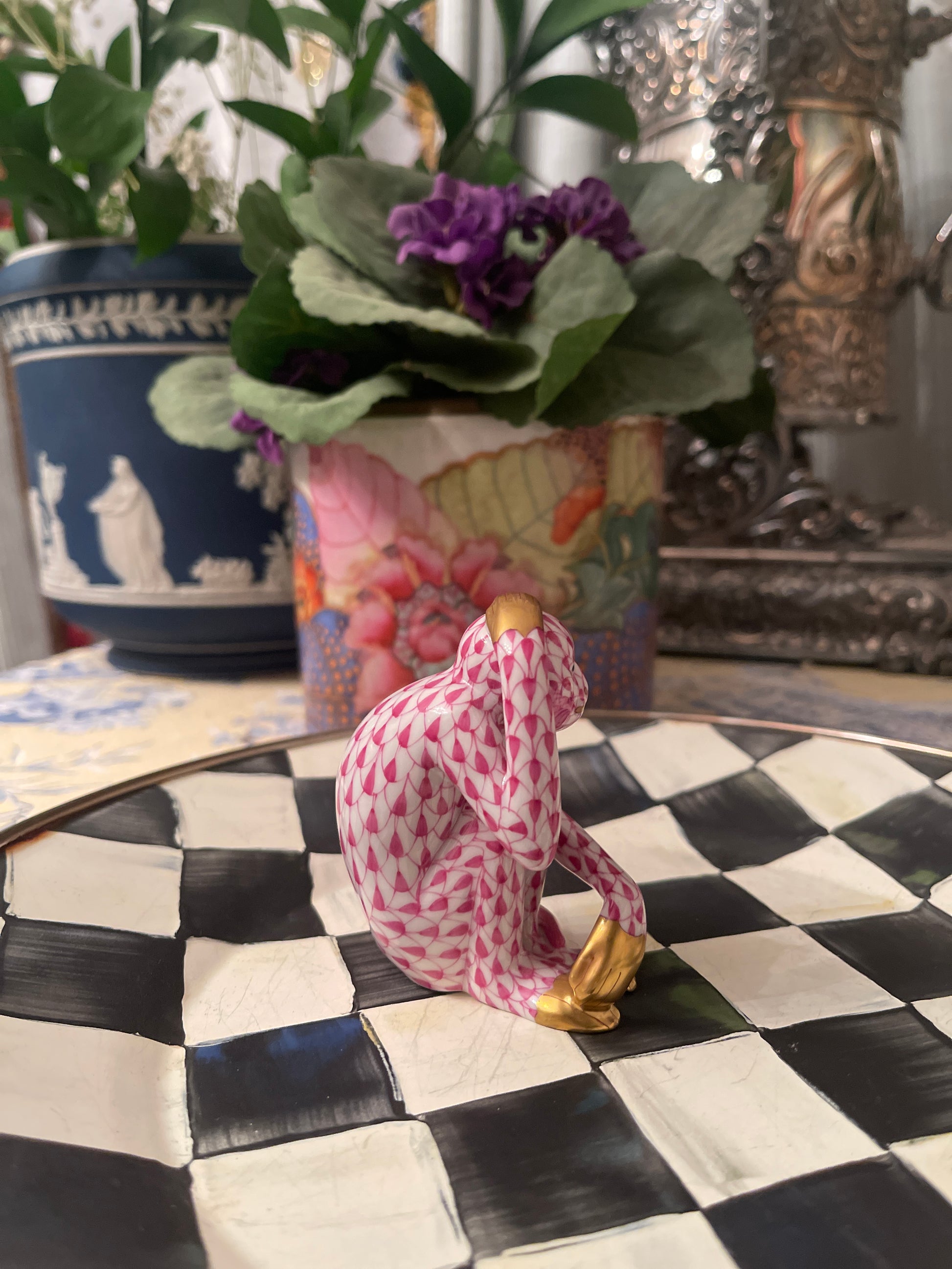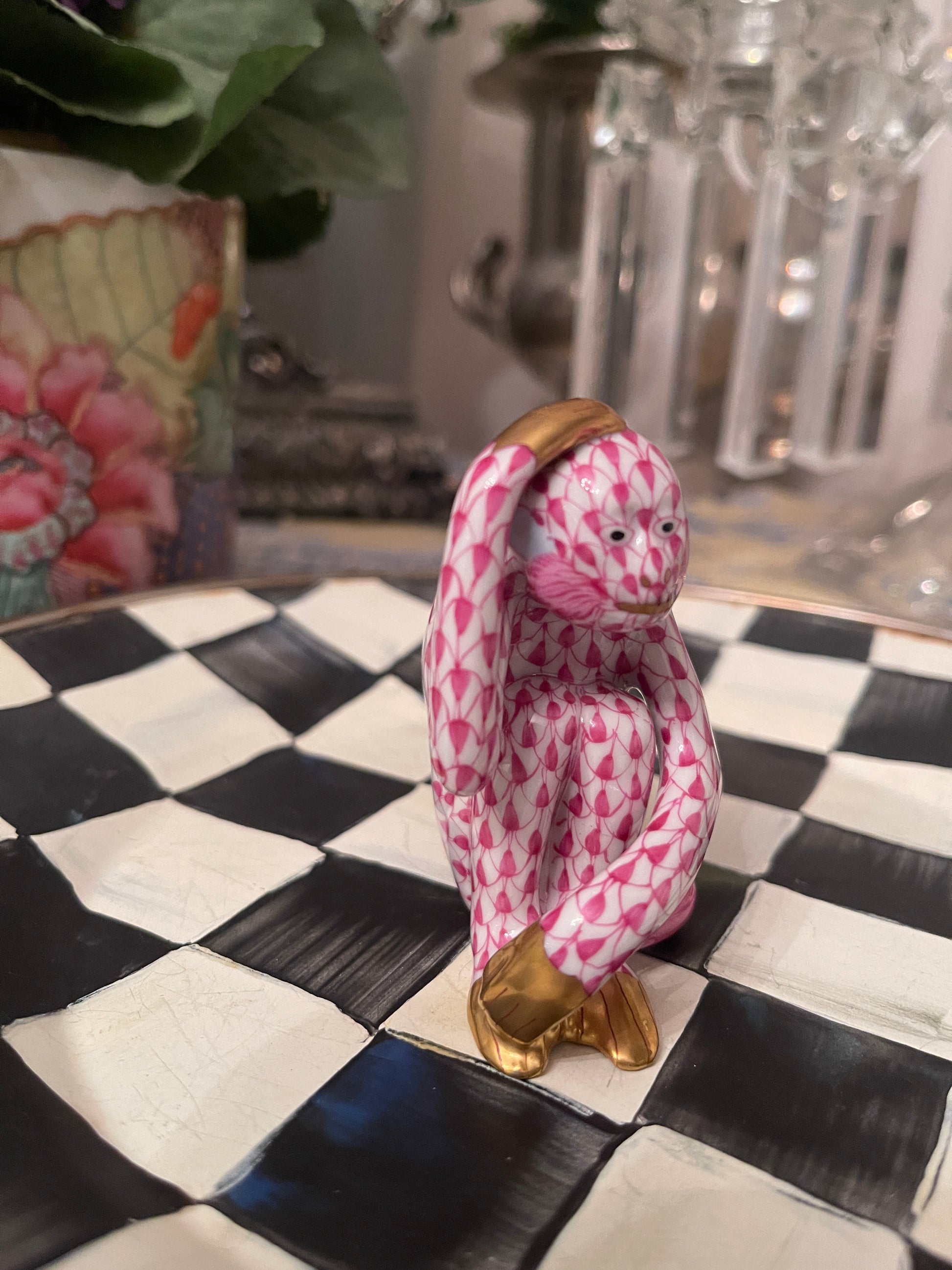 Herend Scratching Monkey In Raspberry Fishnet with 24 kt Gold Accents