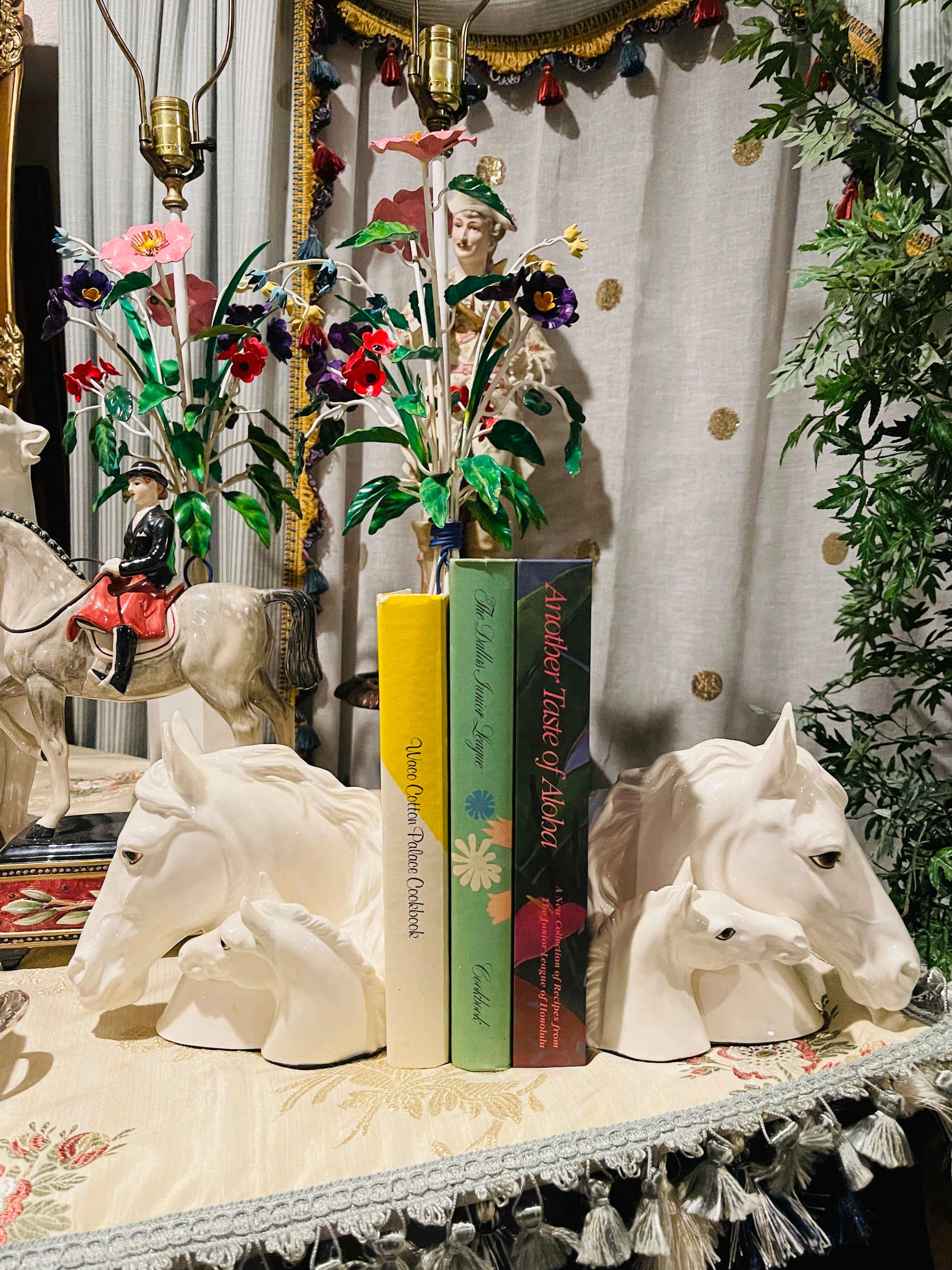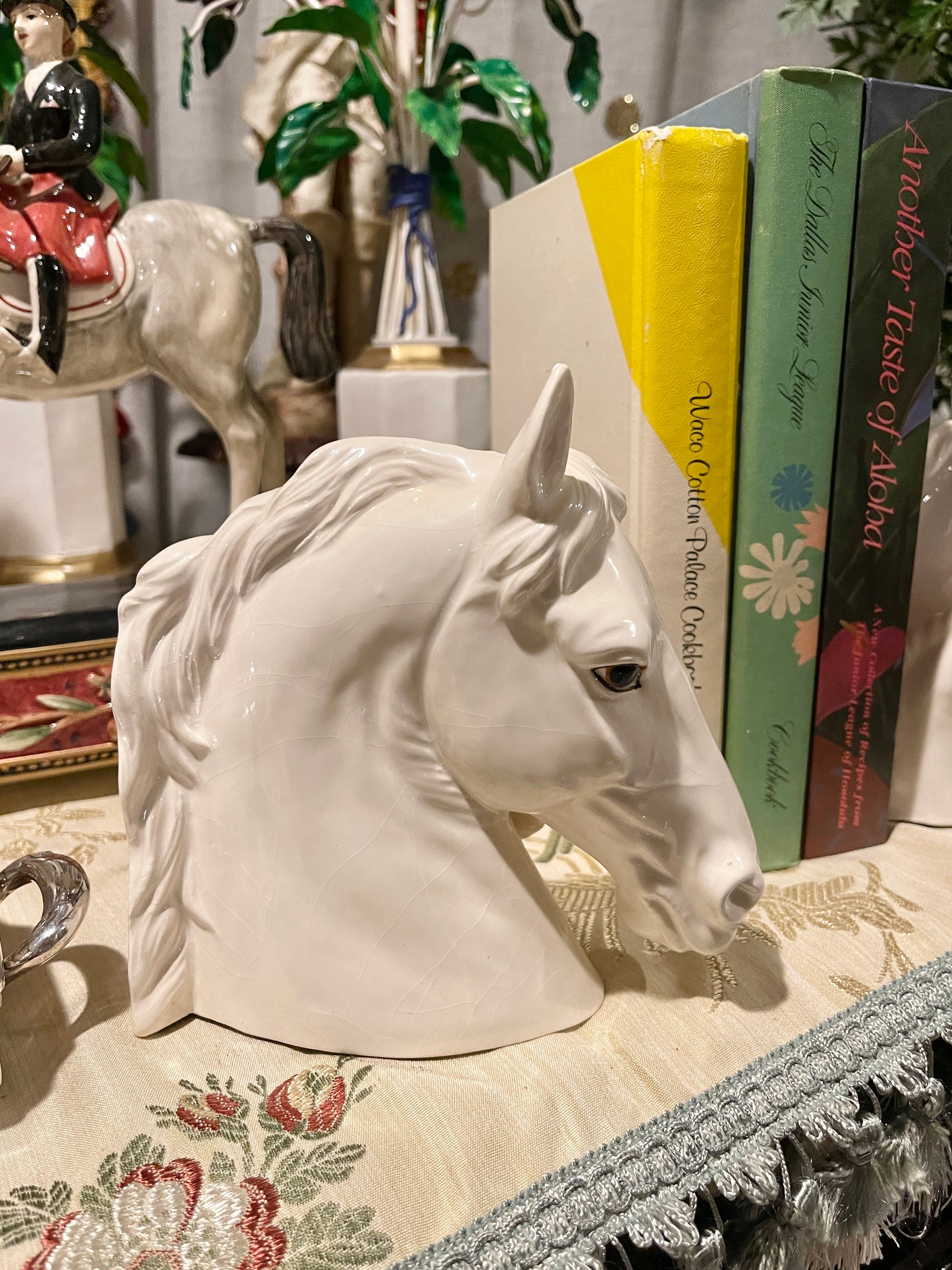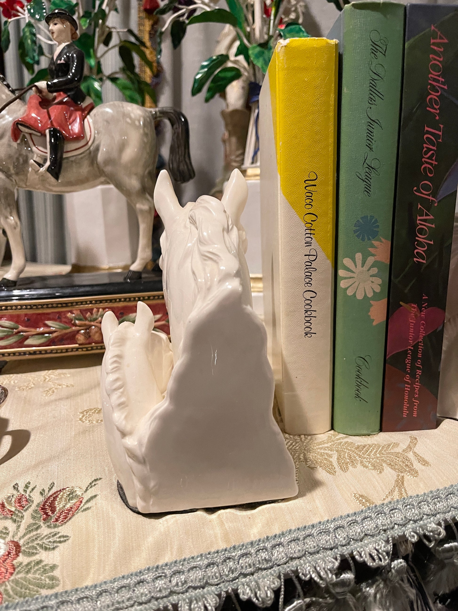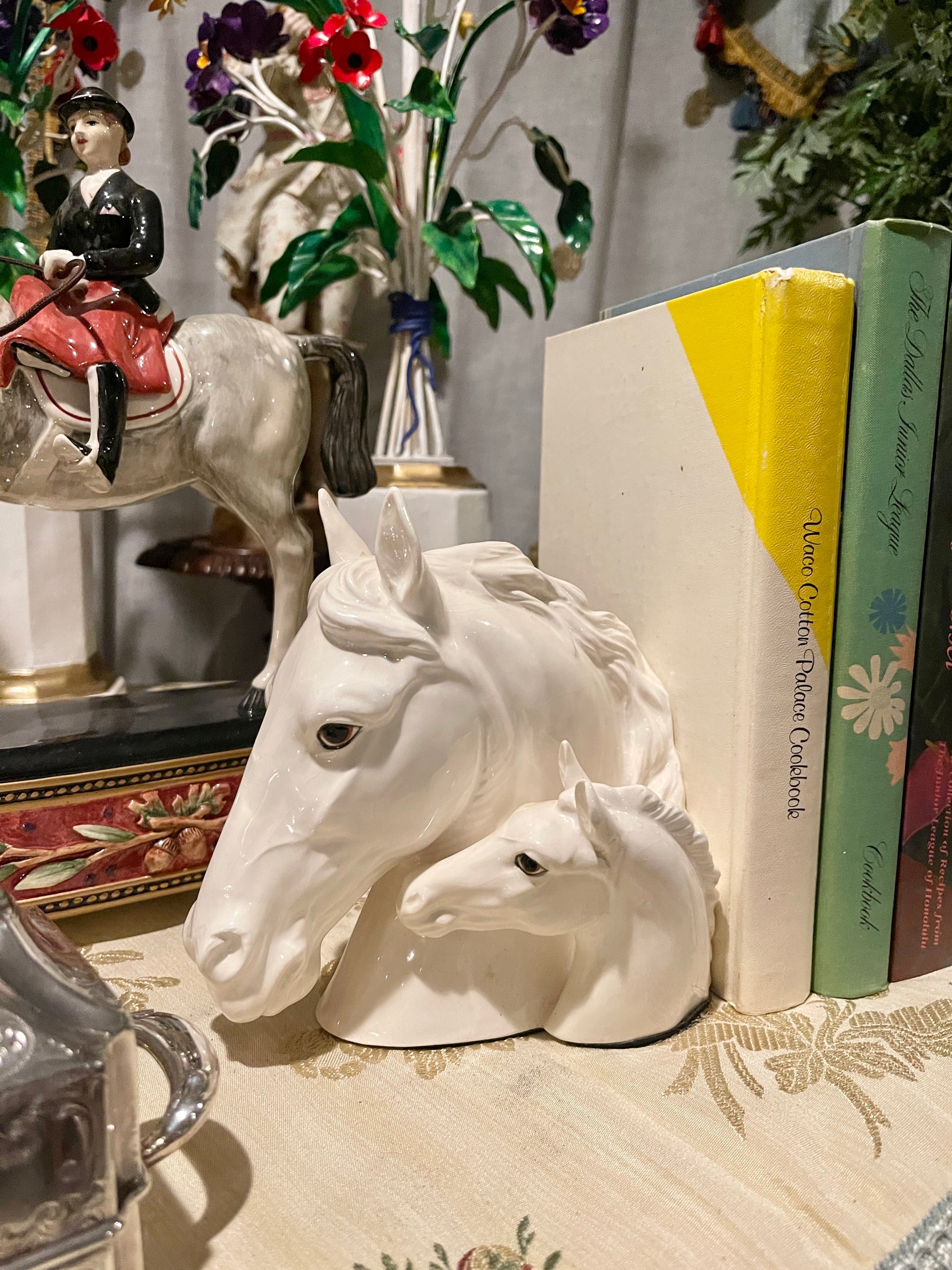 Lovely vintage pair of white ceramic mare and foal bust bookends. They are so beautifully detailed and the size is impressive… they actually could be used as stand alone sculptures. That's the great thing about investing in quality pieces… they often can be used year round by styling and using them in various ways.