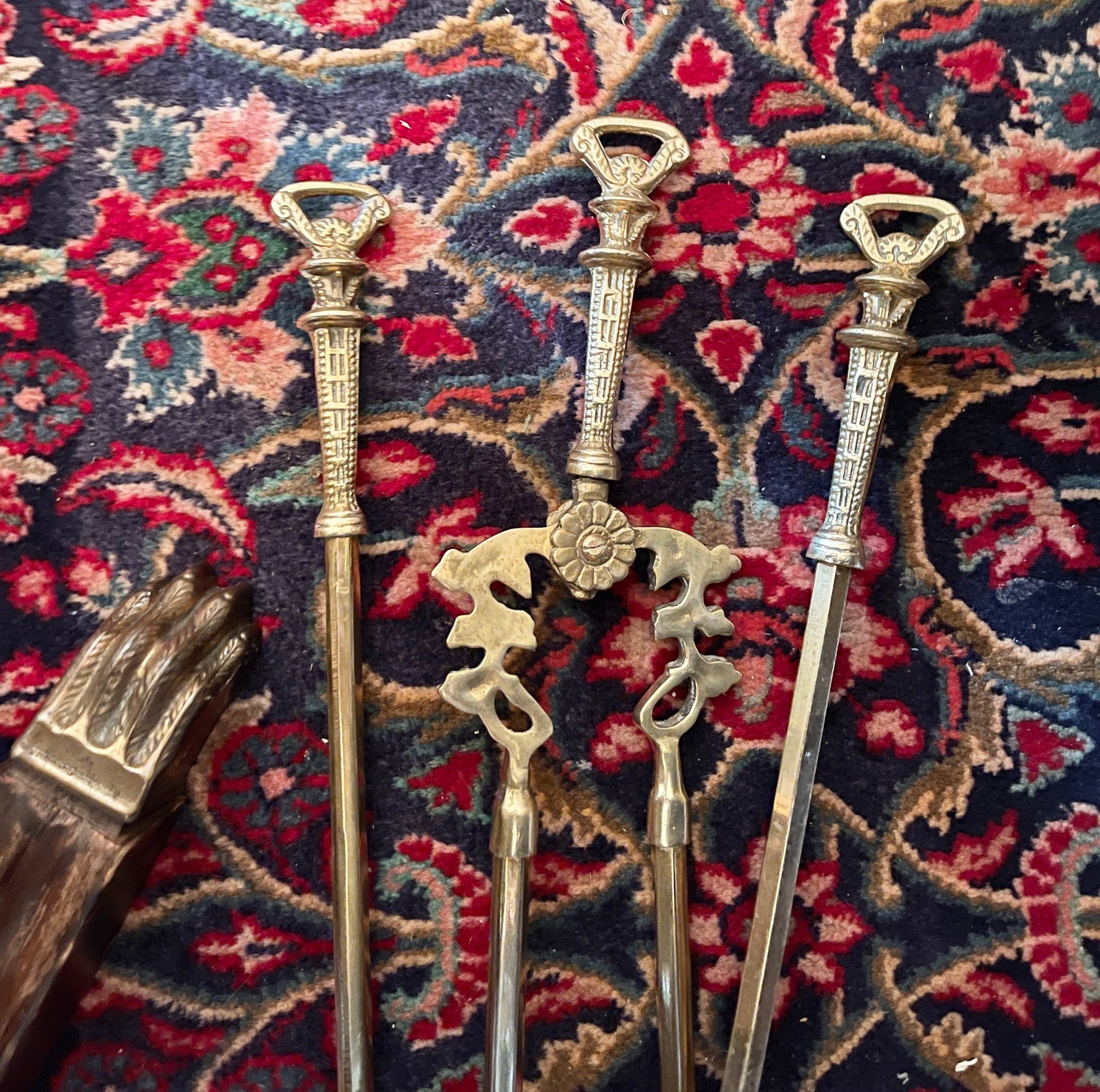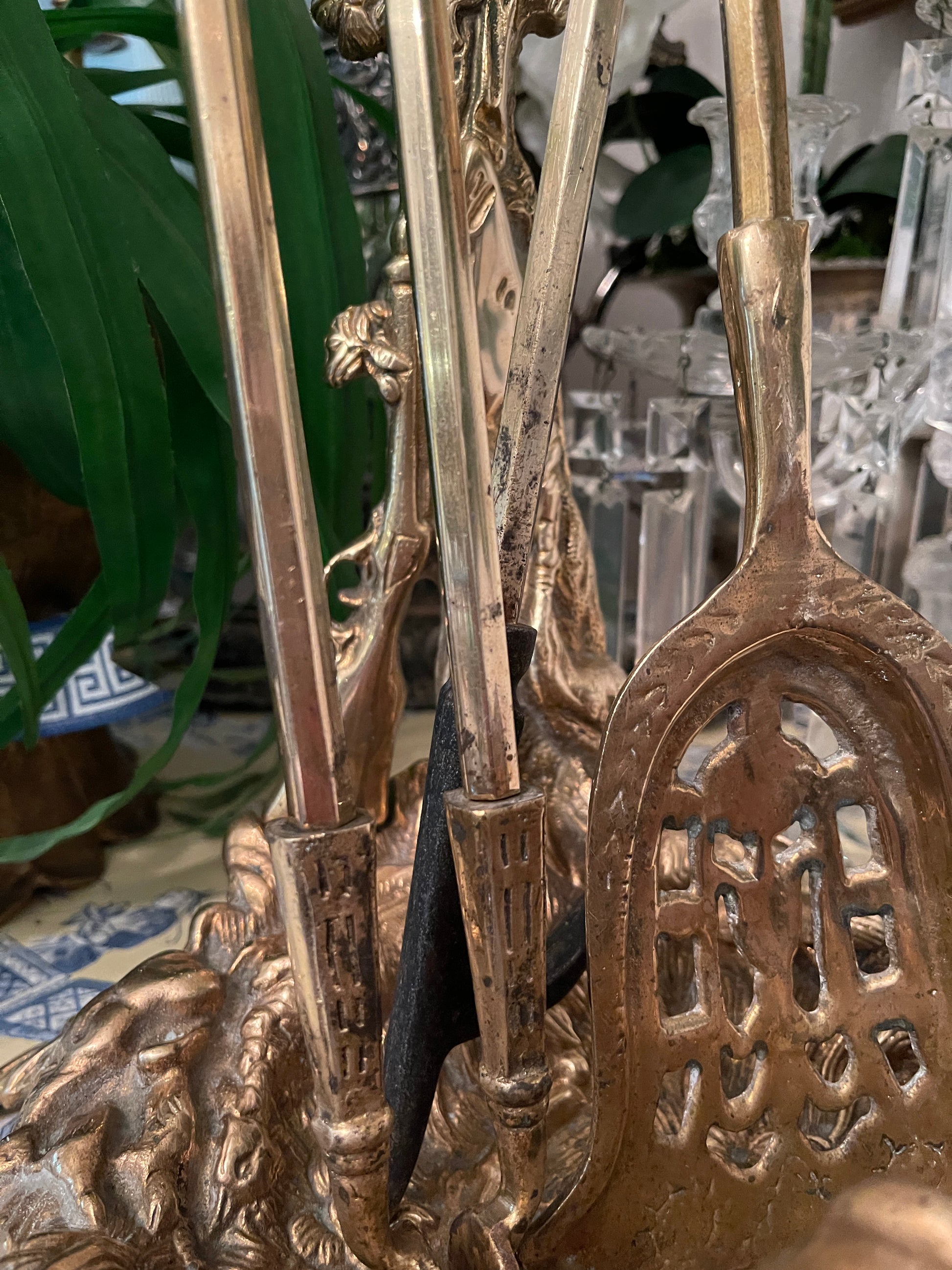 The set of three ornately engraved tools include a poker, scoop and pincher. The solid brass has retained its brilliance and is in good condition with patina in some areas from years of use.