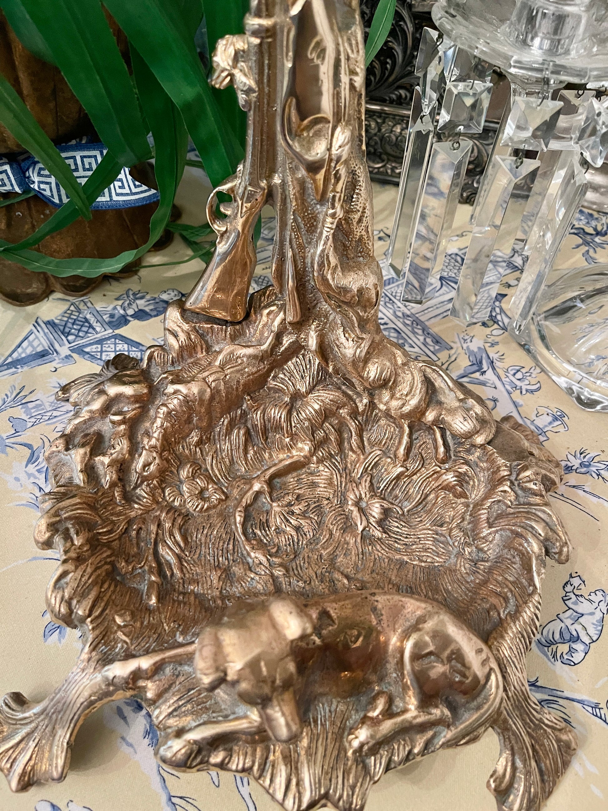 The intricate relief detail of this amazing set features a hound at the front of the base surrounded by winding acanthus, a hunting rifle and various game including a rabbit and pheasants with a horn wrapped in the tree branches.