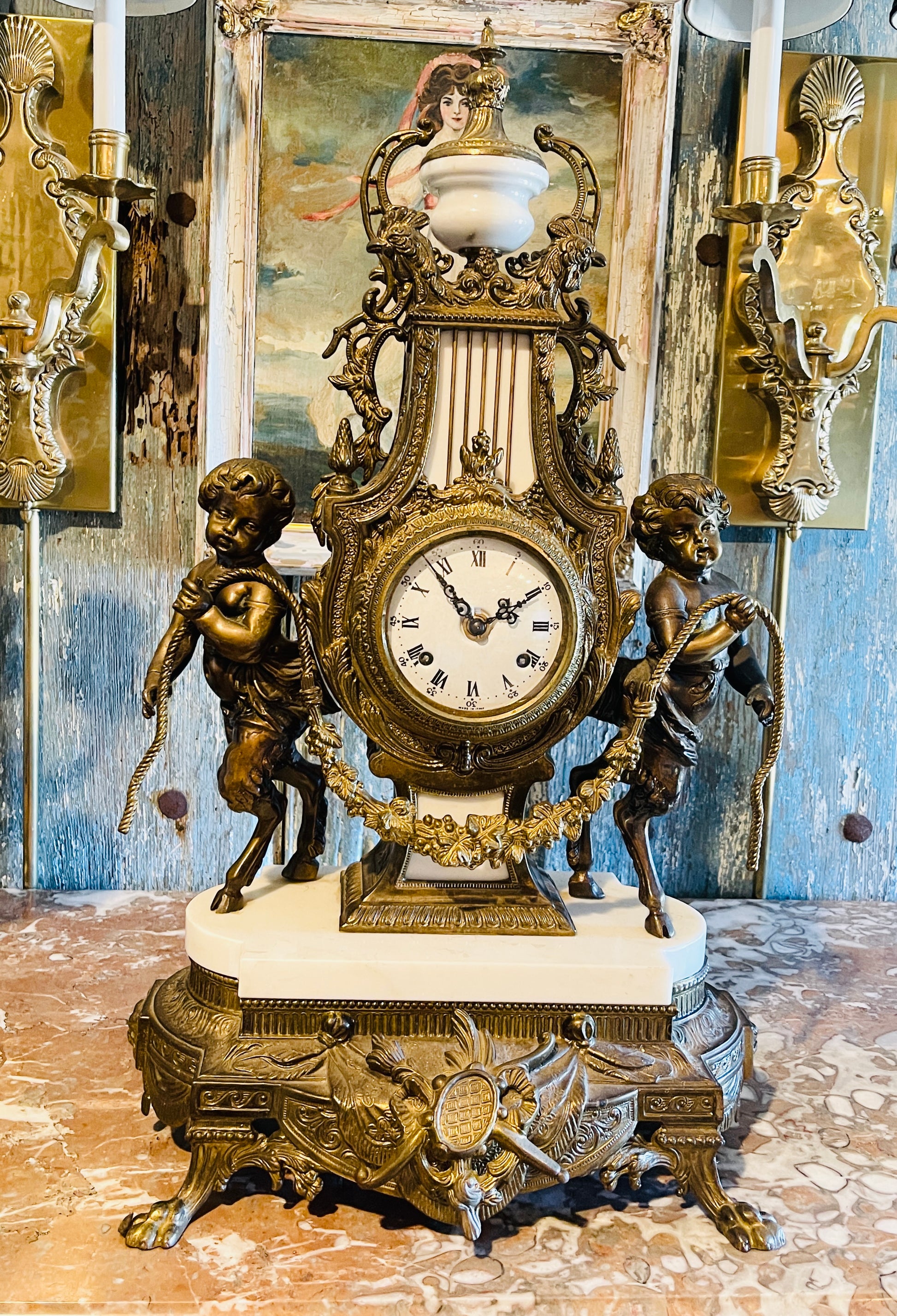 Italian antique clock, bronze cherub clock, neoclassical candelabra set, ormolu clock set, gilt bronze garniture, Italian marble mantel clock, 19th century Italian antiques, French Empire style décor, rococo revival, estate mantel décor, heirloom Italian décor, gilded age antiques, ornate clock set, Under the Copper Roof antiques